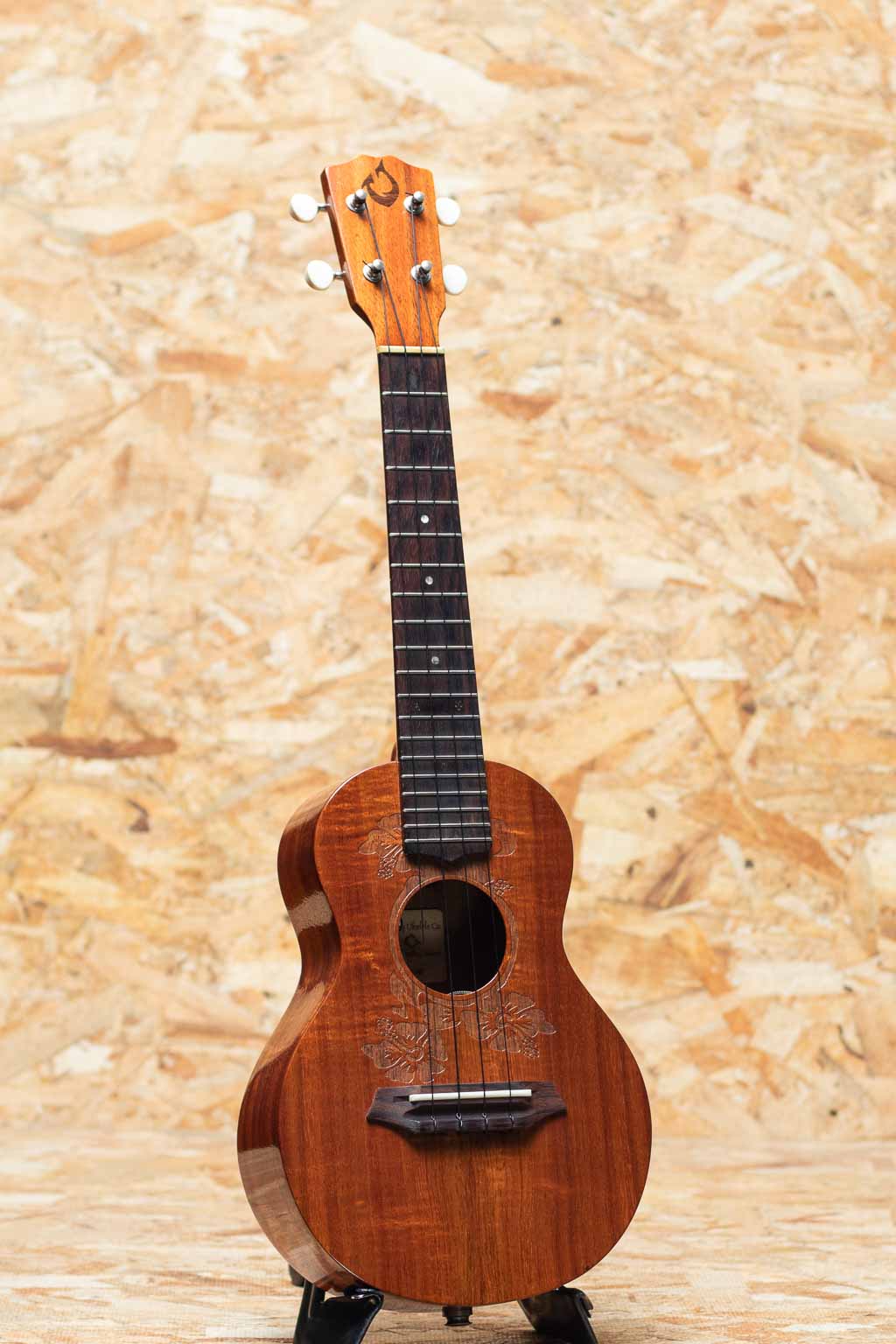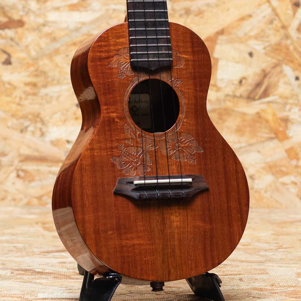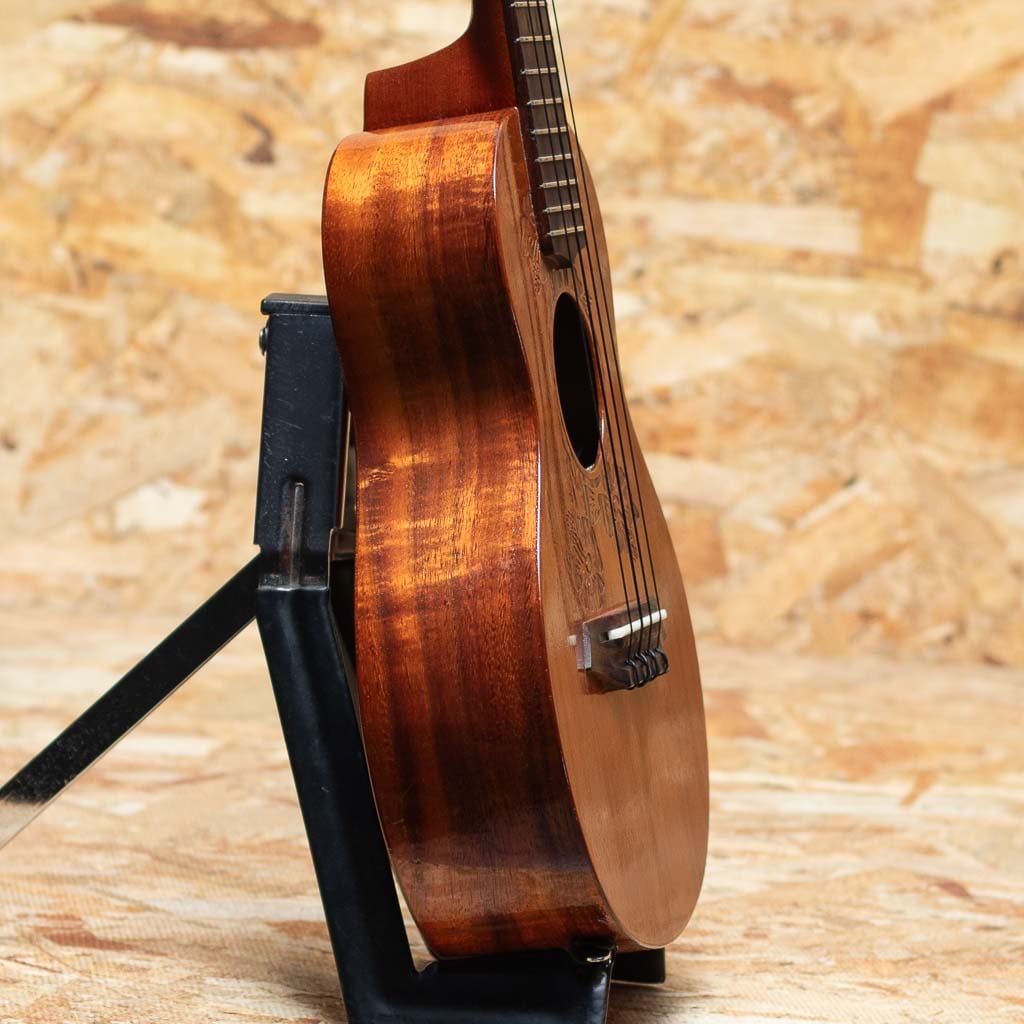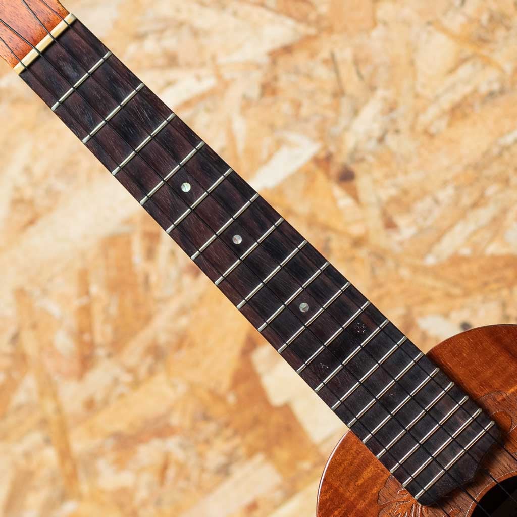 Gストリング社は1993年に設立されたメイド・イン・ハワイブランド。アーティストからの支持の高さなどからどんどん人気を呼び、ハワイアンウクレレの代表的なブランドどとしてプロを始め幅広い方々に愛用されています。一時は製作をされておらず、流通が激減してしまいましたが、製作を再開し再度注目を集めてきております。本器はハイビスカスデザインのレーザー加工が施されたコンサートモデルのUSED品。ハワイアンコアボディ、マホガニーネック、ローズウッド指板&ブリッジ、ドット指板インレイ。後付にてL.R.BaggsのElement VTCピックアップを搭載しており、ステージ等でもご使用いただけます。指板の12、15フレット部分に印を付けていた痕が残っております。演奏面の使用感は見られますが、傷などは少なく比較的きれいな状態です。ハイビスカスのデザインが目を引くおしゃれでルックスも良い1本です。汎用ハードケース付属です。