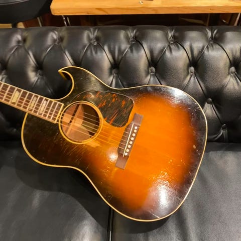 1950年に産声を上げた"CF-100"、LG2と同じ14 1/8ワイドボディーでフローレンタインカッタウェイ、1958年までの8年間のみ短い期間しか製造されなかったモデルで現在もギブソンヴィンテージアコースティックファンから高い人気を誇ります。本器は1950年代初期に製作されたVintage品。55年より施工される20フレット搭載以前の個体です。スプルーストップ、マホガニーサイド&バック、マホガニーネック、ハカランダ指板&ブリッジ、クルーソンペグ、ベッコウセルピックガード、フローレンカッタウェイ、スキャロップブレイシング、ロングサドル仕様、ヘッドクラウンインレイ。ペグとピックガードは交換されています。独特のデザインと製作本数が少ないこともあり、オールドギブソン市場において希少価値の高いモデルのひとつです。見た目以上にファットで、弾けるようなレスポンスの良さとつま弾いた時の独特の甘さ、ノスタルジックな音色は他の機種には求められません。トップローワーバウトのエッジに2箇所、6弦側指板エンドからサウンドホールにかけて1箇所、バック中央部に1箇所のクラック補修、バック面とネックヒールの接合部にチップ補修、バインディングの補修跡がございます。年代相応の傷や使用感などはあるものの、オリジナル塗装を維持しており、これぞヴィンテージと言いたくなる貫禄のある外観と圧巻のサウンド。プレイコンディションも理想的です。カッタウェイギターらしくハイフレットまでストレスなく押さえられます。ヴィンテージギブソンの中でも独自の立ち位置を確立したこちらのモデル。ぜひご検討くださいませ。汎用ハードケースが付属しています。