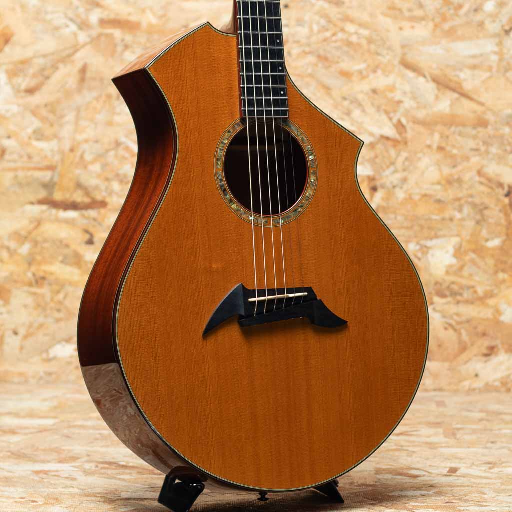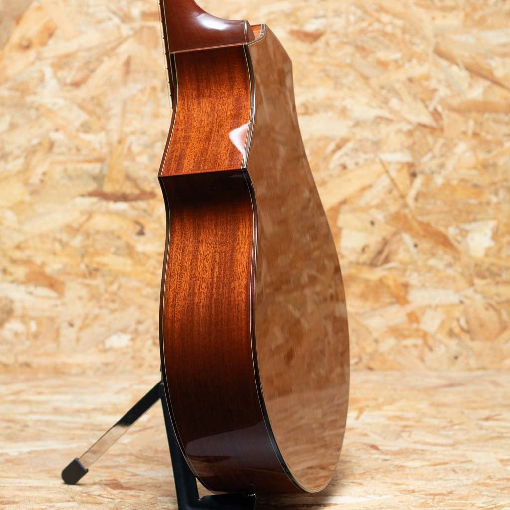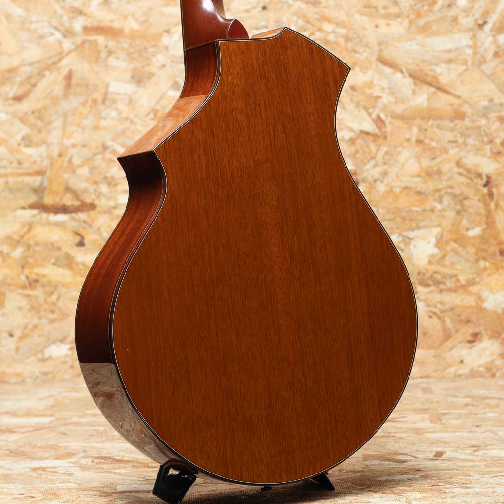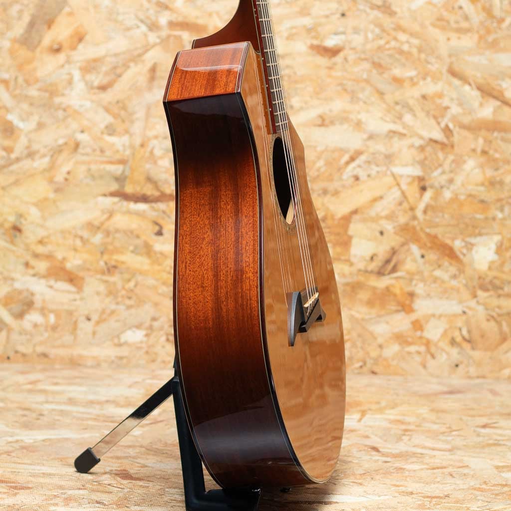 米オレゴン州の自社ファクトリーにて製造されるブランド"breedlove(ブリードラブ)"。かつてテイラー社に在籍した経歴を持つ”ラリー・ブリードラブ氏”により1990年創業、以来その独創的なデザインと個性的な音色で人気を博しグラミー賞受賞のエドガーハードをはじめ、国内外問わず多くのアーティストに愛用されているアメリカンブランドです。本器は左右非対称な独特なオリジナルボディシェイプを持つCM (Concert Meyer)モデルの"CM/MH"USED品。2000年代前半頃の物と思われます。スプルーストップ、マホガニーサイド&バック、マホガニーネック、エボニー指板&ブリッジ。優れたサステインとバランス、クリアなサウンドを実現する"ブリードラブ・ブリッジ・トラス。六弦側から一弦側にかけて表板の厚みを徐々に増していき、高音弦側と低音弦側のエネルギーのバランスをとることにより、クリアでクリーンな高音と、よく響く安定した低音の絶妙なブレンドを実現する加工"グラデュエーテッド・トップ"など、レベルの高いプレイにも余裕で応える上質のギターを作るための独自の機構がこのモデルには盛り込まれています。少し小ぶりながらも豊かさのある低音でレスポンスよく、バランスの取れたサウンド。ダウンチューニングやフィンガースタイルなどでも使えそうな印象です。部分的な傷や打痕は見られますが過度な使用感は見られず全体的にきれいなコンディションが保たれています。初期の頃から採用されている当時の代表的なボディシェイプのCMモデル。オリジナルハードケース付属です。