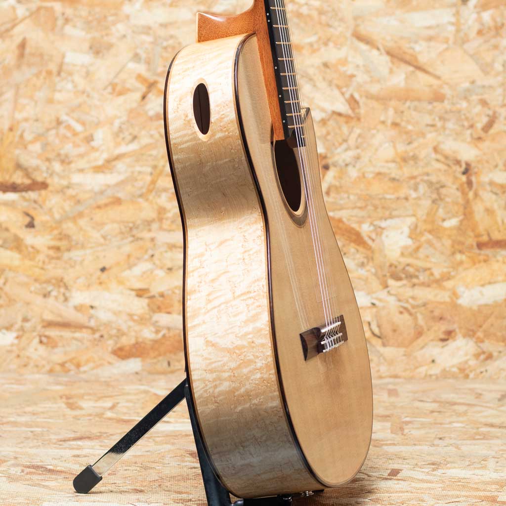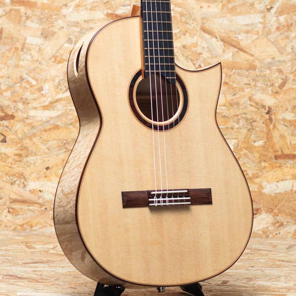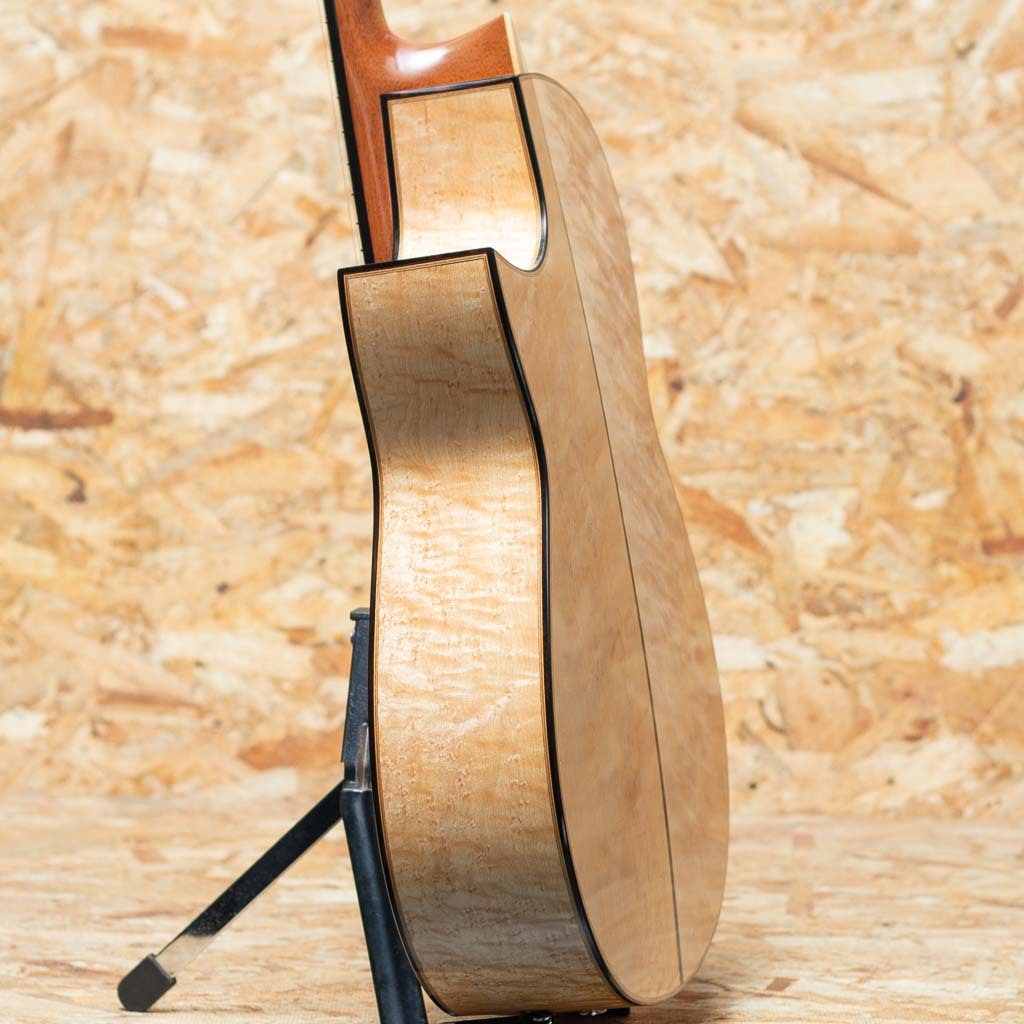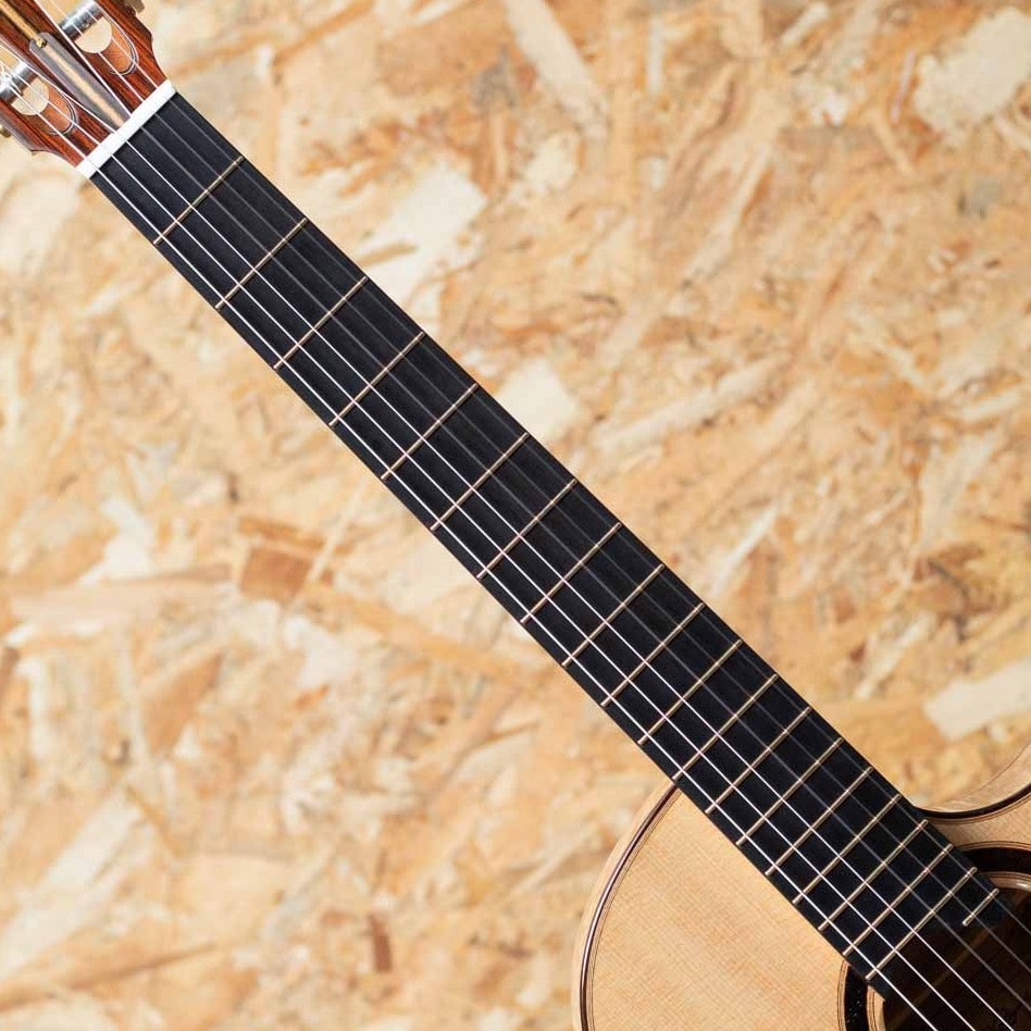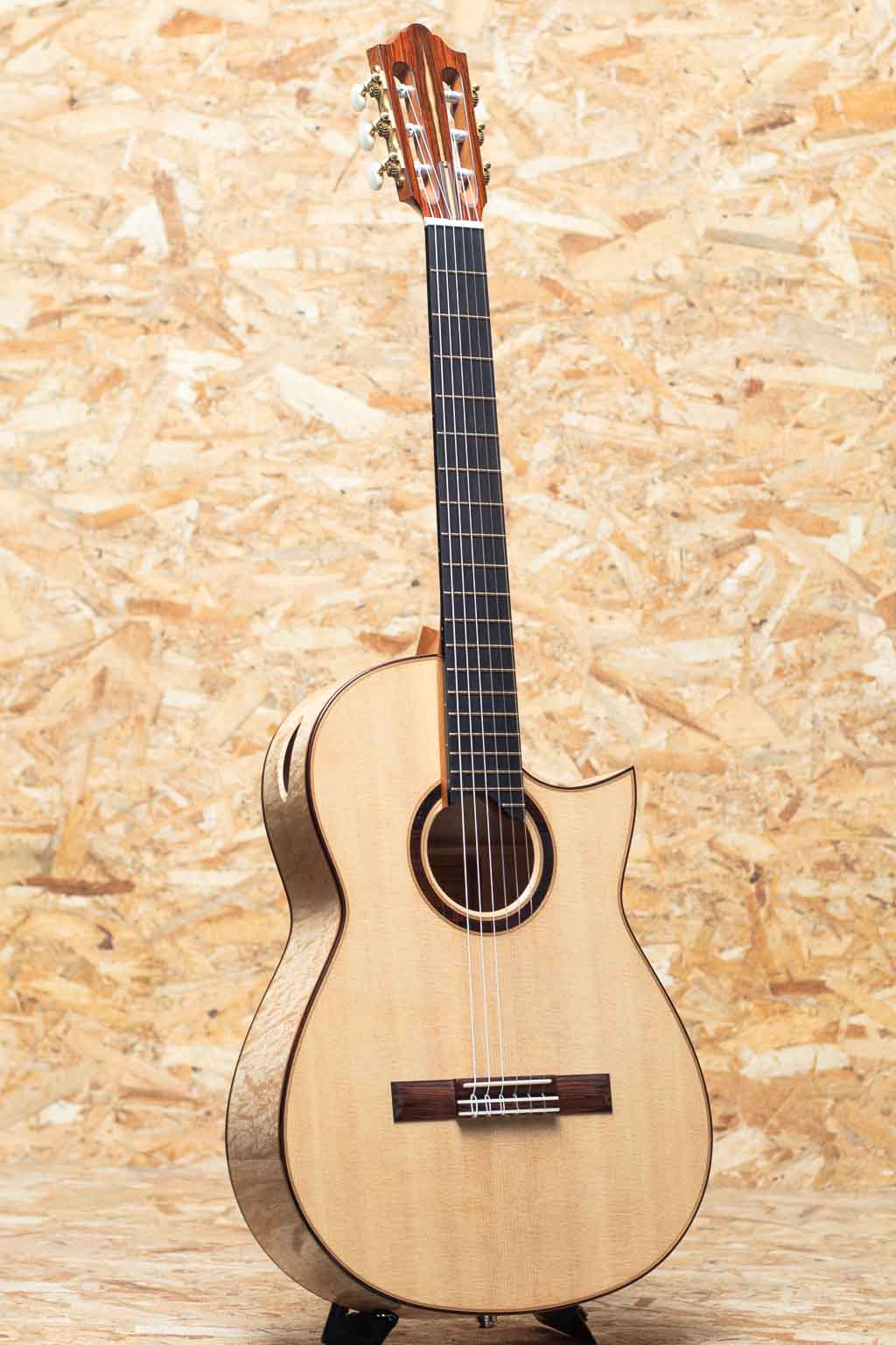 神奈川相模原にてルシアー"小林良輔"により製作される"Ryosuke Kobayashi Guitars"。数々の著名な作家を輩出しているアメリカのロバート・ベン・スクールでギター製作の基礎を学び、"杉田健司"(スギクラフト)に師事。後にカナダのルシアー、サーゲ・デ・ヤングの工房にてさらに技を磨き上げ、独立。楽器の音色へのこだわりはもちろんのこと、緻密かつ優れた木工技術とアート性の高いデザイン力も持ち合わせており、国内外の他のルシアーからも高い評価を得ています。本器はクラシックのみならず、ジャズやボサノヴァなどあらゆるジャンルで使用される事を念頭にデザインされたナイロン・クロスオーバーモデル”Nylon Crossover RF”。弊社三木楽器株式会社の創立200周年を迎えるにあたり、フラットトップモデル、ナイロン弦クロスオーバーモデル、クラシックモデルの3本を特別モデルとしてオーダーさせていただき完成した記念モデルの一本です。ルッツスプルーストップ、バーズアイメイプルサイド&バック、マホガニーネック、エボニー指板、CSAローズウッドブリッジ、ゴトー510ゴールドペグ、CSAローズウッドロゼッタインレイ、エキゾチックエボニーバインディング、ゴールドエボフレット、セラック塗装。また、オプションであるレイズドフィンガーボード、サイドサウンドポート、カッタウェイの3つの仕様に加え、Carlos VIP DM ピックアップの搭載、クロスオーバーモデルへの搭載は初となるトラスロッド仕様とが同時に盛り込まれたスペシャルな個体です。鉄弦アコースティックギターやエレキギターユーザーの方にも快適に演奏していただけるように製作がなされるクロスオーバータイプのモデルですが、伝統的なファンブレーシングを基軸に設計がされており、クセのない非常に素直な撥音。ウッディな温かみを感じる音色と上澄みのようなクリアさを併せ持った音像をお楽しみ頂けます。レイズドフィンガーボードの搭載により音量やサスティーン、遠達性も向上。かつよりシビアで追い込んだフレッティングがなされており、全ポジションで均一なレスポンスで応えてくれます。出音から減衰までのバランスが非常に秀逸でジャズなどのモダンな演奏にも向いている所以がここにあります。多くの知識と高い技術、そして豊富なキャリアから充実期を迎える"小林良輔"。アメリカ、カナダ、そして日本と、3カ国でギター造りを学んだ氏ならではの広い視点の1本。そのこだわりと情熱を、是非お手元でお確かめください。