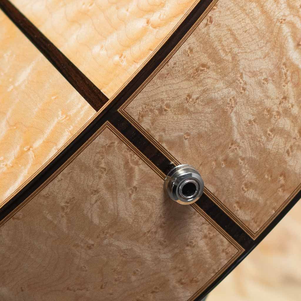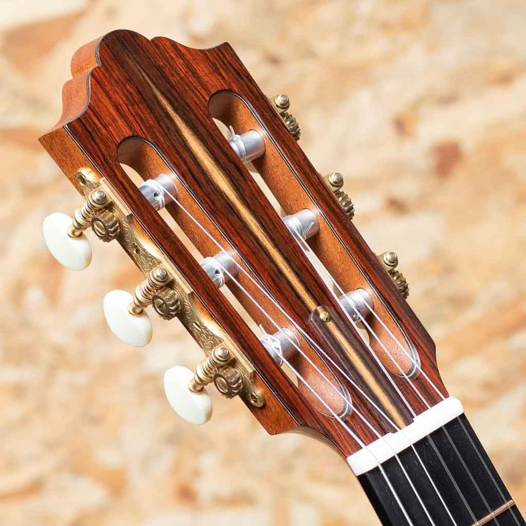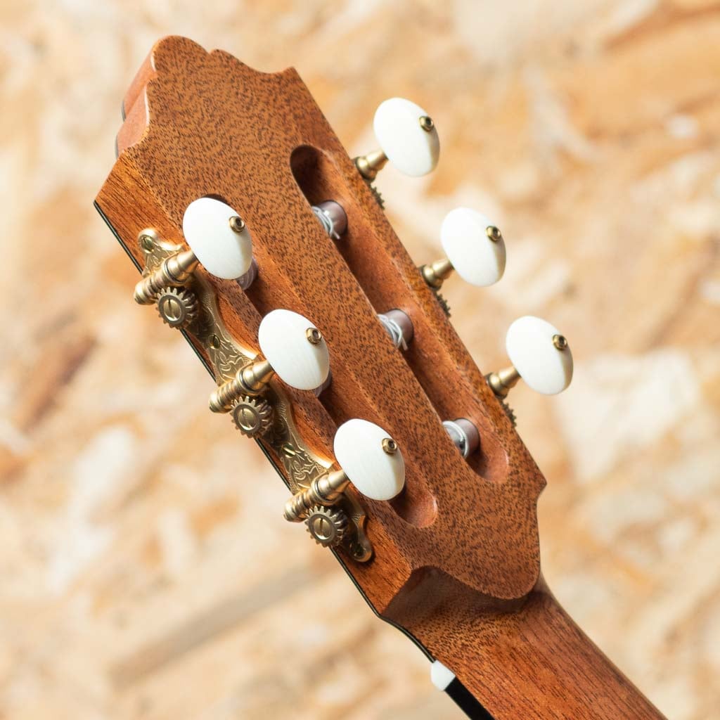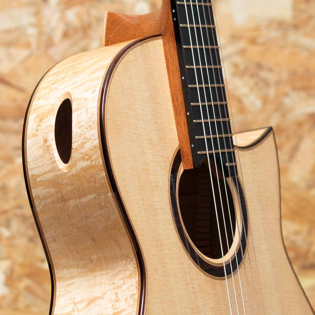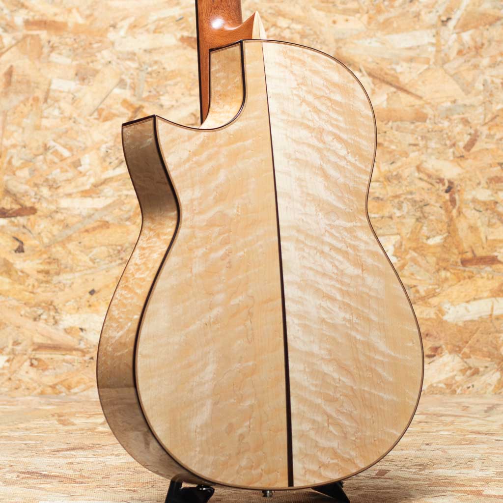 神奈川相模原にてルシアー"小林良輔"により製作される"Ryosuke Kobayashi Guitars"。数々の著名な作家を輩出しているアメリカのロバート・ベン・スクールでギター製作の基礎を学び、"杉田健司"(スギクラフト)に師事。後にカナダのルシアー、サーゲ・デ・ヤングの工房にてさらに技を磨き上げ、独立。楽器の音色へのこだわりはもちろんのこと、緻密かつ優れた木工技術とアート性の高いデザイン力も持ち合わせており、国内外の他のルシアーからも高い評価を得ています。本器はクラシックのみならず、ジャズやボサノヴァなどあらゆるジャンルで使用される事を念頭にデザインされたナイロン・クロスオーバーモデル”Nylon Crossover RF”。弊社三木楽器株式会社の創立200周年を迎えるにあたり、フラットトップモデル、ナイロン弦クロスオーバーモデル、クラシックモデルの3本を特別モデルとしてオーダーさせていただき完成した記念モデルの一本です。ルッツスプルーストップ、バーズアイメイプルサイド&バック、マホガニーネック、エボニー指板、CSAローズウッドブリッジ、ゴトー510ゴールドペグ、CSAローズウッドロゼッタインレイ、エキゾチックエボニーバインディング、ゴールドエボフレット、セラック塗装。また、オプションであるレイズドフィンガーボード、サイドサウンドポート、カッタウェイの3つの仕様に加え、Carlos VIP DM ピックアップの搭載、クロスオーバーモデルへの搭載は初となるトラスロッド仕様とが同時に盛り込まれたスペシャルな個体です。鉄弦アコースティックギターやエレキギターユーザーの方にも快適に演奏していただけるように製作がなされるクロスオーバータイプのモデルですが、伝統的なファンブレーシングを基軸に設計がされており、クセのない非常に素直な撥音。ウッディな温かみを感じる音色と上澄みのようなクリアさを併せ持った音像をお楽しみ頂けます。レイズドフィンガーボードの搭載により音量やサスティーン、遠達性も向上。かつよりシビアで追い込んだフレッティングがなされており、全ポジションで均一なレスポンスで応えてくれます。出音から減衰までのバランスが非常に秀逸でジャズなどのモダンな演奏にも向いている所以がここにあります。多くの知識と高い技術、そして豊富なキャリアから充実期を迎える"小林良輔"。アメリカ、カナダ、そして日本と、3カ国でギター造りを学んだ氏ならではの広い視点の1本。そのこだわりと情熱を、是非お手元でお確かめください。