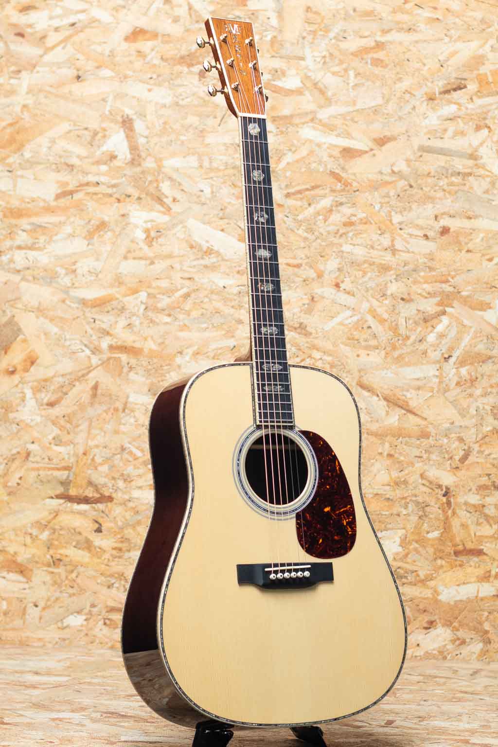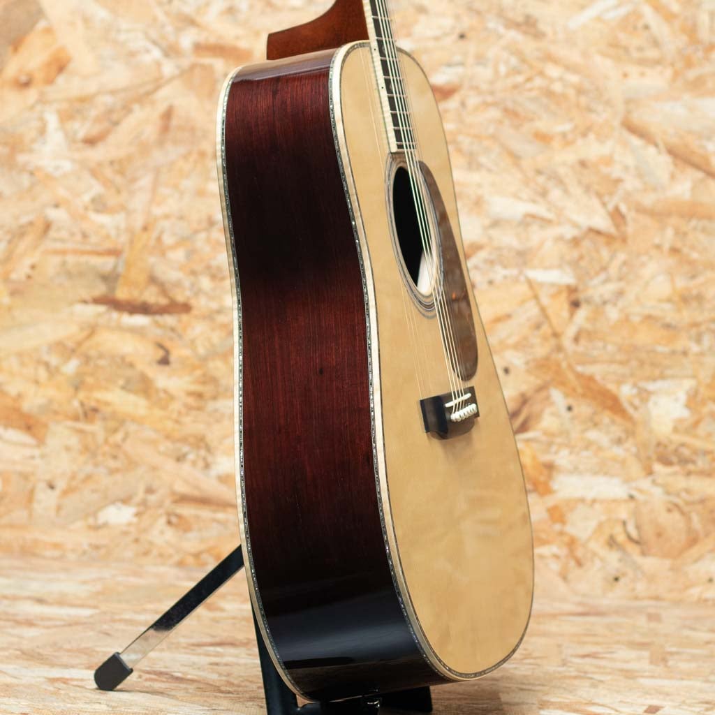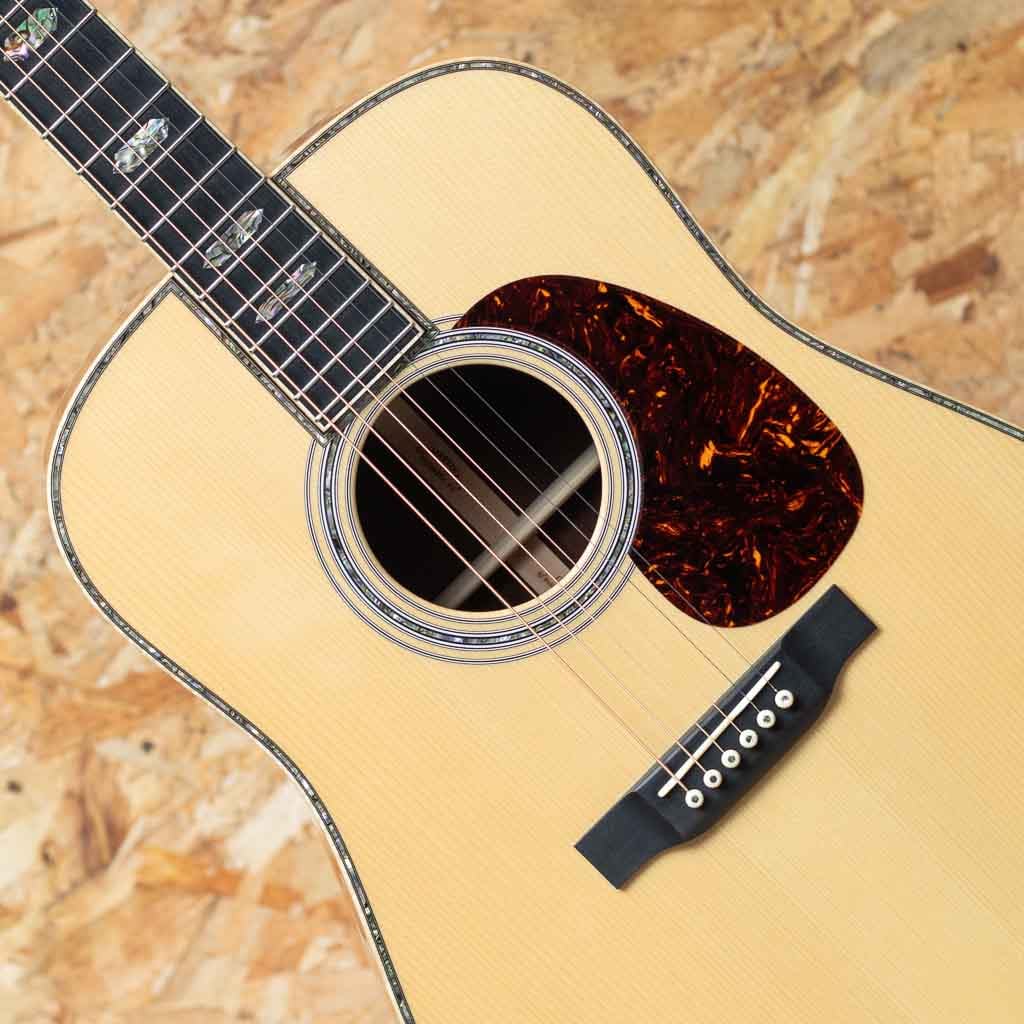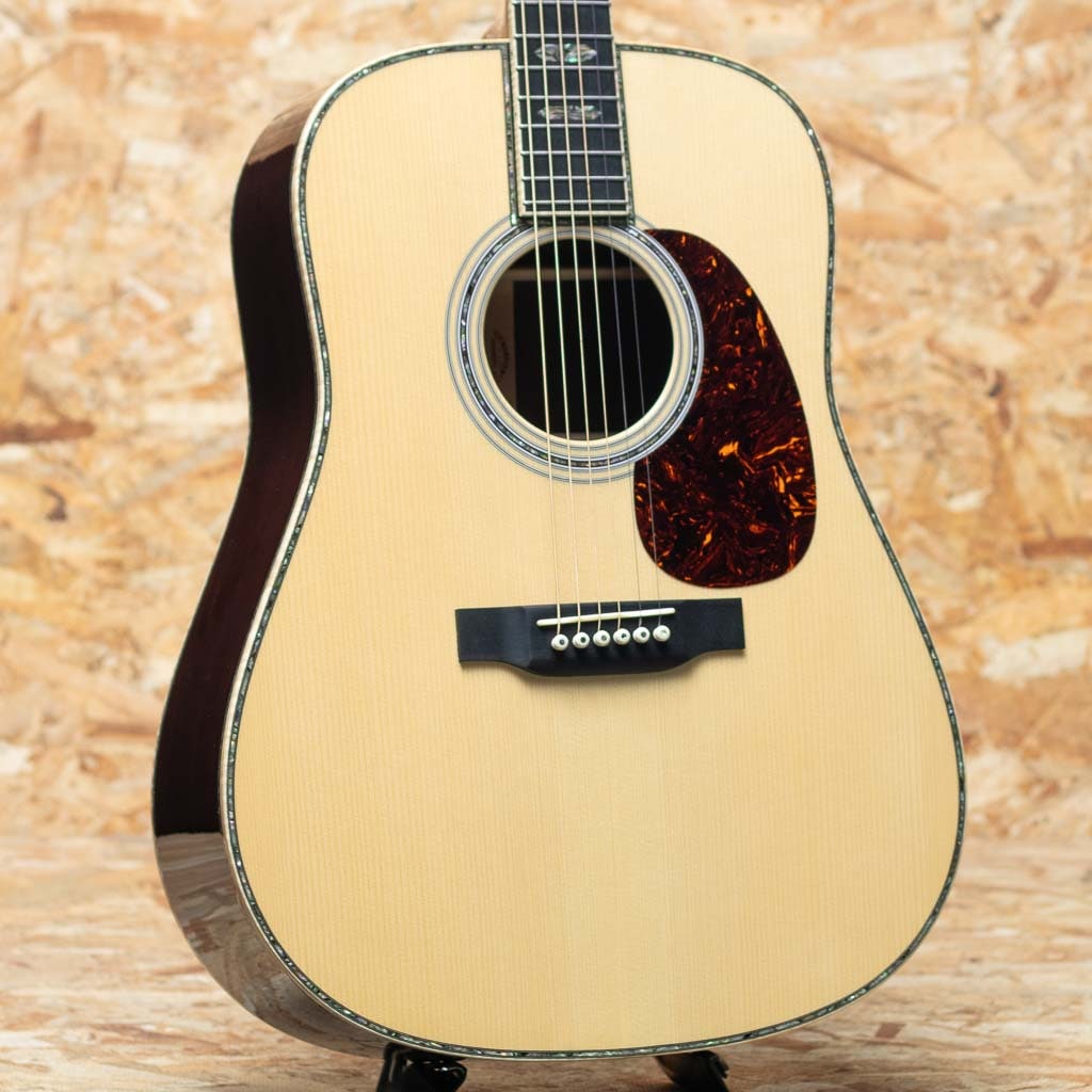 世界に一つだけのカスタムモデル!マーティンカスタムショップ製ギターとはマーティンファクトリー内のほんの一郭にて少数精鋭の熟練職人により手掛けられる超一級ギターのこと。オーセンティックシリーズや、特注品、一点モノのギターなどの生産がそれに当たります。本器はマーチン最高峰モデル"D-45"をベースにカスタマイズされた2018年製のカスタムモデル。プレミアムグレードのアディロンダックスプルーストップ、マダガスカルローズウッドサイド&バック、マホガニーネック、エボニー指板&ブリッジ、ヘキサゴン指板インレイ、シャーラー製ゴールドオープンバックペグ、縦ロゴヘッドインレイ、メイプルバインディング、べっ甲柄ピックガード、アディロンダックスプルース材のフォワードシフトスキャロップドブレーシング採用。モディファイドローオーバルプロファイルのハイパフォーマンステーパーを採用したネックやドロップインサドルなど、現代的に扱いやすい要素も取り入れられたこだわりの1本。上質な材を組み合わせた45。まさに別格のサウンドです。重厚さ、華やかさ、抜けの良さ、全体のトーンバランスも絶妙で、弾けばすぐに違いがわかってしまいます。メイプルのバインディングが一味違ったアクセントとなっており、高級感もより一層増して感じられます。全体的にキズなども見受けられず、ネックの状態含め大変素晴らしいコンディション。おまけにMartinの腕時計まで付属します。オリジナルハードケース付き。