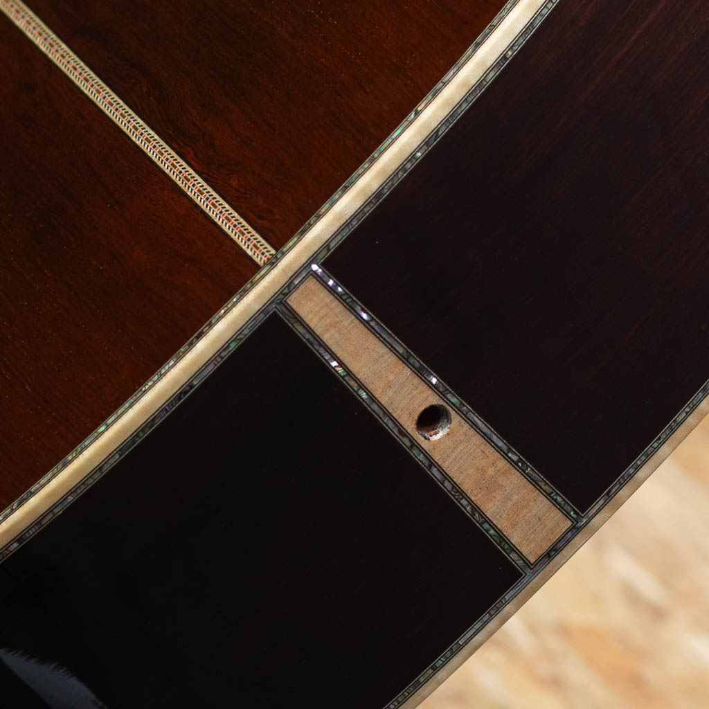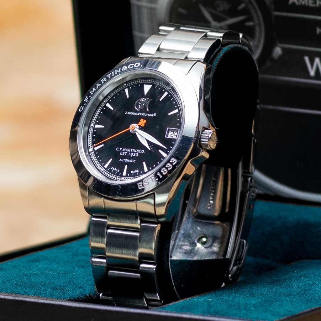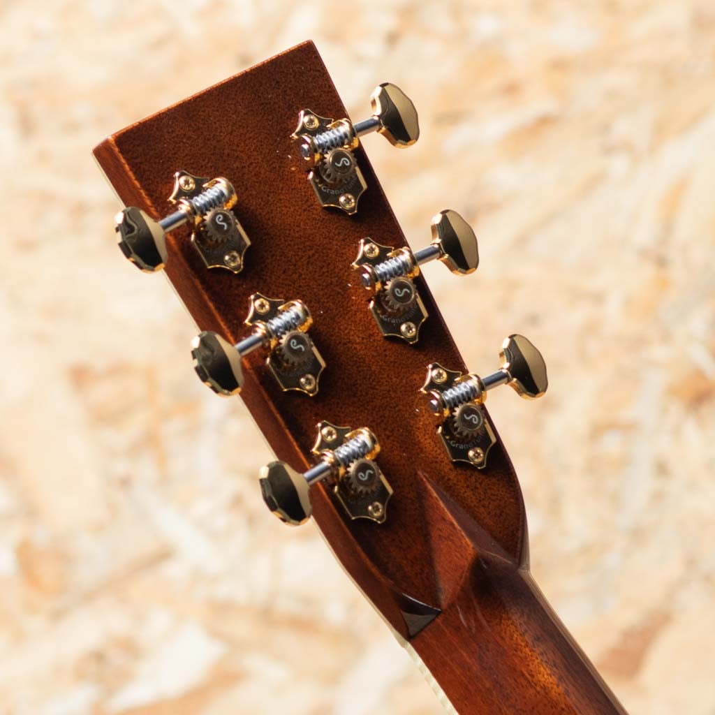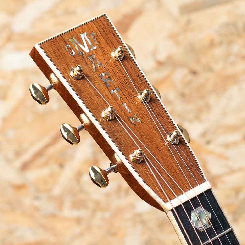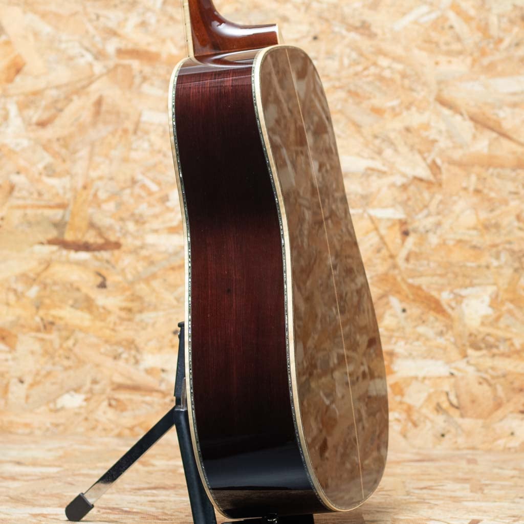 世界に一つだけのカスタムモデル!マーティンカスタムショップ製ギターとはマーティンファクトリー内のほんの一郭にて少数精鋭の熟練職人により手掛けられる超一級ギターのこと。オーセンティックシリーズや、特注品、一点モノのギターなどの生産がそれに当たります。本器はマーチン最高峰モデル"D-45"をベースにカスタマイズされた2018年製のカスタムモデル。プレミアムグレードのアディロンダックスプルーストップ、マダガスカルローズウッドサイド&バック、マホガニーネック、エボニー指板&ブリッジ、ヘキサゴン指板インレイ、シャーラー製ゴールドオープンバックペグ、縦ロゴヘッドインレイ、メイプルバインディング、べっ甲柄ピックガード、アディロンダックスプルース材のフォワードシフトスキャロップドブレーシング採用。モディファイドローオーバルプロファイルのハイパフォーマンステーパーを採用したネックやドロップインサドルなど、現代的に扱いやすい要素も取り入れられたこだわりの1本。上質な材を組み合わせた45。まさに別格のサウンドです。重厚さ、華やかさ、抜けの良さ、全体のトーンバランスも絶妙で、弾けばすぐに違いがわかってしまいます。メイプルのバインディングが一味違ったアクセントとなっており、高級感もより一層増して感じられます。全体的にキズなども見受けられず、ネックの状態含め大変素晴らしいコンディション。おまけにMartinの腕時計まで付属します。オリジナルハードケース付き。