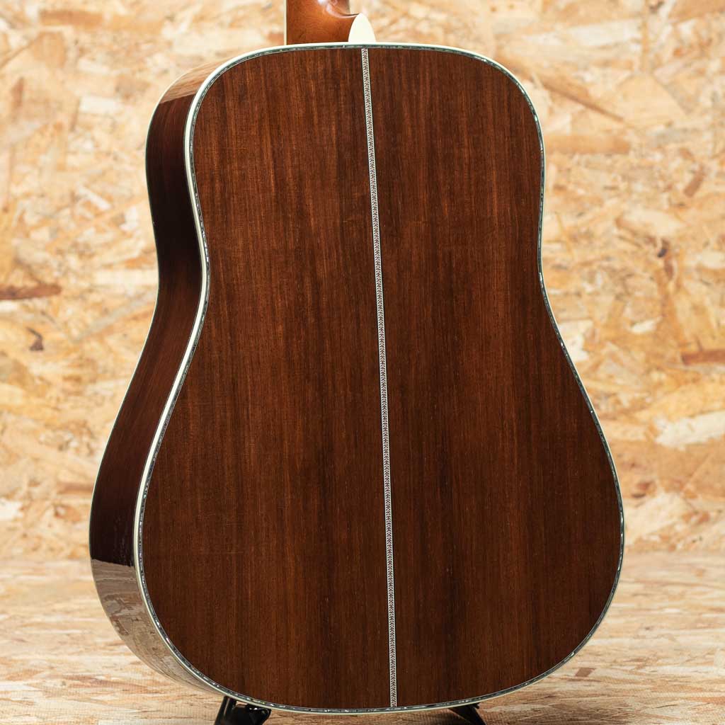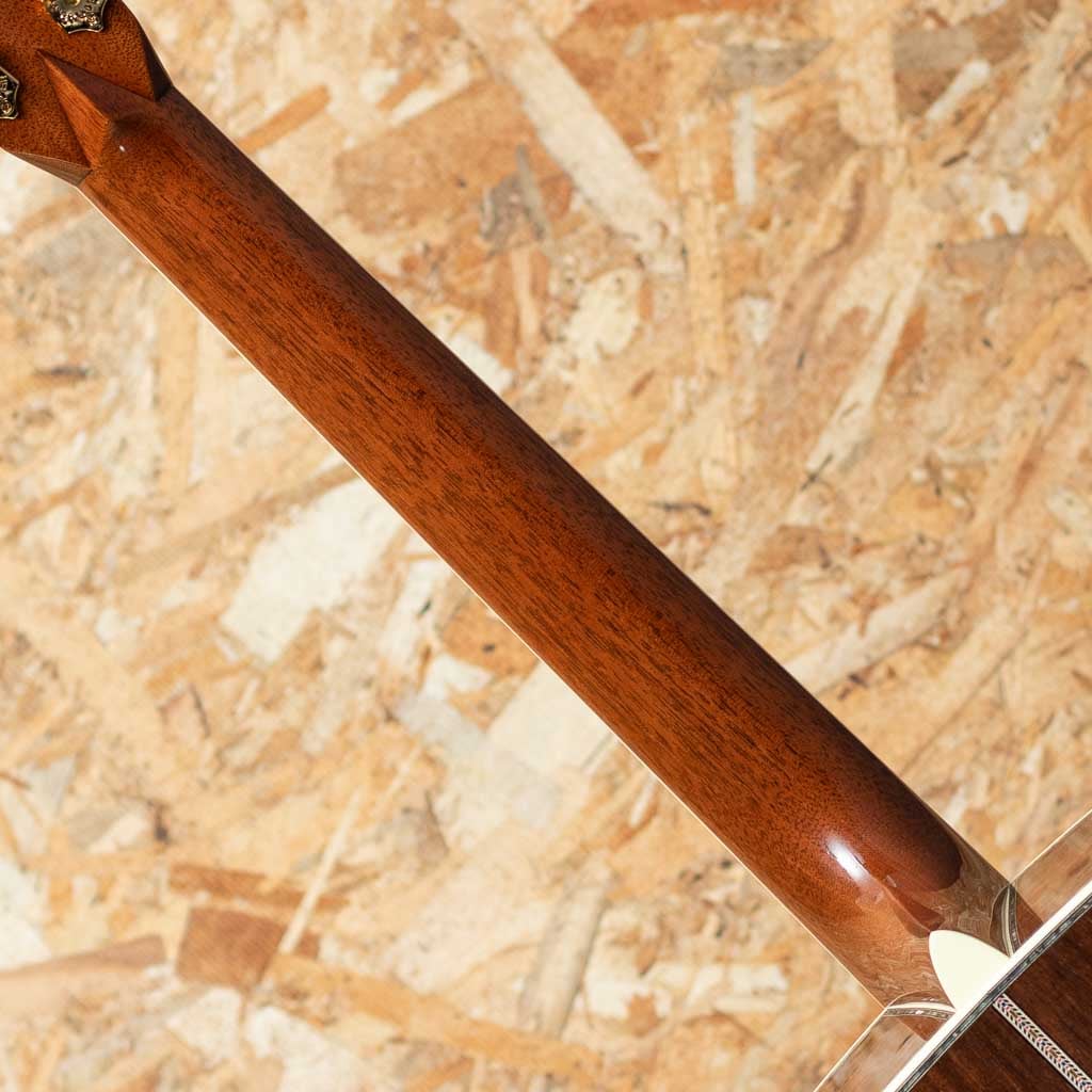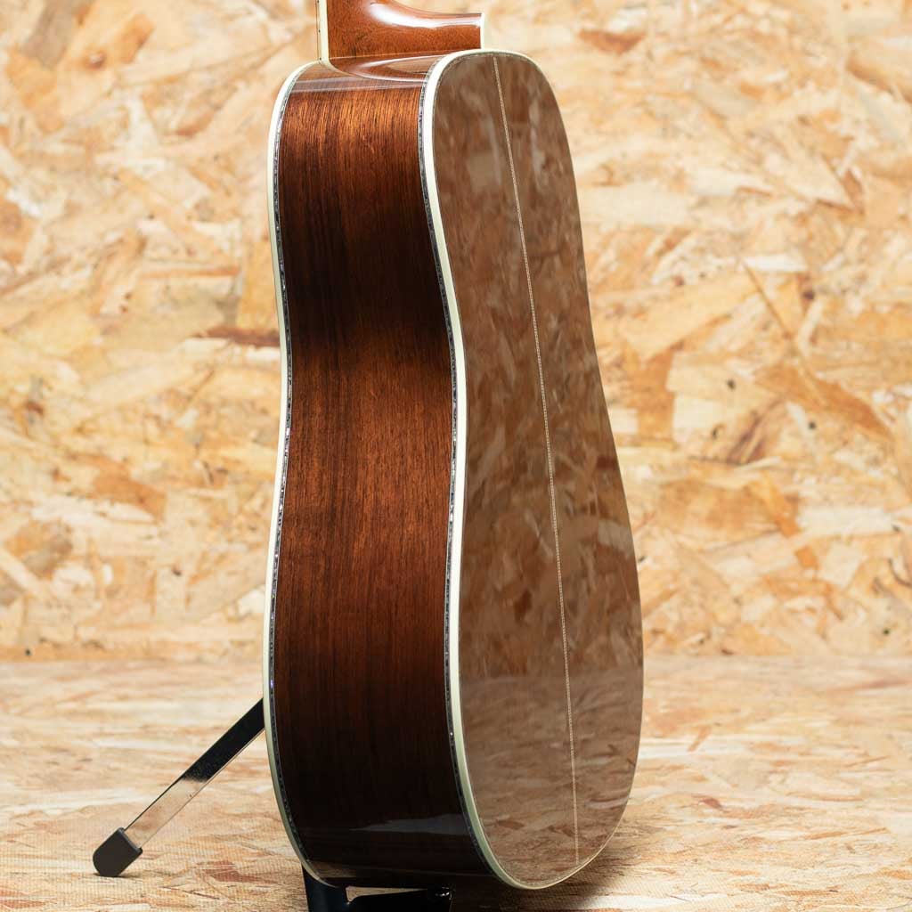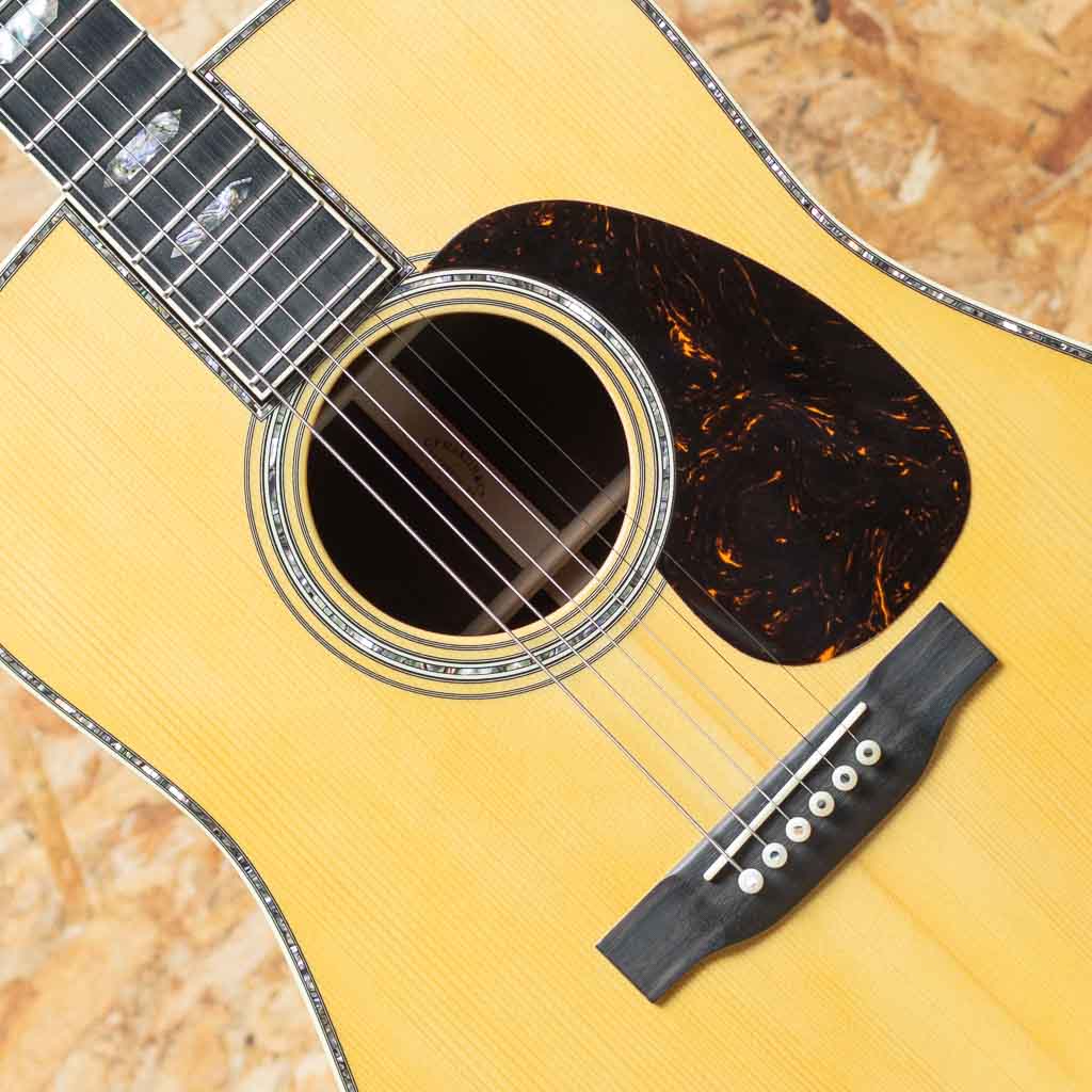 現マーチン工場の中でも、卓越した技術と豊富な経験から至極のギターを造り出す"Martin Custom Shop"。マーティンカスタムショップ製ギターとはマーティンファクトリー内のほんの一郭にて少数精鋭の熟練職人により手掛けられる超一級ギターのこと。オーセンティックシリーズや、特注品、一点モノのギターなどの生産がそれに当たります。本器は"D-45"を基としてサイドバックに弊社スタッフが現地にて選定したアディロンダックスプルース×マダガスカルローズウッドを採用したカスタムモデル。プレミアムグレードのアディロンダックスプルーストップ、プレミアムグレードマダガスカルローズウッドサイド&バック、ブラックエボニー指板&ブリッジ、グローバー製オープンバックゴールドペグ、アバロンヘキサゴン指板インレイ、べっ甲柄ピックガード、プレミアムグレードマダガスカルローズウッドヘッドプレート、42.9mmナット幅。低音は深く、パンチ力を持ったまま豊かな倍音を持つ上質なトーンを実現しています。ピックでの演奏ももちろんフィンガーピッキングでも気持ちよく反応してくれるポテンシャルの高さ。モディファイド・ローオーバルシェイプのネックで演奏性も快適です。カスタムモデルならではの贅沢なウッドマテリアルをぜひご堪能くださいませ。オリジナルハードケース付属。