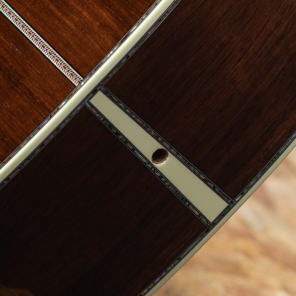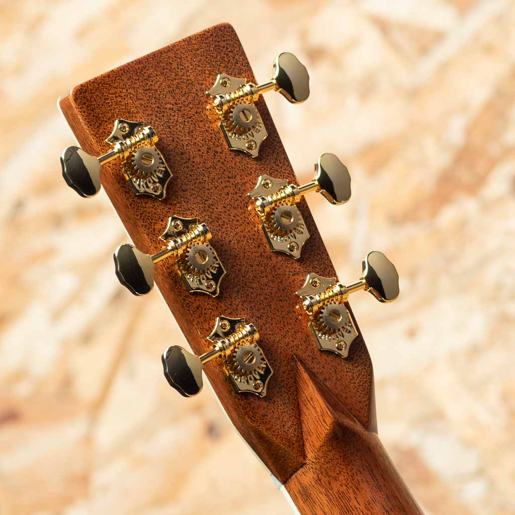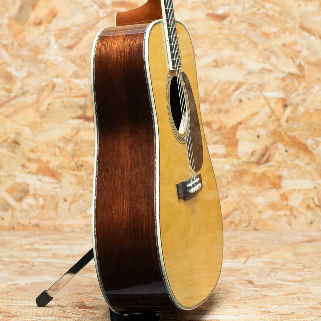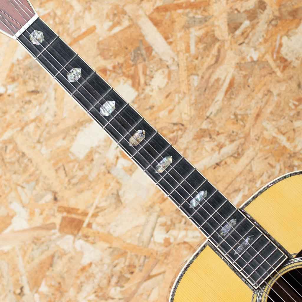 現マーチン工場の中でも、卓越した技術と豊富な経験から至極のギターを造り出す"Martin Custom Shop"。マーティンカスタムショップ製ギターとはマーティンファクトリー内のほんの一郭にて少数精鋭の熟練職人により手掛けられる超一級ギターのこと。オーセンティックシリーズや、特注品、一点モノのギターなどの生産がそれに当たります。本器は"D-45"を基としてサイドバックに弊社スタッフが現地にて選定したアディロンダックスプルース×マダガスカルローズウッドを採用したカスタムモデル。プレミアムグレードのアディロンダックスプルーストップ、プレミアムグレードマダガスカルローズウッドサイド&バック、ブラックエボニー指板&ブリッジ、グローバー製オープンバックゴールドペグ、アバロンヘキサゴン指板インレイ、べっ甲柄ピックガード、プレミアムグレードマダガスカルローズウッドヘッドプレート、42.9mmナット幅。低音は深く、パンチ力を持ったまま豊かな倍音を持つ上質なトーンを実現しています。ピックでの演奏ももちろんフィンガーピッキングでも気持ちよく反応してくれるポテンシャルの高さ。モディファイド・ローオーバルシェイプのネックで演奏性も快適です。カスタムモデルならではの贅沢なウッドマテリアルをぜひご堪能くださいませ。オリジナルハードケース付属。
