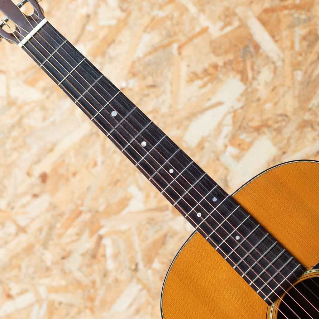 1934年、初の14フレットジョイントモデルの誕生以来、D-28に並ぶ名機として数世代に渡りそのスタイルを守り続ける伝統的なモデルのひとつです。本器はその前身となる1931年から1934年までの間に製作されていた、スロッテッドヘッド&12フレット・ジョイントスタイルをモチーフにしたモデル”D-18S”、1970年製USED品。スプルーストップ、マホガニーサイド&バック、ハカランダ指板&ブリッジ、グローバーシルバーぺグ、パールドットフィンガーボードインレイ、スクエアロッド、ノンスキャロップドXブレイシング。ピックガードはべっ甲カラーのものへと交換されています。丸みを帯びたスロープショルダーボディに、12フレットジョイント仕様からなる豊かな低音と中音域を中心としたウォームなトーンは、一般的なD-18と比べても、より大きく深い共鳴を感じさせてくれます。やや太めのネックもこの太く甘いサウンドに一役買っているでしょう。ネックヒールにストラップピンが後付されており、打痕などの小キズやピックガードの縮みなどの使用感や経年感はあるものの、割れなどの大きなダメージはありません。弦高調整の為、サドルを低めに削ってありますが、現在の弦高は標準値でネックの状態も良く快適な演奏性を保っています。球数の少ないこちらのモデル、ぜひご検討くださいませ。汎用ハードケースが付属いたします。