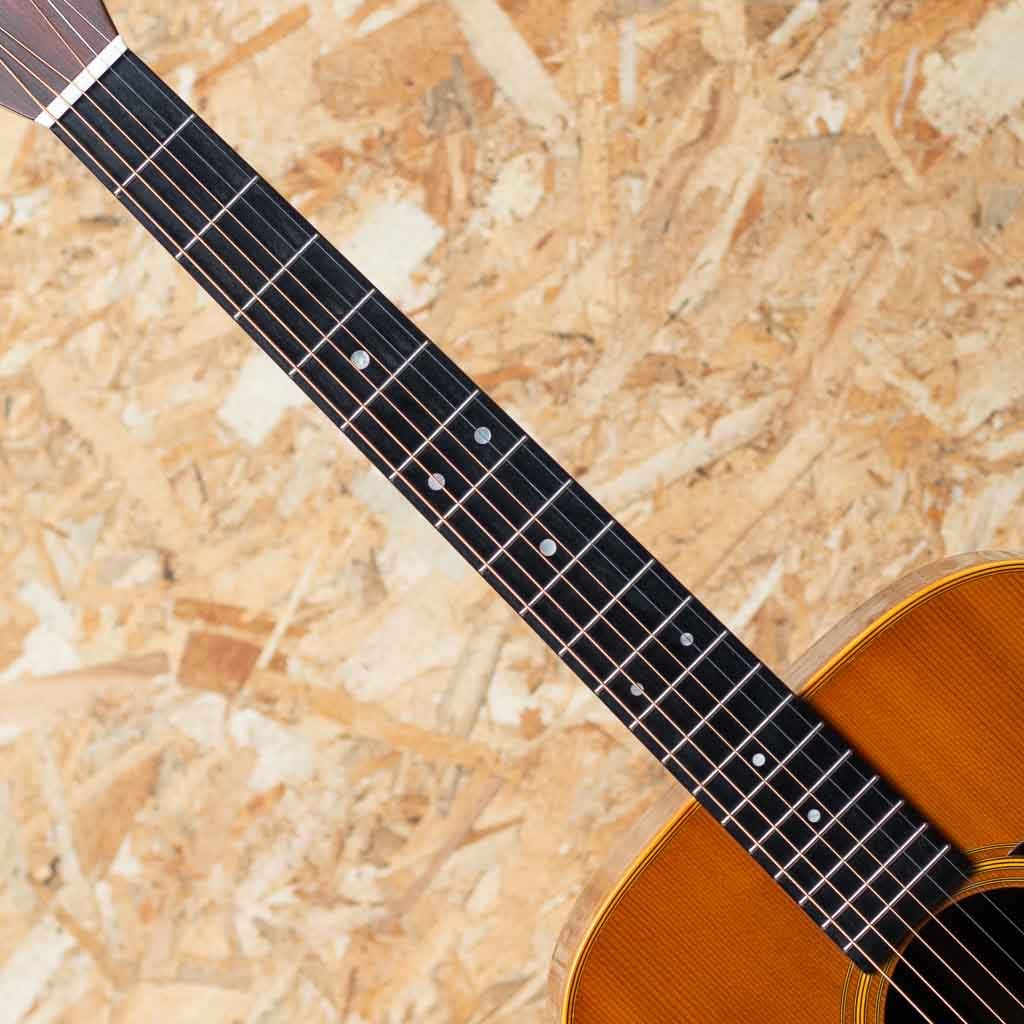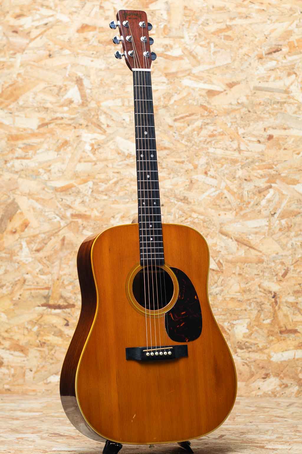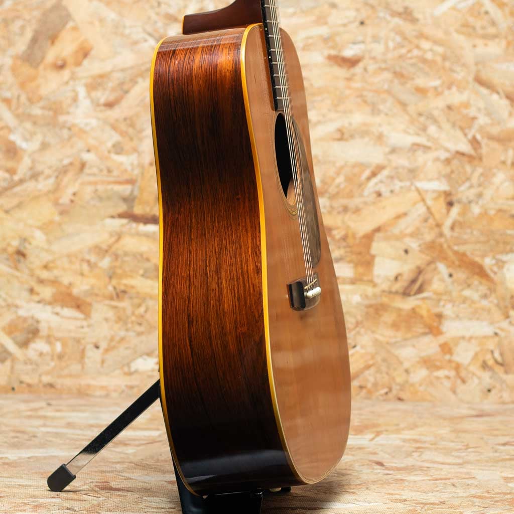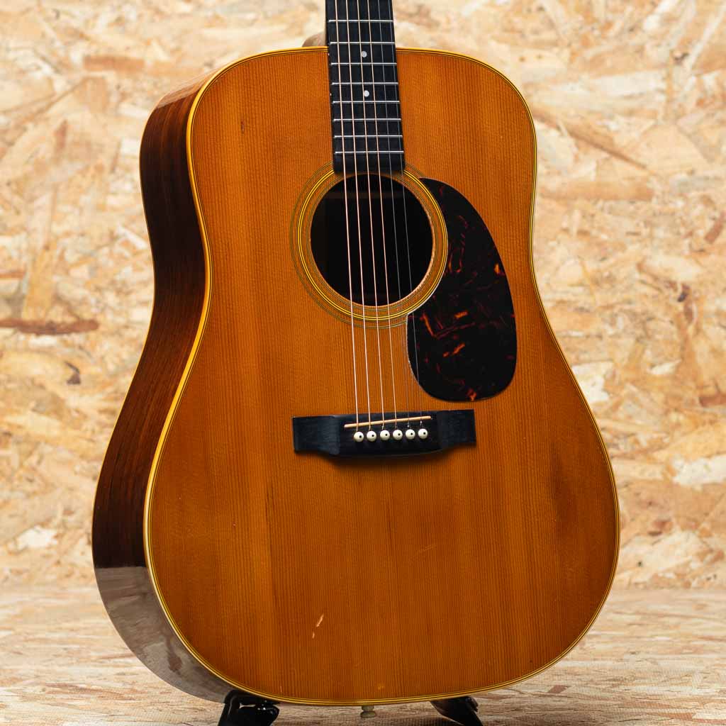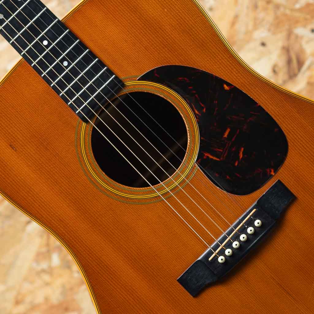 マーチンギターの中で最も有名なモデルと言えば、D-28。1931年の発表以来、プロアマを問わず世界中のミュージシャンに愛され、全てのフラットトップギターの基本とされてきたと言っても過言ではないワールドスタンダードモデル。本器はハカランダ仕様の"D-28"、1967年製です。スプルーストップ、ハカランダサイド&バック、ネック補強はこの年からスクエアロッドに変更されますがこちらはスクエアロッド変更前のスチールT-Bar rod仕様、エボニー指板、パテント刻印入りグローバーペグ(4弦ペグのみPat無しのグローバーペグ)、ハカランダ化粧板、パール指板ドット、ノンスキャロップド・Xブレイシング。スモールメイプルブリッジプレート。エボニーブリッジ、ピックガードは雰囲気をそこねない赤べっ甲柄ピックガードへ交換、PG内側にマーチンクラック補修、他トップに2か所の軽微なクラック補修、バックのクビレ部のクラック補修が見られます。十分に飴色に変色したトップにウエザーチェック、弾き傷などが見られ歴戦の強者顔とした貫禄漂うビンテージならではの雰囲気を感じられる一本です。過去にフレット交換なども済ませ、ネックコンディションも良好、サドルはギリギリまで調整されており現状大変弾きやすい状態です。キレとパンチのあるサウンド、ドシっと重心の低い部分の重厚ながらブライトな良さはハカランダならではと言えるでしょう。T-Barネック、メイプルブリッジプレートならではのサウンドはこれ以降とはまた異なる明瞭さがまた際立っています。充分に弾きこまれた熟れたサウンドはビンテージギターならではの醍醐味です。汎用ハードケース付属