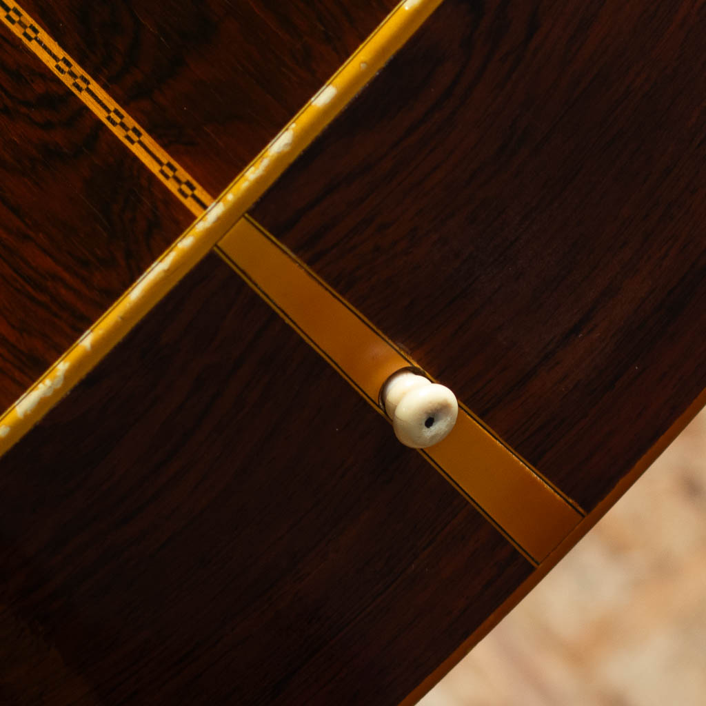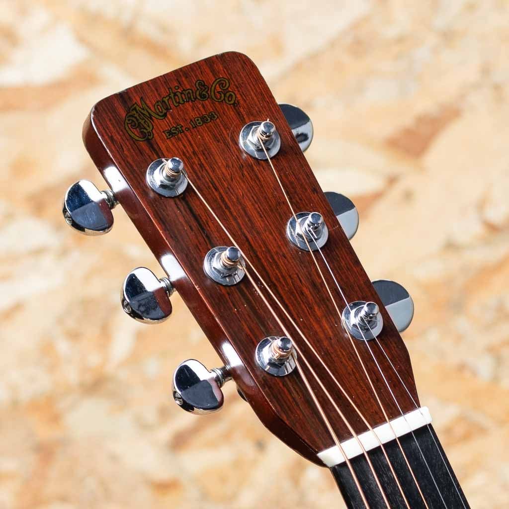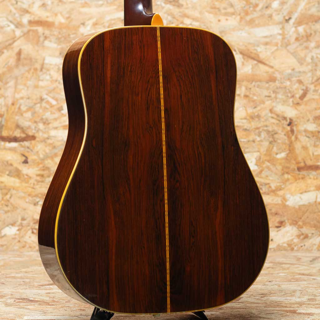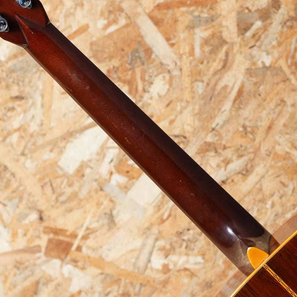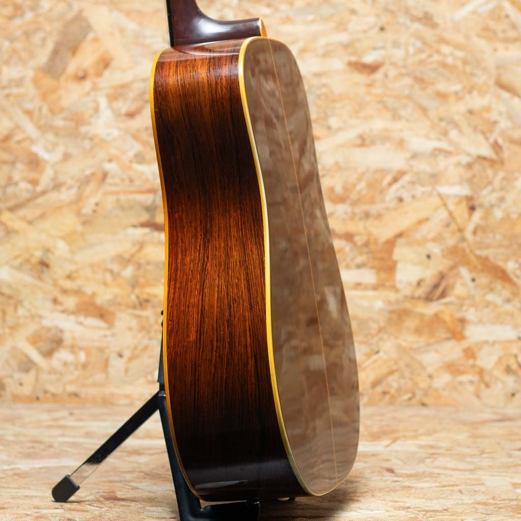 マーチンギターの中で最も有名なモデルと言えば、D-28。1931年の発表以来、プロアマを問わず世界中のミュージシャンに愛され、全てのフラットトップギターの基本とされてきたと言っても過言ではないワールドスタンダードモデル。本器はハカランダ仕様の"D-28"、1967年製です。スプルーストップ、ハカランダサイド&バック、ネック補強はこの年からスクエアロッドに変更されますがこちらはスクエアロッド変更前のスチールT-Bar rod仕様、エボニー指板、パテント刻印入りグローバーペグ(4弦ペグのみPat無しのグローバーペグ)、ハカランダ化粧板、パール指板ドット、ノンスキャロップド・Xブレイシング。スモールメイプルブリッジプレート。エボニーブリッジ、ピックガードは雰囲気をそこねない赤べっ甲柄ピックガードへ交換、PG内側にマーチンクラック補修、他トップに2か所の軽微なクラック補修、バックのクビレ部のクラック補修が見られます。十分に飴色に変色したトップにウエザーチェック、弾き傷などが見られ歴戦の強者顔とした貫禄漂うビンテージならではの雰囲気を感じられる一本です。過去にフレット交換なども済ませ、ネックコンディションも良好、サドルはギリギリまで調整されており現状大変弾きやすい状態です。キレとパンチのあるサウンド、ドシっと重心の低い部分の重厚ながらブライトな良さはハカランダならではと言えるでしょう。T-Barネック、メイプルブリッジプレートならではのサウンドはこれ以降とはまた異なる明瞭さがまた際立っています。充分に弾きこまれた熟れたサウンドはビンテージギターならではの醍醐味です。汎用ハードケース付属