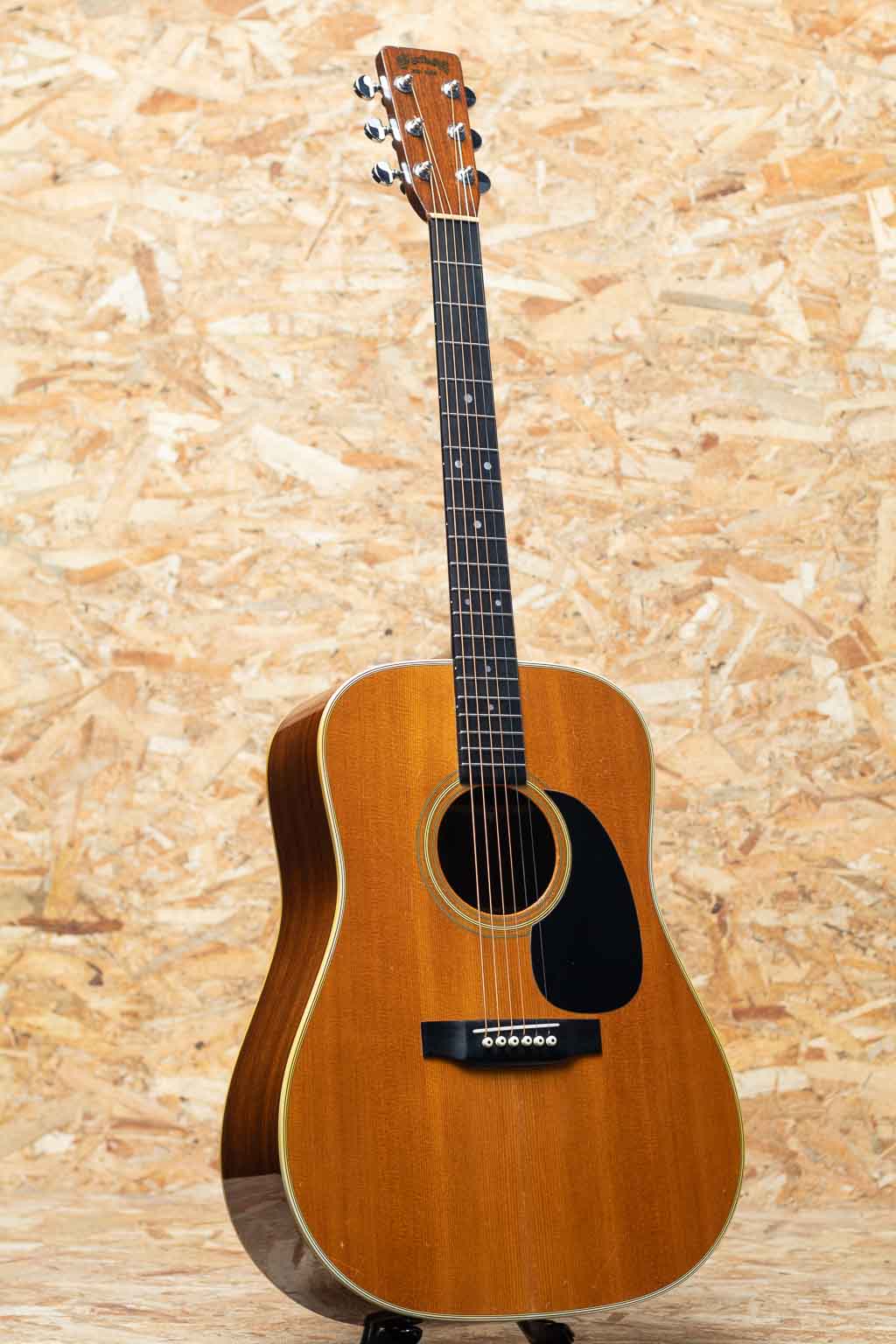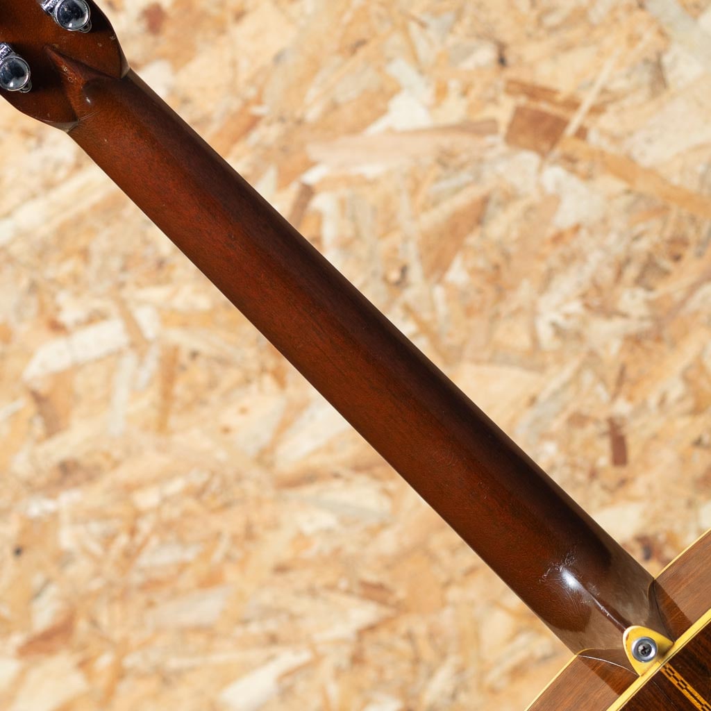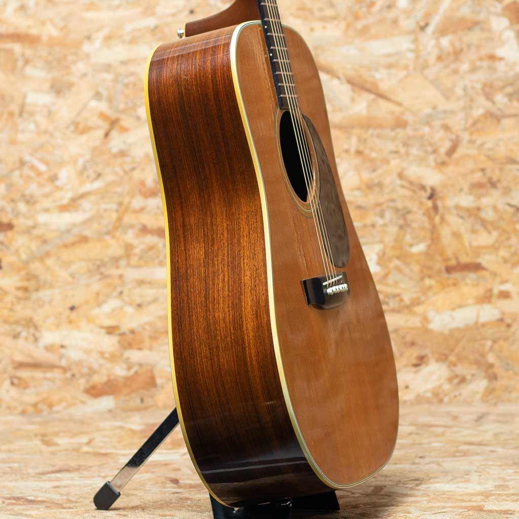 マーチンギターの中で最も有名なモデル"D-28"。現在同様の14fジョイントのドレッドモデルとして1934年に誕生してから、時を超え今もなお愛されるワールドスタンダードモデルです。本器は1976年製USED品。スプルーストップ、インディアンローズウッドサイド&バック、マホガニーネック、エボニー指板&ブリッジ、グローバーペグ、MOP指板ドットインレイ、スクエアネックロッド、ローズウッドブリッジプレート、ノンスキャロップドXブレイシング。ブライトかつ重厚感のある骨太な70sサウンド。近年マーチンとは明らかに異なる重心の低いパンチある音色で、往年のフォークミュージックから聴こえる哀愁のある艶やかさも感じさせます。ピックガードサウンドホール側のマーチンクラックとブリッジ下センターにクラック補修が見られます。ネックヒールストラップピンを打っているほか、ボディエンドにはジャック穴が開けられている状態です。サウンドホール周りのピックスクラッチをはじめ全体的に年数相応な使用感や経年感は窺える個体ですが、致命的なキズや演奏上の問題はございません。いまだに人気の高い70sマーチンの良さを十二分に感じて頂ける、ガシガシ弾いて頂きたいオススメの1本です。オリジナルハードケース付属。