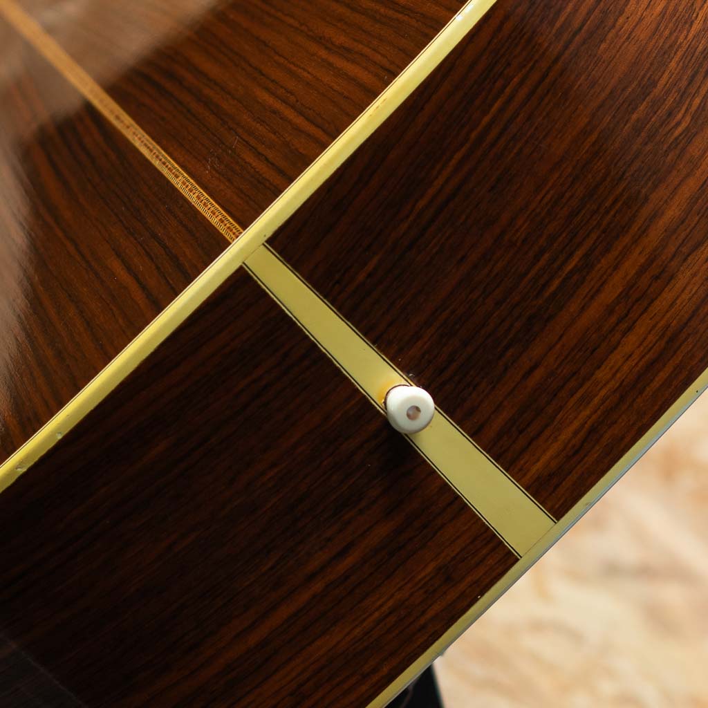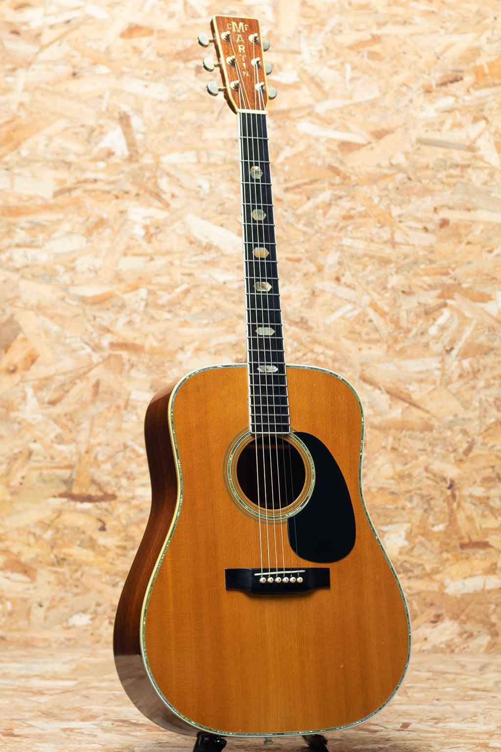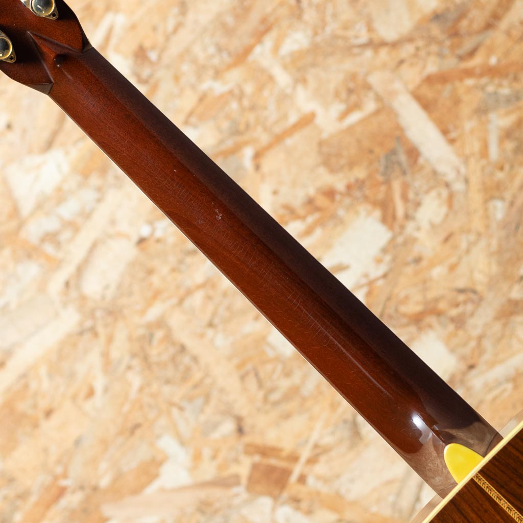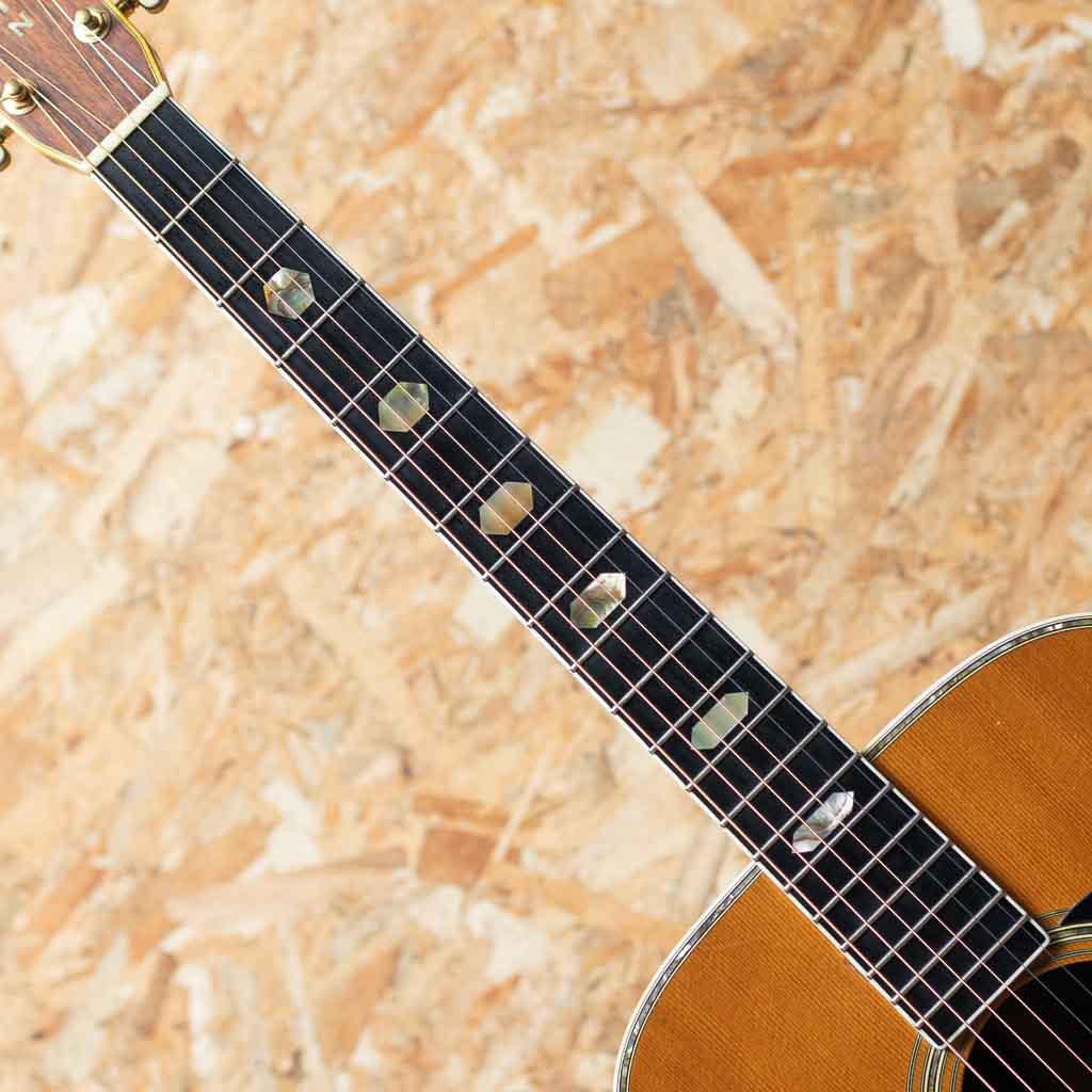 "D-41"は1969年に製作が開始されたマーチン社の広報/研究家マイク・ロングワース氏がデザインしたモデル。"D-45"は高価で手が出ないという声に応える為に開発され、28と45の中間モデルとして、ゴージャス感を兼ね備えた独自の個性を魅せます。本器は1975年製のUSED品。シトカスプルーストップ、ローズウッドサイド&バック、マホガニーネック、エボニー指板&ブリッジ、USAゴールドグローバーペグ、バーチカルヘッドロゴ(縦ロゴ)、ヘキサゴン指板インレイ、ソリッドアバロンロゼッタ&トリム、ラージローズウッドブリッジプレート、スクエアネックトラスロッド、ノンスキャロップドXブレイシング。ピックガードは同形の黒にリプレイスされています。ノンスキャロップブレイシングとSQロッドによる芯の強さ、音色の太さを獲得しており現代のモノとは異なった個性を持ち、太く甘く1本線の通った煌びやかな高音が心地よく響きます。指板にクラック補修がありますが、ボディ自体はノンクラック&オリジナルフィニッシュを保持しており、サドルはギリギリまで削って調整がされておりますが現在は標準的な弦高設定。演奏性も良好です。ペグワッシャー回りの塗装のチップや、指板バインディングの補修、ネックヒールのストラップピン取り付け穴の埋め跡等、細かな傷や使用感などございますが、大きなダメージはなく細かなウェザーチェックもみられとても良い外観へと仕上がっています。ゆったりとした曲調で弾くも良し、音圧を出してフォーキーに演奏するも良し、70sマーティンの良さを体感できる1本です。オリジナルハードケースが付属いたします。