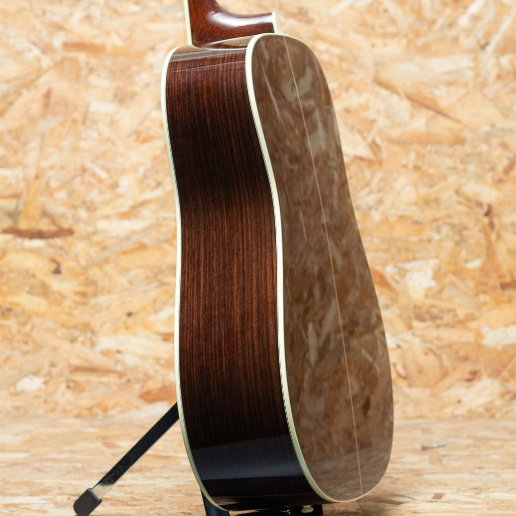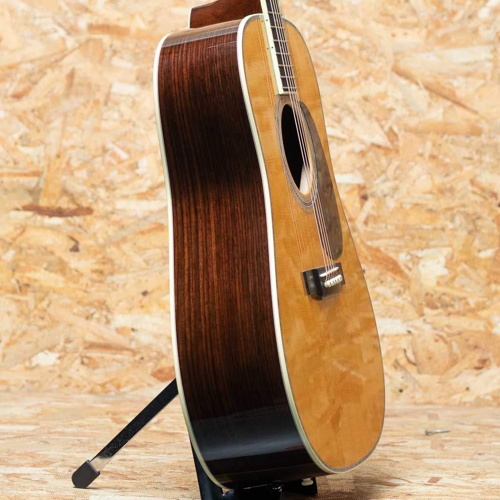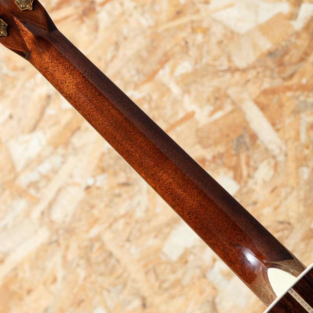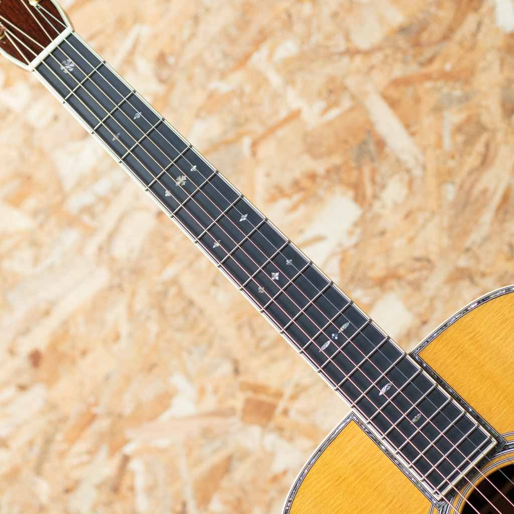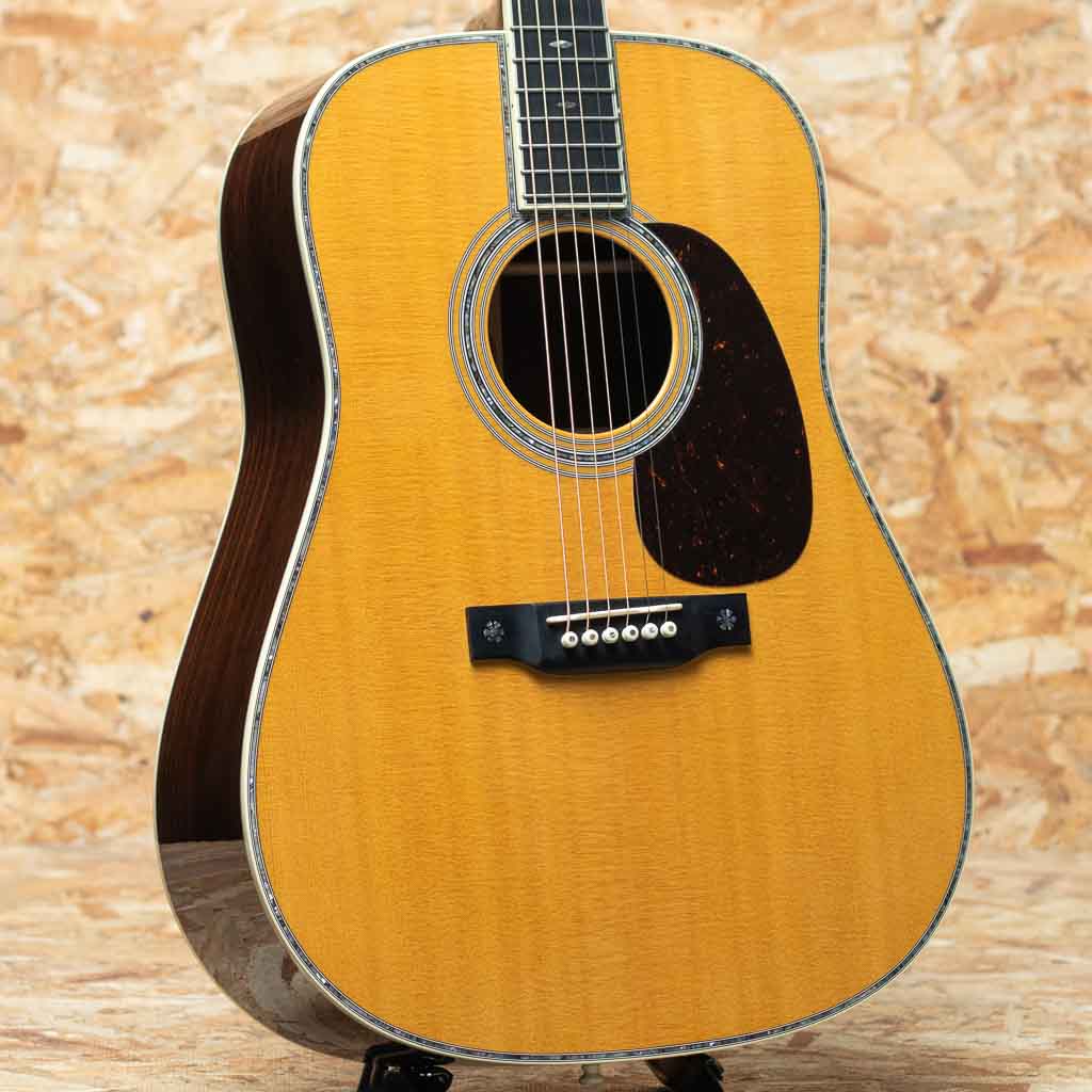 数あるマーチンモデルの中でもその上位に位置する40番台を冠するモデルは、選りすぐりの材を使用し、ヘッドに輝く縦のマーチンロゴを配された、マーチン社が誇るトップモデルのひとつ。本器は"45"とは異なる魅力を放つ”D-42”。スタイル42の歴史は古く、19世紀から続く由緒正しきモデルです。本器は2022年に製作されたUSED品。スプルーストップ、イーストインディアンローズウッドサイド&バック、ジニュインマホガニーネック、エボニー指板&ブリッジ、グローバーゴールドオープンバックペグ、アバロンバーチカルヘッドロゴ、アバロンスノーフレークス&キャッツアイ指板インレイ、べっ甲柄ピックガード、アバロンロゼッタ&トップトリム、アバロンスーウフーイクスブリッジインレイ、モザイクバックストリップ、フォワードシフテッド・スキャロップドXブレイシング。ドレッドらしい迫力のサウンドときらびやかな倍音の融合。40番台らしいキラキラとした高次倍音に、ふくよかなで奥深い箱鳴り。音の分離も明瞭で握力のサウンドから繊細なトーンまで幅広く奏でてくれます。”45”とは異なり、柔らかな響きを強く含むのも”42”の特徴です。また外観も”45”と比べサイド&バックの貝巻きがなく、指板インレイもヘキサゴンではない装飾は、華やかながらに落ち着いた上品さを伺わせます。ネック形状はハインフレットまで弾きやすい薄手で厚さの均一なシェイプ。あらゆるプレイスタイルに好評を得るモダンでプレイアビリティの高い仕様になっています。状態は限りなく新品に近い良コンディション。使用感はまるで感じられず、ヘッド突板にライトを当てればわかる程度の薄いスクラッチ傷はあるものの目立つような傷や打痕はございません。ネックコンディションも抜群に良好。高い演奏性を保っています。また付属するオリジナルハードケースにはクリス・マーティン4世直筆のサインがなされております。