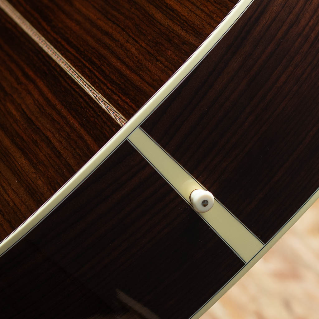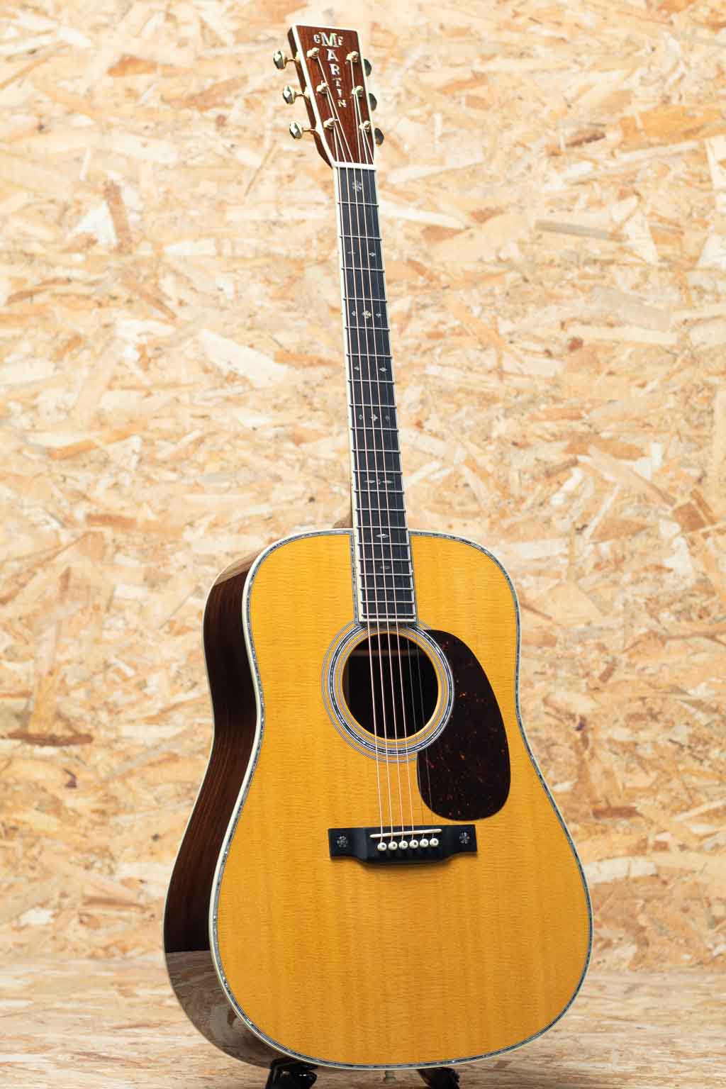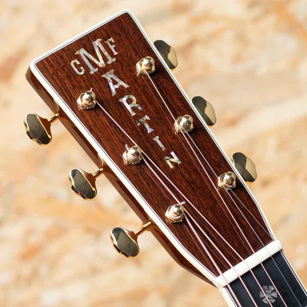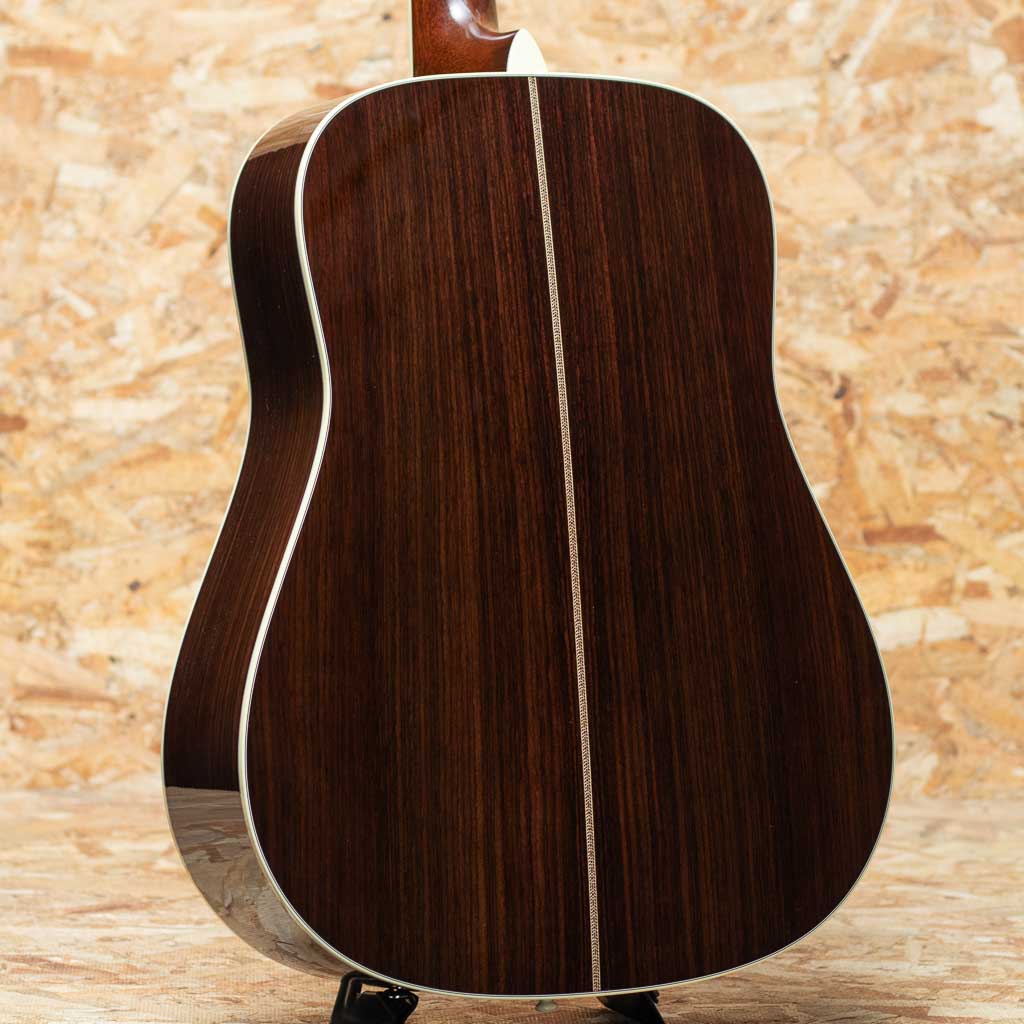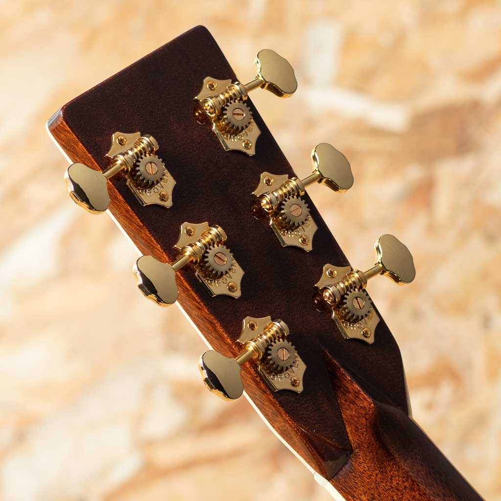 数あるマーチンモデルの中でもその上位に位置する40番台を冠するモデルは、選りすぐりの材を使用し、ヘッドに輝く縦のマーチンロゴを配された、マーチン社が誇るトップモデルのひとつ。本器は"45"とは異なる魅力を放つ”D-42”。スタイル42の歴史は古く、19世紀から続く由緒正しきモデルです。本器は2022年に製作されたUSED品。スプルーストップ、イーストインディアンローズウッドサイド&バック、ジニュインマホガニーネック、エボニー指板&ブリッジ、グローバーゴールドオープンバックペグ、アバロンバーチカルヘッドロゴ、アバロンスノーフレークス&キャッツアイ指板インレイ、べっ甲柄ピックガード、アバロンロゼッタ&トップトリム、アバロンスーウフーイクスブリッジインレイ、モザイクバックストリップ、フォワードシフテッド・スキャロップドXブレイシング。ドレッドらしい迫力のサウンドときらびやかな倍音の融合。40番台らしいキラキラとした高次倍音に、ふくよかなで奥深い箱鳴り。音の分離も明瞭で握力のサウンドから繊細なトーンまで幅広く奏でてくれます。”45”とは異なり、柔らかな響きを強く含むのも”42”の特徴です。また外観も”45”と比べサイド&バックの貝巻きがなく、指板インレイもヘキサゴンではない装飾は、華やかながらに落ち着いた上品さを伺わせます。ネック形状はハインフレットまで弾きやすい薄手で厚さの均一なシェイプ。あらゆるプレイスタイルに好評を得るモダンでプレイアビリティの高い仕様になっています。状態は限りなく新品に近い良コンディション。使用感はまるで感じられず、ヘッド突板にライトを当てればわかる程度の薄いスクラッチ傷はあるものの目立つような傷や打痕はございません。ネックコンディションも抜群に良好。高い演奏性を保っています。また付属するオリジナルハードケースにはクリス・マーティン4世直筆のサインがなされております。
