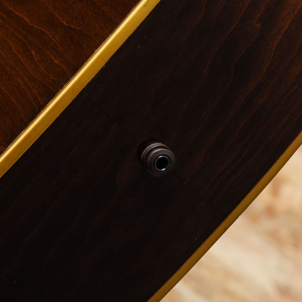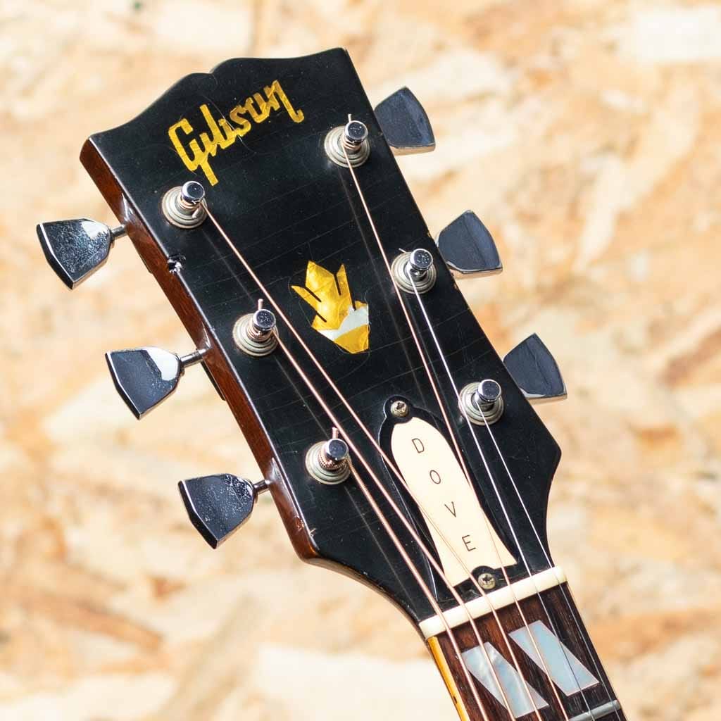 貫禄の外観と味わいあるインレイPGが印象的なフラッグシップモデル"Dove"。ギブソンとしては初となるスクエアショルダー型のハミングバードが好調だった理由で1962年にリリースが決定しましたがフタを開けてみるとその生産規模はとても小さいものでした。本器はVINTAGE最終過渡期のDOVE、ナチュラルカラーの1969年製の1本。スプルーストップ、メイプルサイド&バック、マホガニーネック、ローズウッド指板&ブリッジ、アジャスタブルサドル、オリジナルワッフルバッククルーソンペグ、パールダブインレイネジ止めピックガード、クラウンヘッドインレイ、ダブルパラレログラム指板インレイ、ノンスキャロップブレイシング、レギュラーネック。しっかりとボリュームの感じられる1本で、チューンオーマチックとは違ったコンプ感と伸び感、コシのあるサウンド。アジャスタブルサドルは牛骨に交換されております。ネックヒールにストラップピンの穴埋め跡と、6弦側ボディ肩の部分に打痕のタッチアップ修正が見られますが、年代を鑑みると比較的良いコンディションです。ピックガードの止めネジは一箇所新しいものに交換されております。貼り付けのピエゾピックアップが後付けされており、ライン出力も可能。ブリッジ裏側には銅板によるノイズ対策もしっかりと施されております。全体に入ったウェザーチェックがより良いビンテージの経年の風合いを感じさせる、荒々しく独特な力強いサウンドと味のあるルックスの1本です。近年製Gibsonハードケース付属。