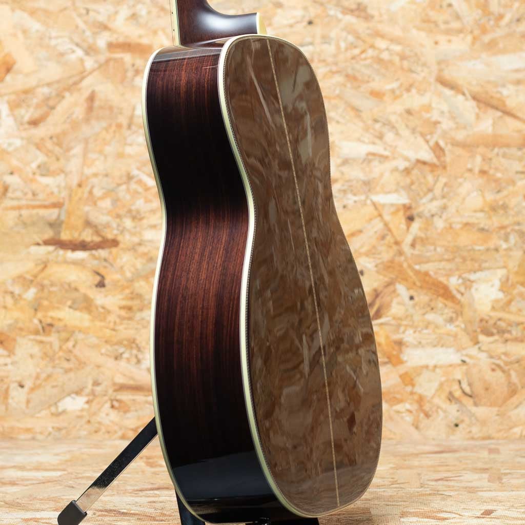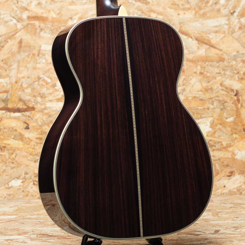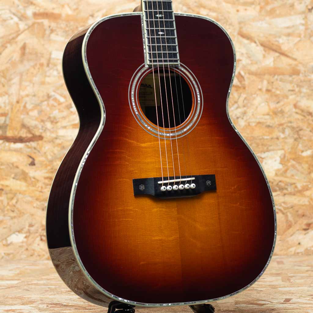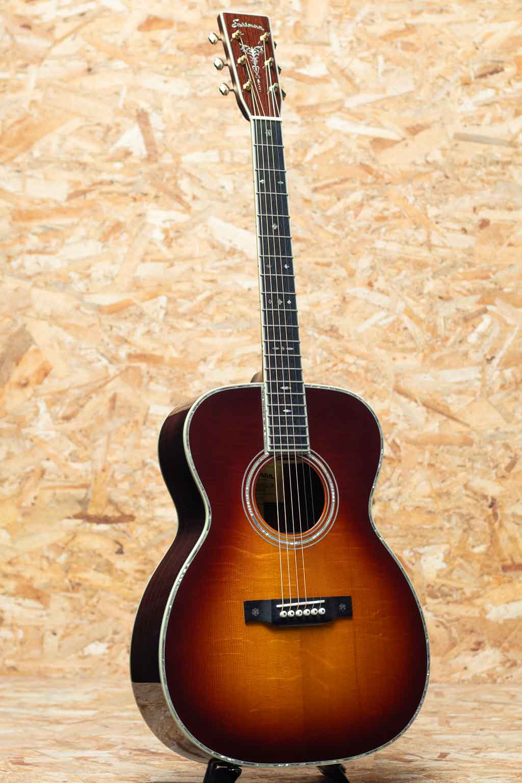 単板削り出しのアーチトップギターに定評のあるEastman。本器は”42”スタイルの美しい装飾に希少材を採用したEastman最上位モデルの”E40-OM-TC-SB”。モデル名には”OM”の表記がありますが、こちらのモデルは弦長632.5ミリのショートスケールです。AAAグレードアディロンダックスプルーストップ、ローズウッドサイド&バック、エボニー指板&ブリッジ、ゴトーゴールドペグ、アバロンスノーフレーク指板インレイ、スキャロップドXブレイシング、サンバーストフィニッシュ。トップの希少材アディロンダックスプルースには”サーモキュア”と名付けられた特殊な熱処理が施してあり、長年弾き込んだような豊かな音を出力。ダナ・ボジョアとの業務提携により更に深化した高品質な設計により優れた分離感と驚くほどの表現力・アーティキュレーションを持ち合わせています。目立つような傷や使用感はなく、大変美しい状態をキープしており、新品のギターを探されている方にもおすすめです。国内流通の少ないこちらのモデル、ぜひご検討くださいませ。オリジナルハードケース付属。