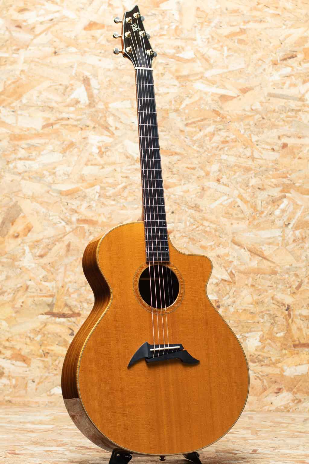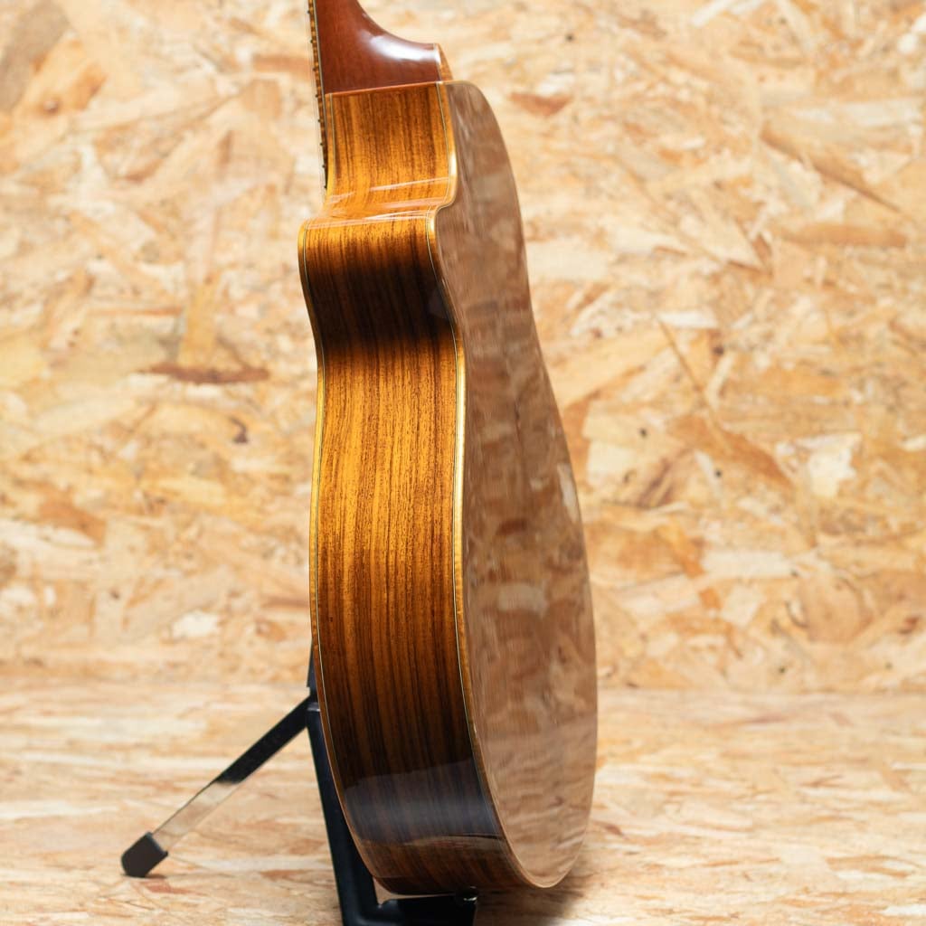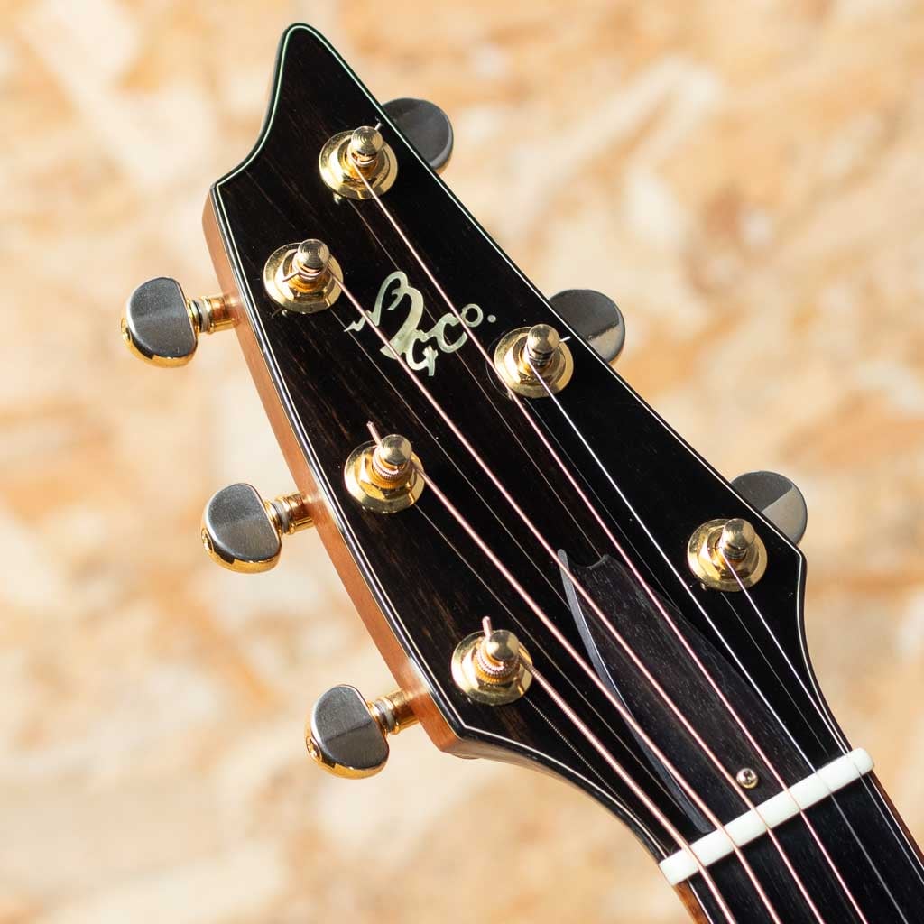 米オレゴン州の自社ファクトリーにて製造されるブランド"breedlove(ブリードラブ)"。かつてテイラー社に在籍した経歴を持つ”ラリー・ブリードラブ氏”により1990年創業、以来その独創的なデザインと個性的な音色で人気を博しグラミー賞受賞のエドガーハードをはじめ、国内外問わず多くのアーティストに愛用されているアメリカンブランドです。本器はEd Gerhard (エド・ガーハード)のシグネチャーモデル、1998年製のUSED品。ジャンボスタイルサイズでありながら薄型で抱えやすく演奏性を考慮されたボディとなっています。スプルーストップ、ローズウッドサイド&バック、マホガニーネック、エボニー指板&ブリッジグローバーゴールドペグ。デザイン性の高いピンレス仕様の非対称ブリッジ、優れたサステインとバランス、クリアなサウンドを実現する"ブリードラブ・ブリッジ・トラスを採用。胴が薄く大きなボディながら比較的軽量で扱く、しっかりしたボリュームながら、暴れすぎずバランスの取れたサウンド。ストロークや指弾きなど幅広いスタイルでお使いいただけます。6弦側サイドくびれ付近から10cm弱程割れの修理が行われております。また過去にピックアップが取り付けられており、ジャックサイズのエンドピンが付いております。その他細かな傷や打痕などは見られますが、年代を考慮すると比較的きれいな状態が保たれた1本です。オリジナルハードケース付属です。