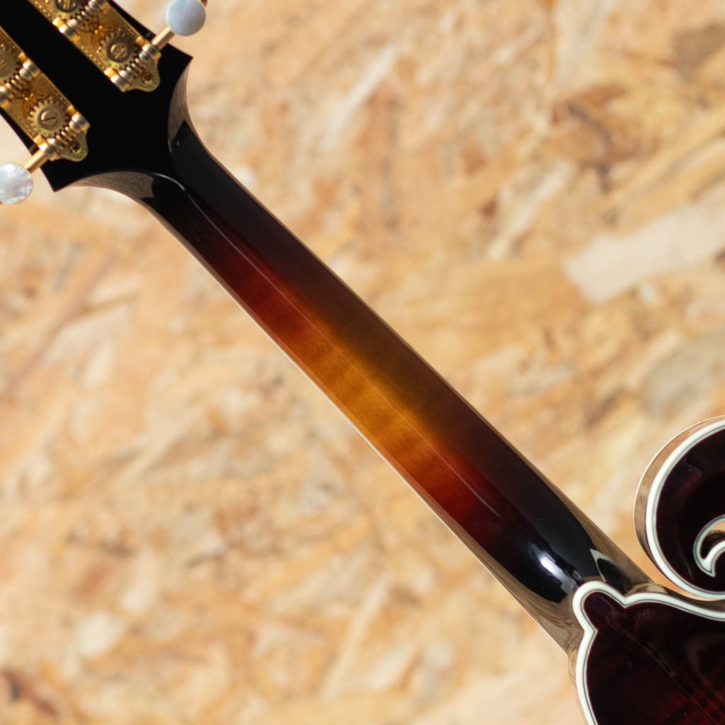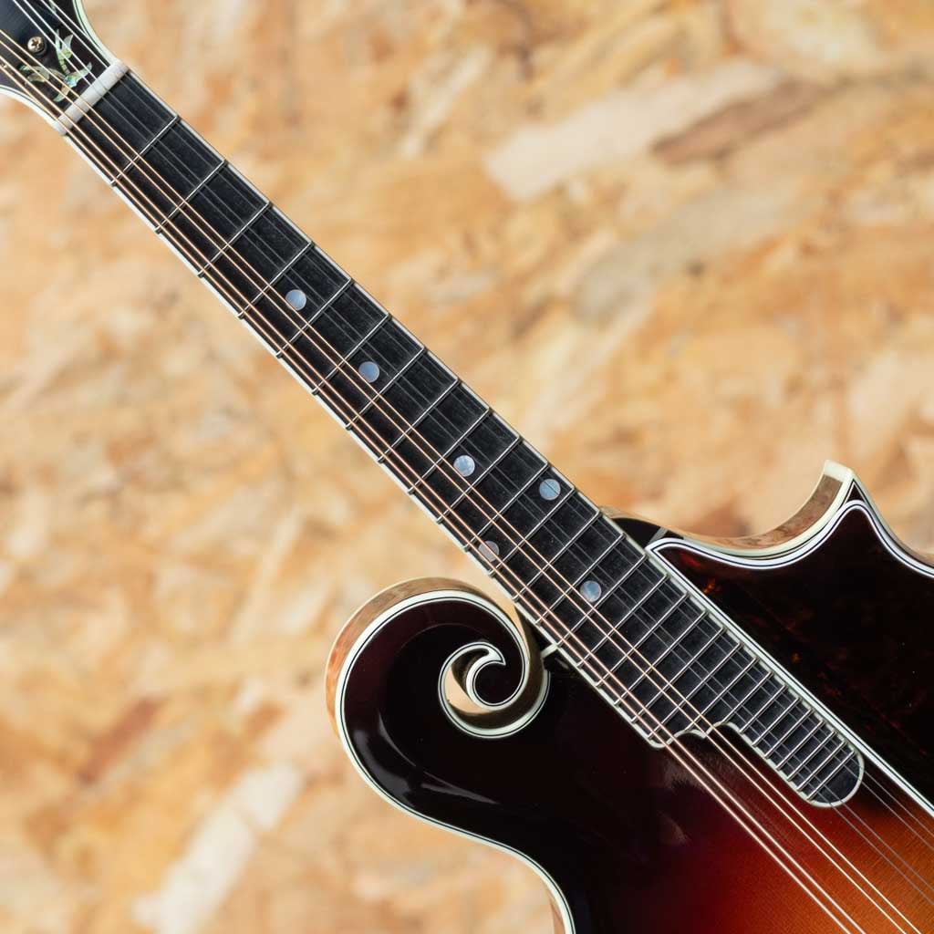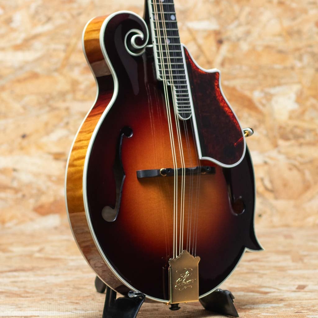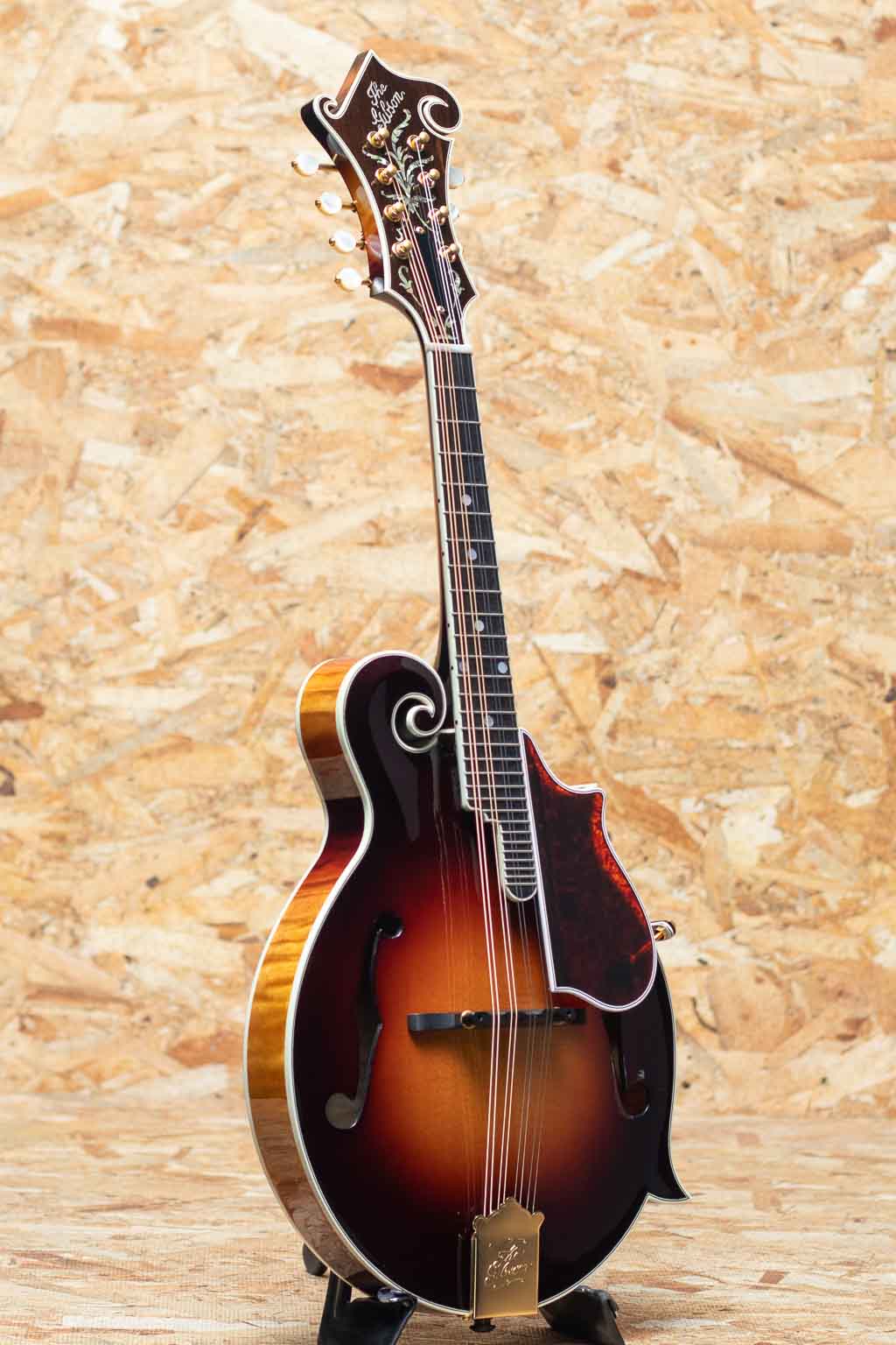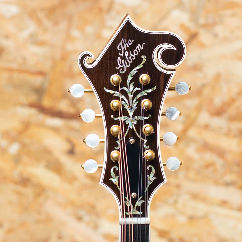 1922年にLloyd LoarがデザインしたオリジナルF-5マスターモデルを元に再生産されたGibson マンドリンの上位モデル”F-5L Fern” 2020年製極上USED品。現在ではオーダーも受付停止しており中古流通もまれな憧れのモデル。厳選した材を使用し丁寧にハンドクラフトされています。目の詰んだスプルーストップ、横にうっすらとフレイム杢の浮き出た良材を使用しています。サイド、バックは大きな鱗の様な深く大きな美しい杢をもつ極上のメイプルサイド&バック。ナット幅27mmのやや細めのトライアングルシェイプのネックに細めのフレット、ナットはパールナット、ヘッドには美しいアバロンでのファーンインレイが見事です。グローバーのゴールドペグで入手困難なパールノブを採用しています。エボニーのフラット指板で29f仕様。ボディー、指板、ヘッドはホワイトのバインディング、彫金でGibsonロゴを施されたゴールドテールピース、オリジナルのべっ甲柄ピックガード。インナーラベルにはマンドリストでありGibson Mandolinを監修するDavid Harveyのサインが入っています。光にかざすと見える程度の薄い拭きキズ、ピックガード表面のわずかな弾きキズが見える程度でゴールドパーツも色褪せもなく大変きれいな状態のニアミント品!ネックコンディション含めトータルコンディション抜群です。新品がオーダーできない今、非常に値打ちのある極上ユーズド品と言えるでしょう。甘太いギブソンらしいトーンはもちろん、どこか品の良い美しく華やかな響きでハイポジションまで音痩せせずにしっかりと前に抜けてくる感じはさすがのF-5モデル。F-5L Fernがこのコンディションででる事はまれです。この機会をお見逃しのないようお早めのご検討をおすすめします。オリジナルハードケース付属
