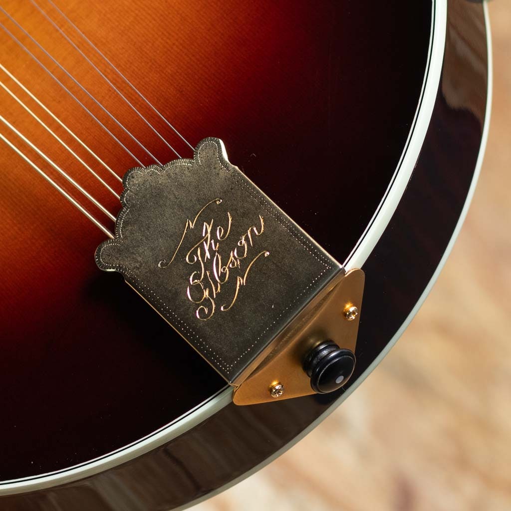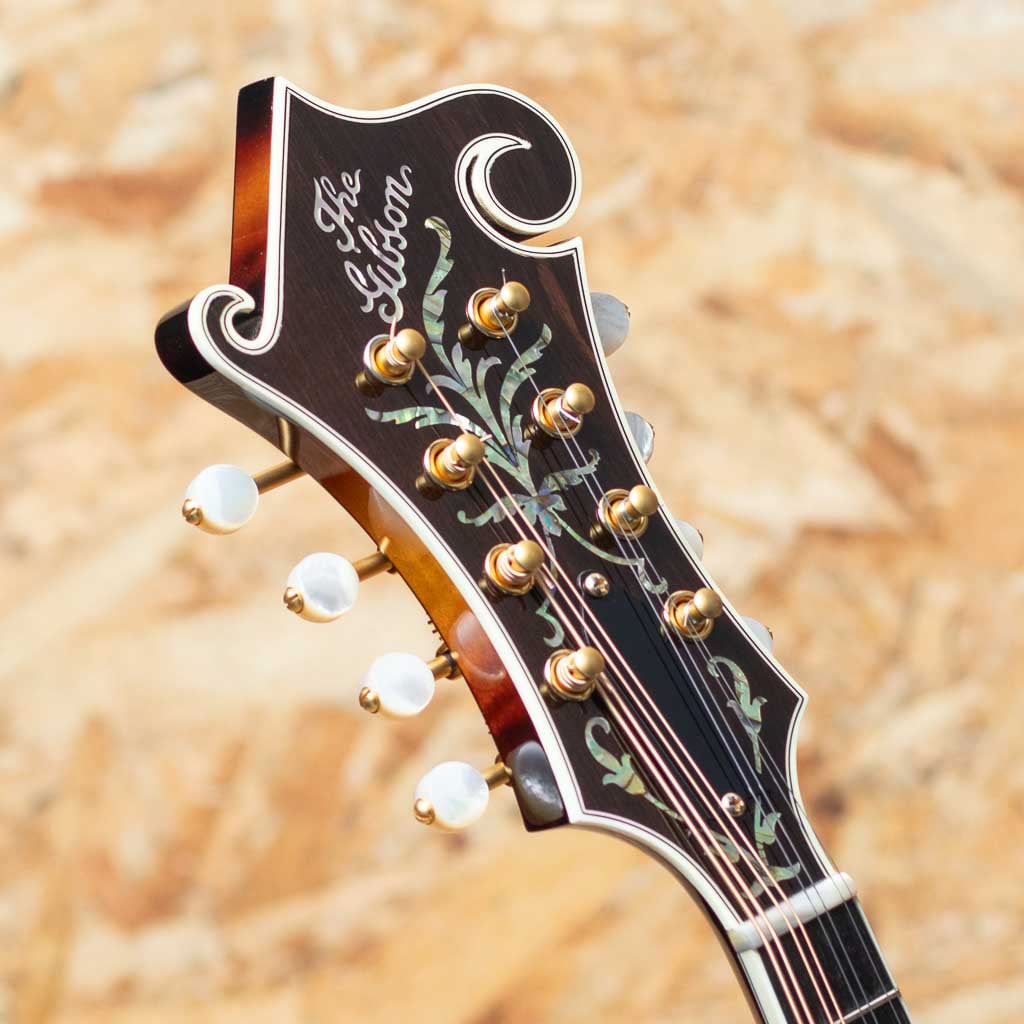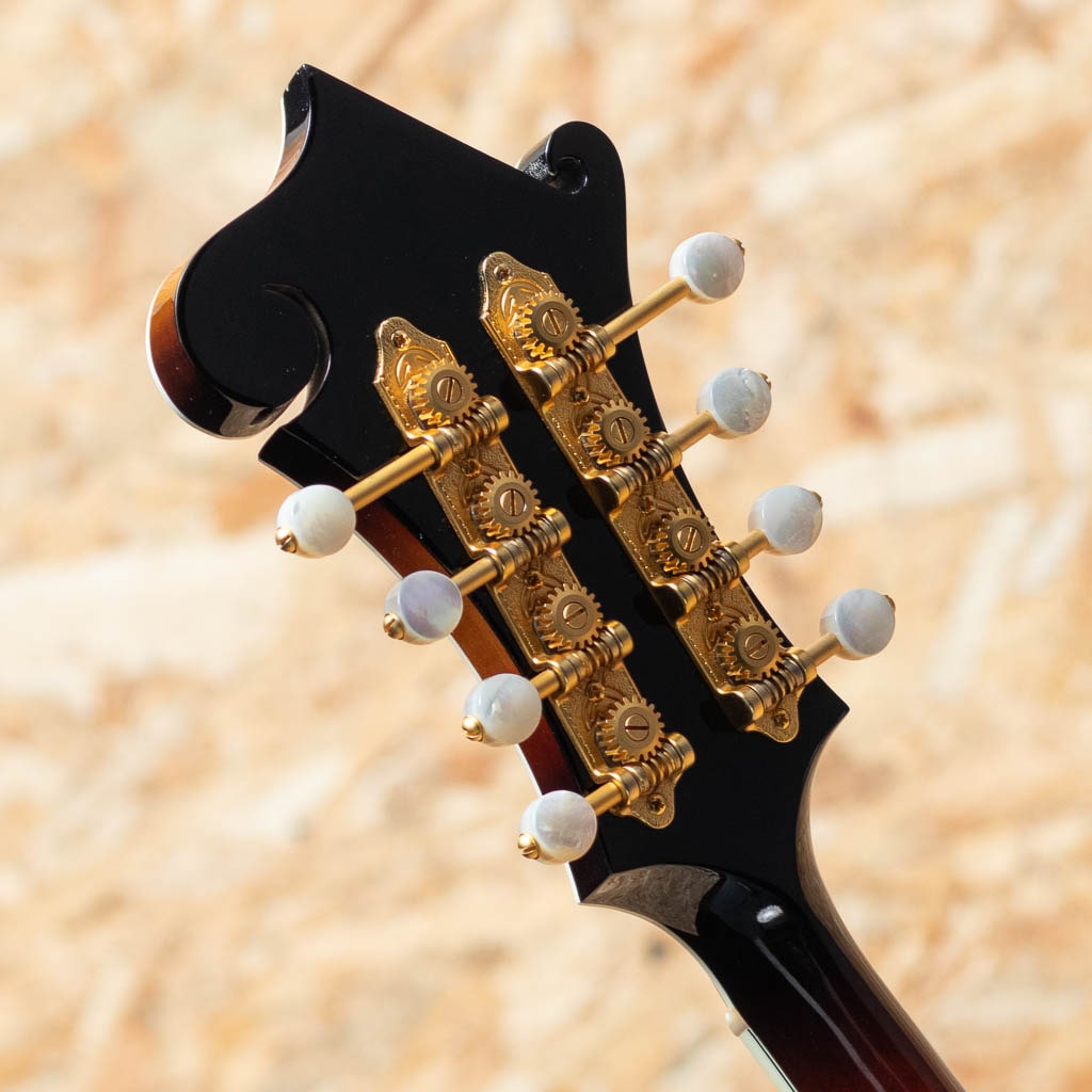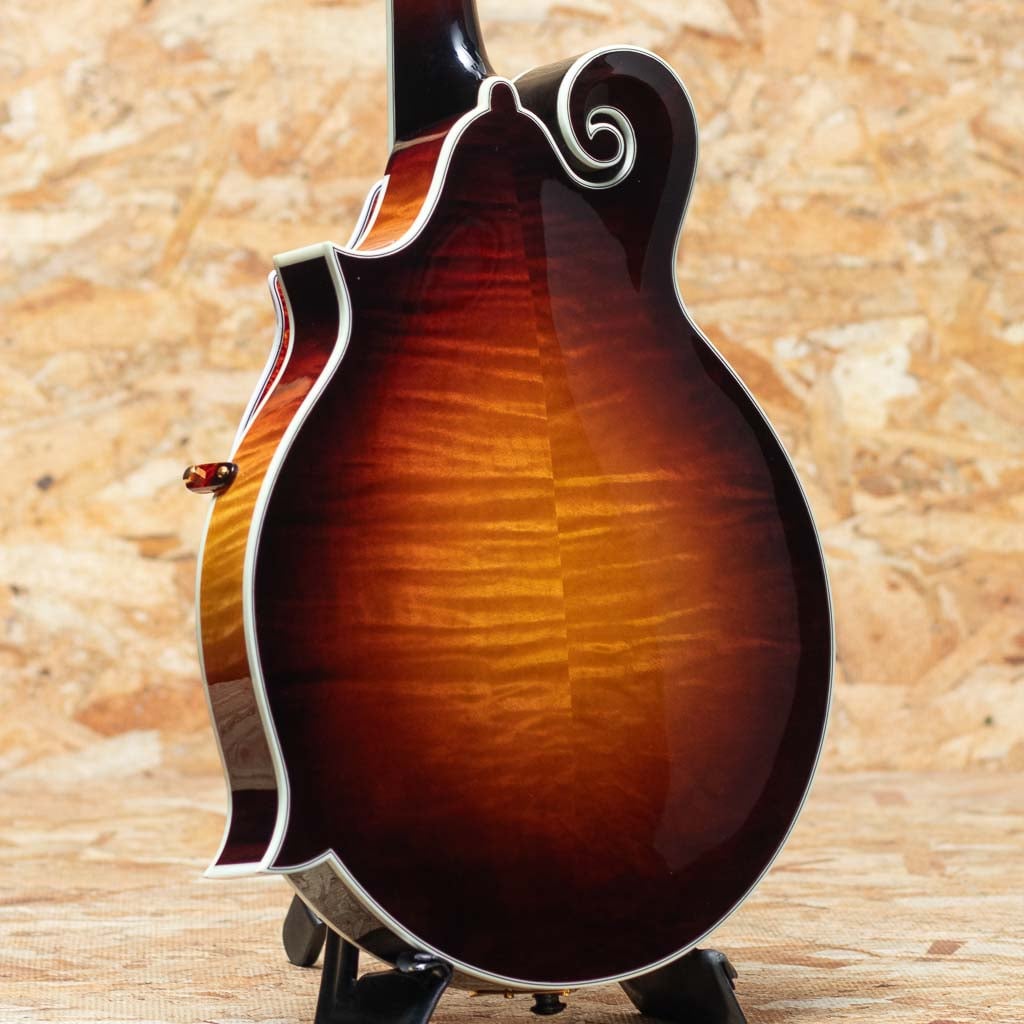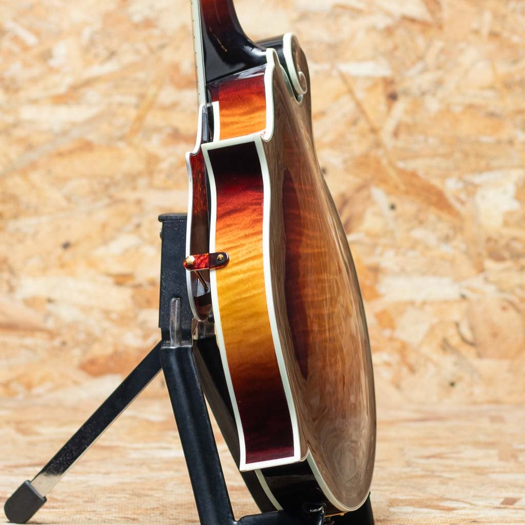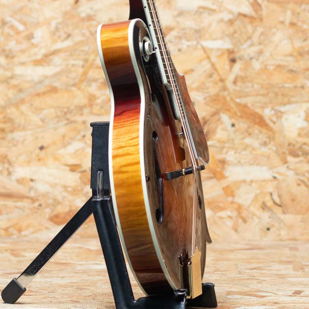 1922年にLloyd LoarがデザインしたオリジナルF-5マスターモデルを元に再生産されたGibson マンドリンの上位モデル”F-5L Fern” 2020年製極上USED品。現在ではオーダーも受付停止しており中古流通もまれな憧れのモデル。厳選した材を使用し丁寧にハンドクラフトされています。目の詰んだスプルーストップ、横にうっすらとフレイム杢の浮き出た良材を使用しています。サイド、バックは大きな鱗の様な深く大きな美しい杢をもつ極上のメイプルサイド&バック。ナット幅27mmのやや細めのトライアングルシェイプのネックに細めのフレット、ナットはパールナット、ヘッドには美しいアバロンでのファーンインレイが見事です。グローバーのゴールドペグで入手困難なパールノブを採用しています。エボニーのフラット指板で29f仕様。ボディー、指板、ヘッドはホワイトのバインディング、彫金でGibsonロゴを施されたゴールドテールピース、オリジナルのべっ甲柄ピックガード。インナーラベルにはマンドリストでありGibson Mandolinを監修するDavid Harveyのサインが入っています。光にかざすと見える程度の薄い拭きキズ、ピックガード表面のわずかな弾きキズが見える程度でゴールドパーツも色褪せもなく大変きれいな状態のニアミント品!ネックコンディション含めトータルコンディション抜群です。新品がオーダーできない今、非常に値打ちのある極上ユーズド品と言えるでしょう。甘太いギブソンらしいトーンはもちろん、どこか品の良い美しく華やかな響きでハイポジションまで音痩せせずにしっかりと前に抜けてくる感じはさすがのF-5モデル。F-5L Fernがこのコンディションででる事はまれです。この機会をお見逃しのないようお早めのご検討をおすすめします。オリジナルハードケース付属