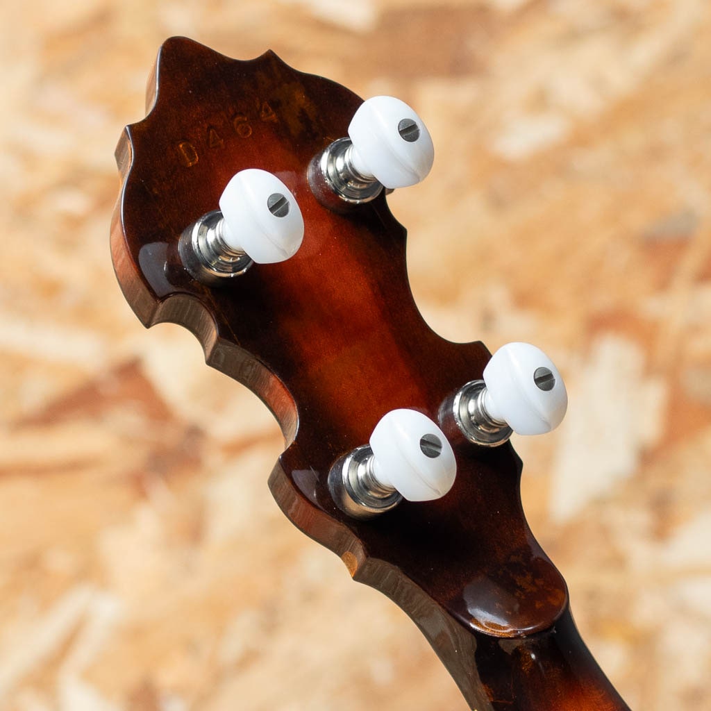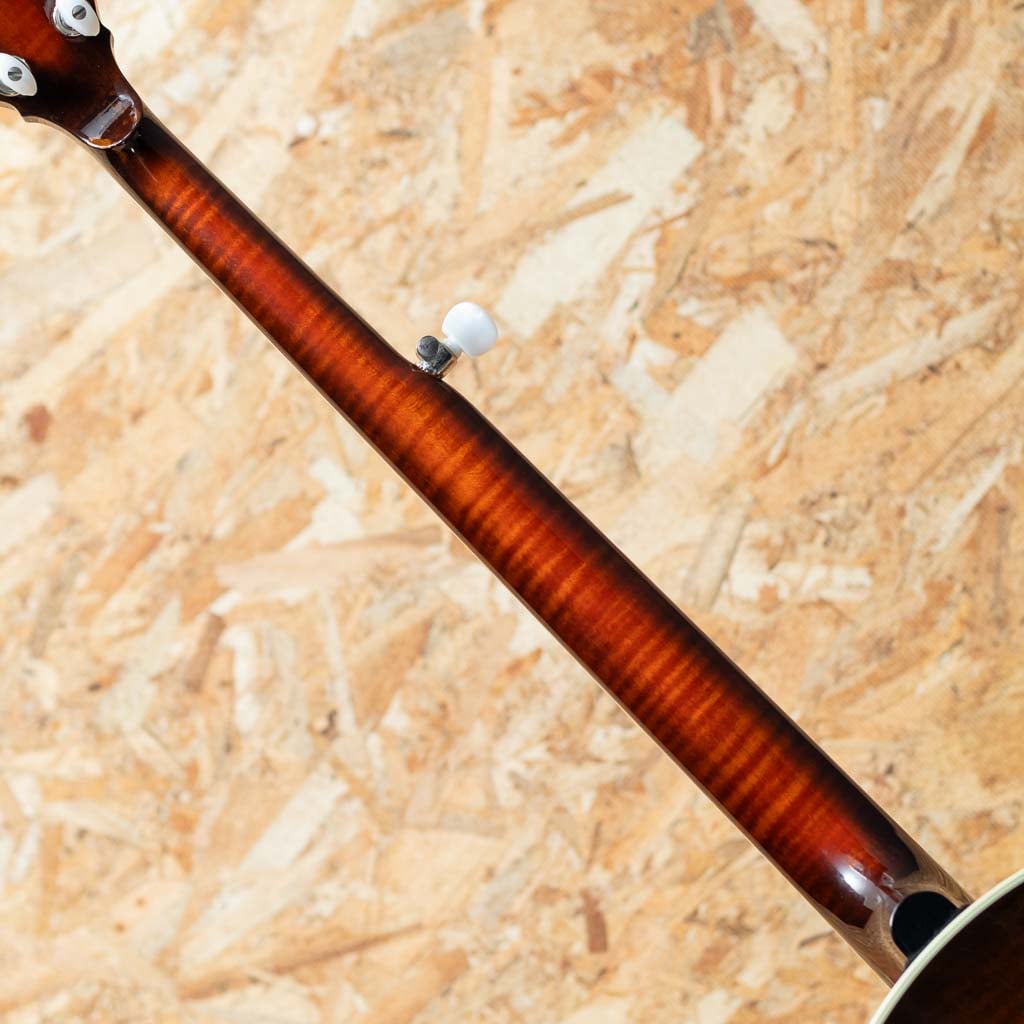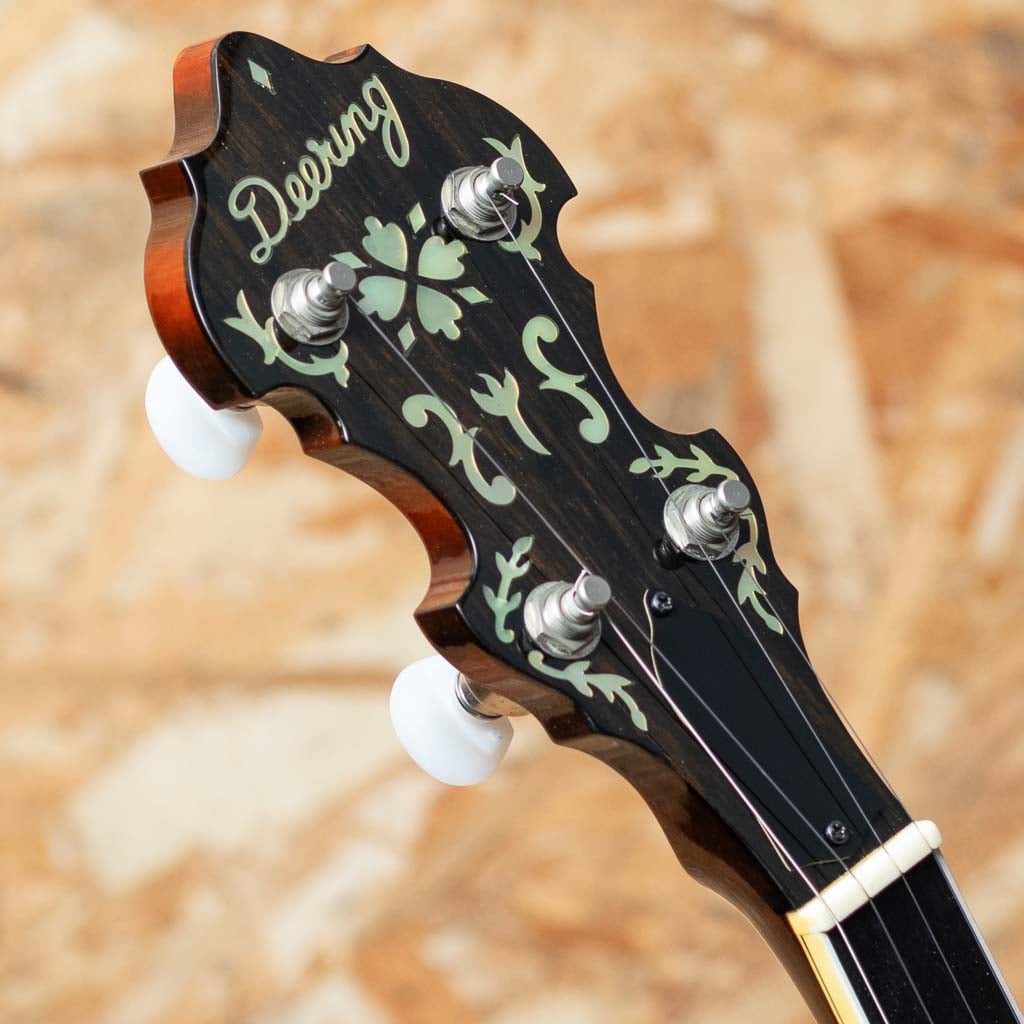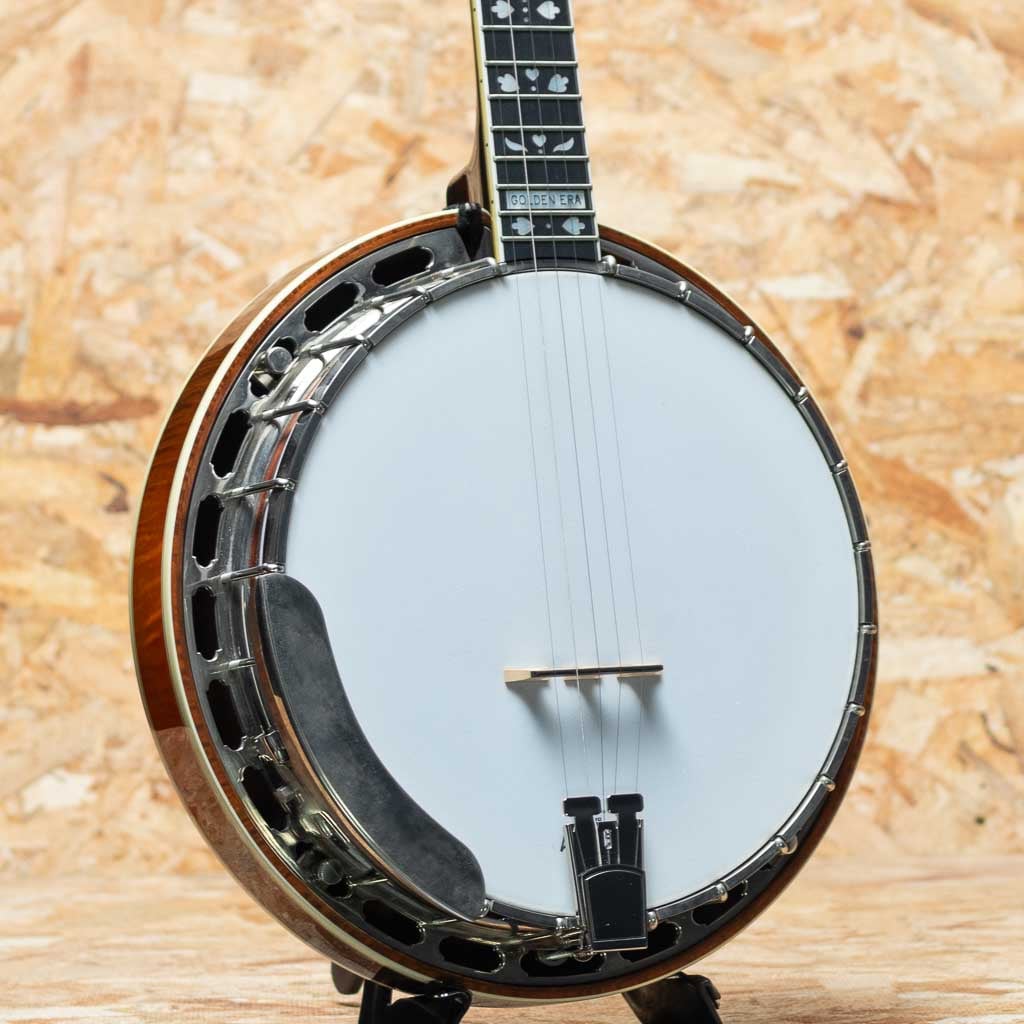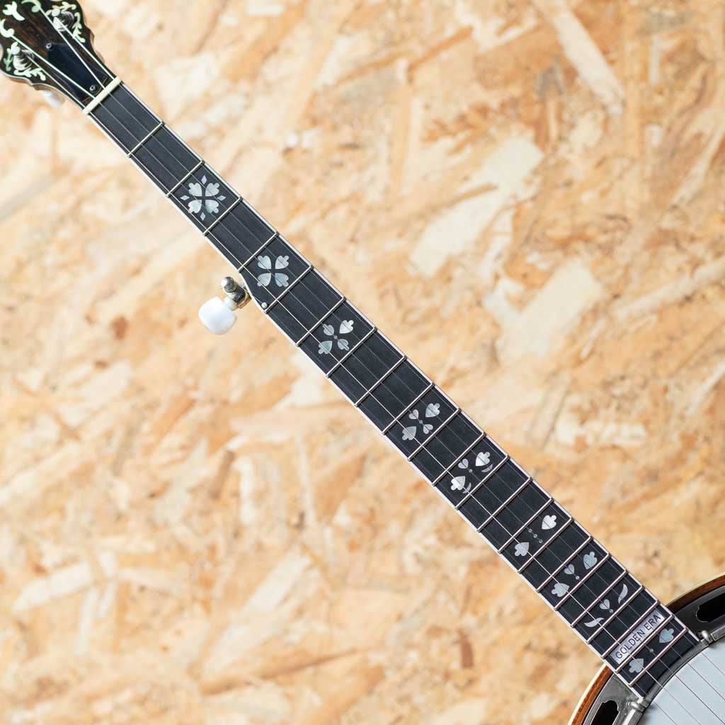 カリフォルニア州サンディエゴに工房を構えるバンジョーブランドDeering。現在でもU.S.Aにて生産を続ける数少ないバンジョーブランドの一つです。当器はDeering社が手掛けるブルーグラス・バンジョーの代表モデル “Golden Era”2003年製USED品。メイプルネック、ローズウッド指板にハーツアンドフラワーインレイ、メイプルリゾネーター、3plyメイプルリム、Deeringフラットヘッドトーンリング、1ピースフランジ、デュアルコーディネーターロッド。当店入荷後にバンジョーヘッドはREMOに交換、テールピースはプレストタイプに交換しています。ニッケルハードウエアー。ハードウェアーには曇りやくすみ、ヘッド裏の所々に塗装浮きが見られます。それら以外は使用キズなども少なく比較的キレイに保存されています。ネックコンディションも良好でフレットの減りもみられません。使用感少なめの狙い目USED品です。1930年代のGibson Mastertoneを強く意識し設計されたGolden Eraは、輪郭のはっきりした立ち上がりと、芯の太い力強い鳴りが特徴。ブルーグラスに求められる要素を高い次元で備えつつ、扱いやすさにも優れます。USA製の本格的バンジョーをお探しの方におすすめできる一本です。オリジナルハードケース付属