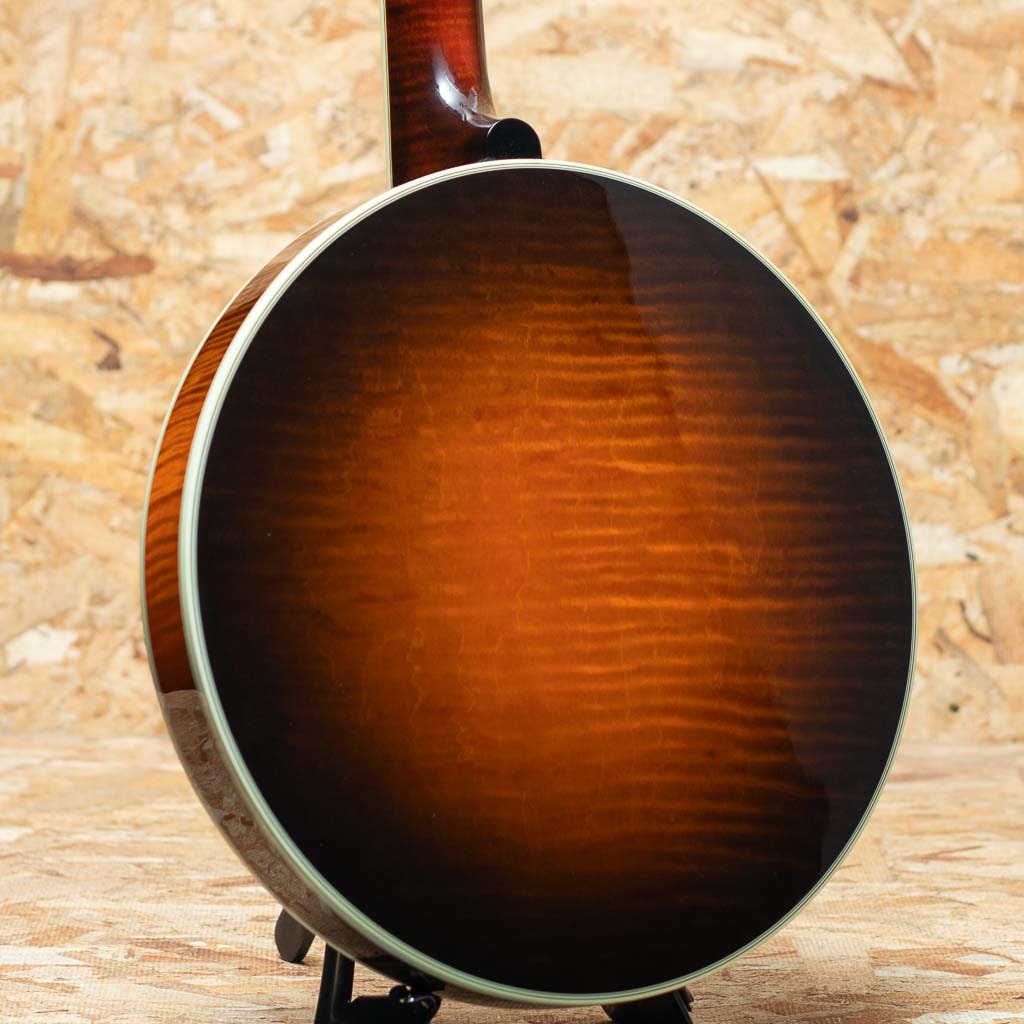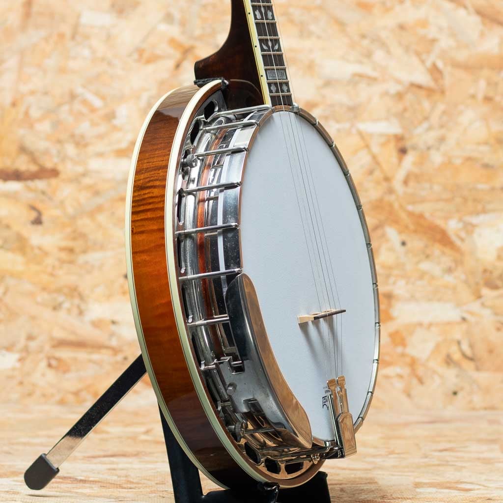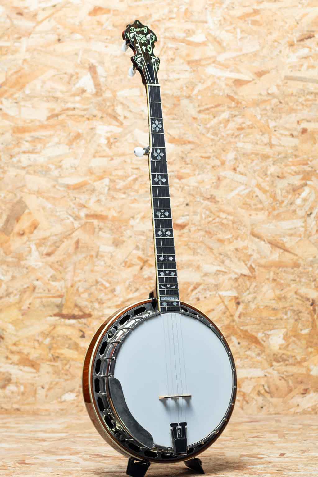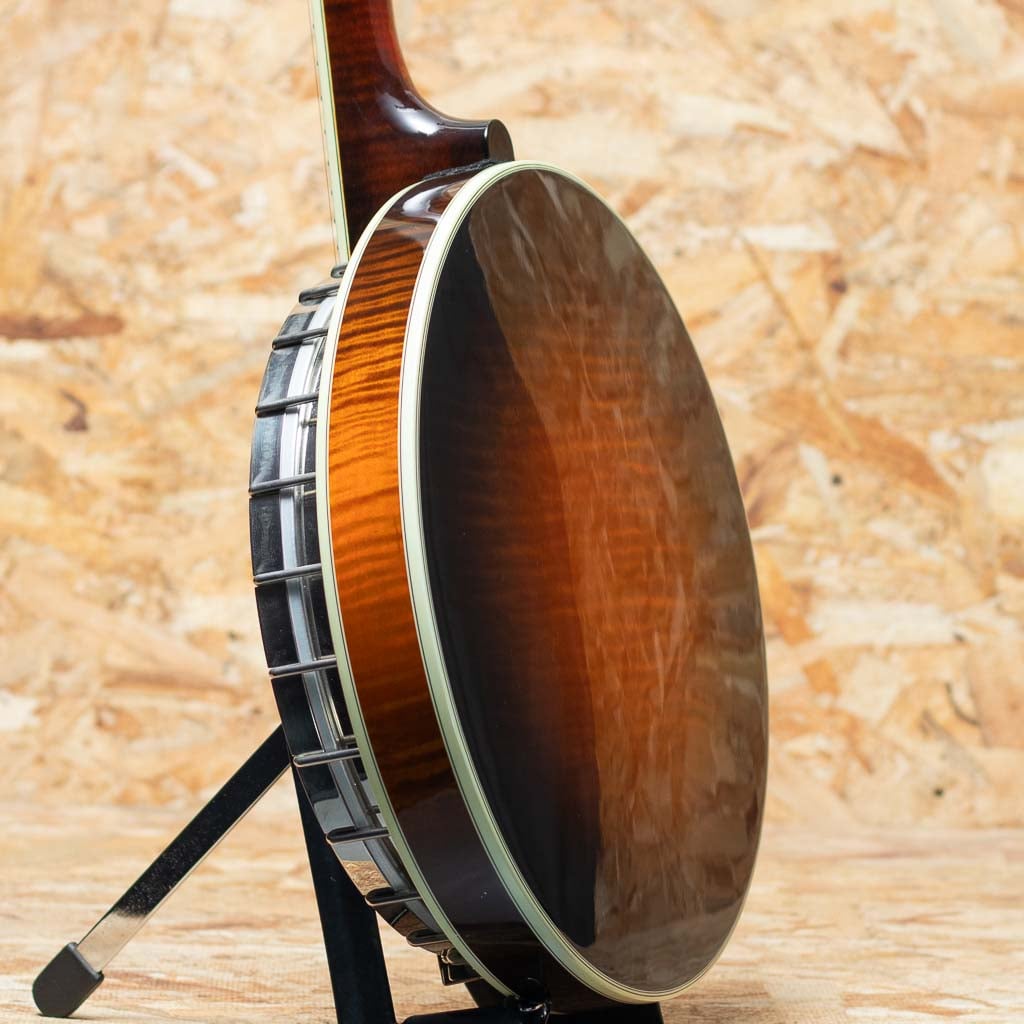 カリフォルニア州サンディエゴに工房を構えるバンジョーブランドDeering。現在でもU.S.Aにて生産を続ける数少ないバンジョーブランドの一つです。当器はDeering社が手掛けるブルーグラス・バンジョーの代表モデル “Golden Era”2003年製USED品。メイプルネック、ローズウッド指板にハーツアンドフラワーインレイ、メイプルリゾネーター、3plyメイプルリム、Deeringフラットヘッドトーンリング、1ピースフランジ、デュアルコーディネーターロッド。当店入荷後にバンジョーヘッドはREMOに交換、テールピースはプレストタイプに交換しています。ニッケルハードウエアー。ハードウェアーには曇りやくすみ、ヘッド裏の所々に塗装浮きが見られます。それら以外は使用キズなども少なく比較的キレイに保存されています。ネックコンディションも良好でフレットの減りもみられません。使用感少なめの狙い目USED品です。1930年代のGibson Mastertoneを強く意識し設計されたGolden Eraは、輪郭のはっきりした立ち上がりと、芯の太い力強い鳴りが特徴。ブルーグラスに求められる要素を高い次元で備えつつ、扱いやすさにも優れます。USA製の本格的バンジョーをお探しの方におすすめできる一本です。オリジナルハードケース付属