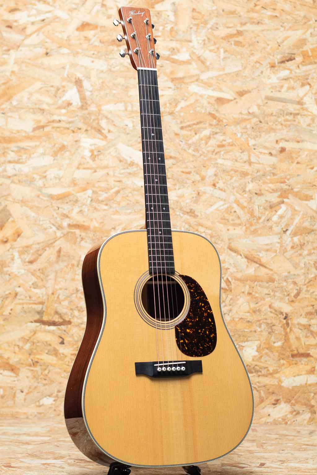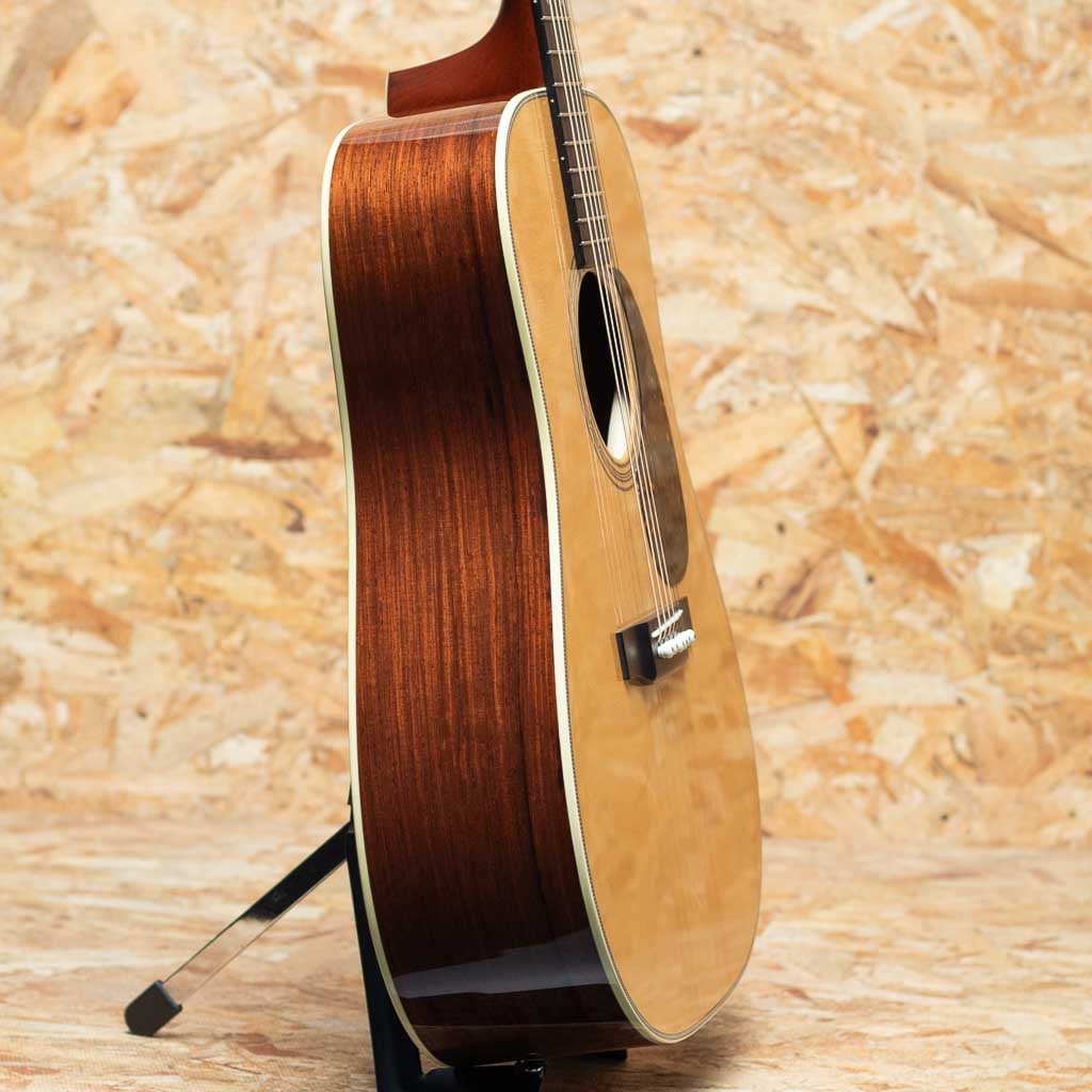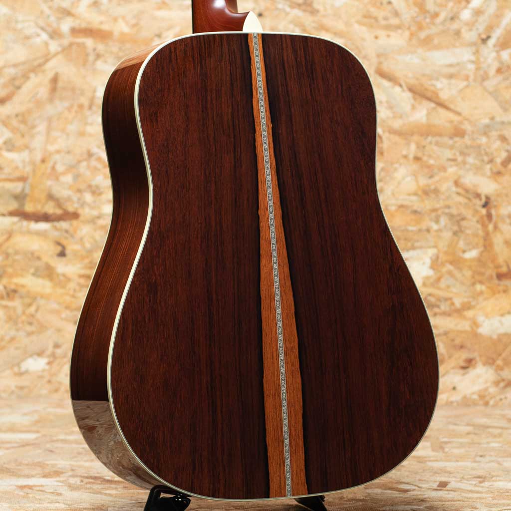 独自の工法と方法論で高品質のアコースティックギターを製作している長野県松本市の老舗ブランド"ヘッドウェイ"。多くのアコースティックギターファン、ミュージシャンたちに支持される日本製ギターを代表するブランドのひとつです。本器はHeadwayのマスタービルダー"降幡 新"氏作のカスタムモデル"HD-280 CUSTOM"2022年製USED品。ボディ材は師である百瀬譲りの優れた選定技術で選り抜かれた極上な材を使用しており、表板には4Aアディロンダックスプルース、サイド&バック材には長年ストックされていたプレミアムセレクトのマダガスカルローズウッドが使用されています。バックには個性を引き立てるアクセントとなるように、センター部分にサップの入った杢が採用されています。ホンジュラスマホガニー1Pネック、エボニー指板&ブリッジ、34セミフォワードシフテッドスキャロップドXブレイシング、ゴトーオープンバックペグ、筆記体ロゴ。敢えて飾らないことにより、飽きが来なく、長く愛されるデザインとなっています。軽いタッチでもしっかりとしたボリュームで迫力のあるサウンド。塗装も音色を最大限に引き出せるよう極薄ラッカーフィニッシュとなっています。バランスも良く、ストローク、指弾きと広いスタイルでお使い頂ける印象です。過去にPUが取り付けられており、ジャックサイズの穴が空いております。わずかに軽微なフレットの摩耗は見られますが、目立つ傷なども特に見受けられず、きれいなコンディションが保たれております。質実剛健、長く育てるギターをコンセプトに製作した1本。オリジナルハードケース付属です。