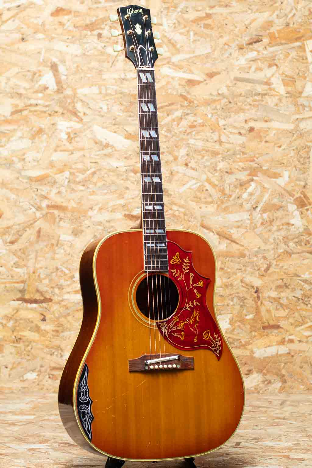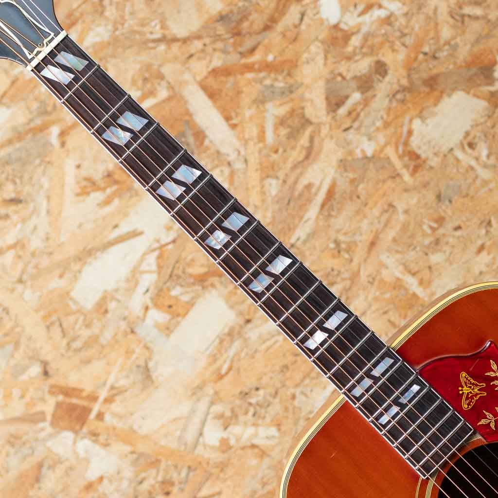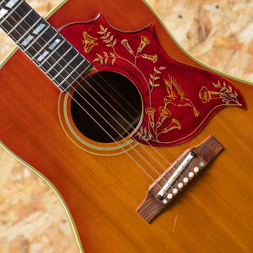 1960年の発売以来、ギブソンスクエアショルダーボディの定番モデルとして人気を博しているハミングバード。ボディカラー、ハチドリを象ったピックガードを始め、個性溢れる外観とオールラウンドなサウンドキャラクターを兼ね備えています。本器は1965年製の1本。1965年はレギュラーグリップからナローネックに17度ヘッドアングルから14度ヘッドアングルに変更された過渡期。こちらはレギュラーネック、17度ヘッド角、フルスケール仕様です。スプルーストップ、マホガニーサイド&バック、ハカランダ指板&ブリッジ、オリジナルピックガード、ダブルパラレログラム指板インレイ、クルーソンゴールドペグ、ノンスキャロップブレイシング。フルスケール仕様も相まって、かき鳴らすと歯切れがよく気持ちの良いパーカッシブなサウンドが感じられます。胴鳴りもよくガシガシと弾いていたい1本です。ボディ左下付近に似たような柄のピックガードが取り付けられております。こちらの部分に割れの修理が行われており、裏側から補強もされております。リフレット済みでプレイコンディションも良好。ピックガードの模様もきれいに残っており、その他全体的にもきれいな状態が保たれております。色味の風合いも良く見て弾いて楽しんで頂ける1本。ハードケース付属です。