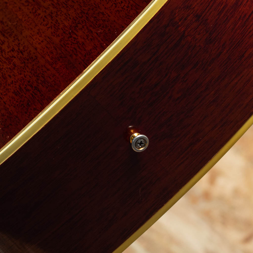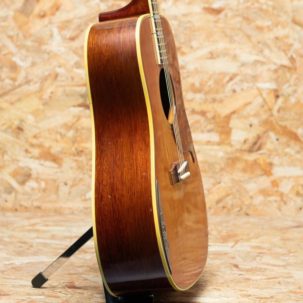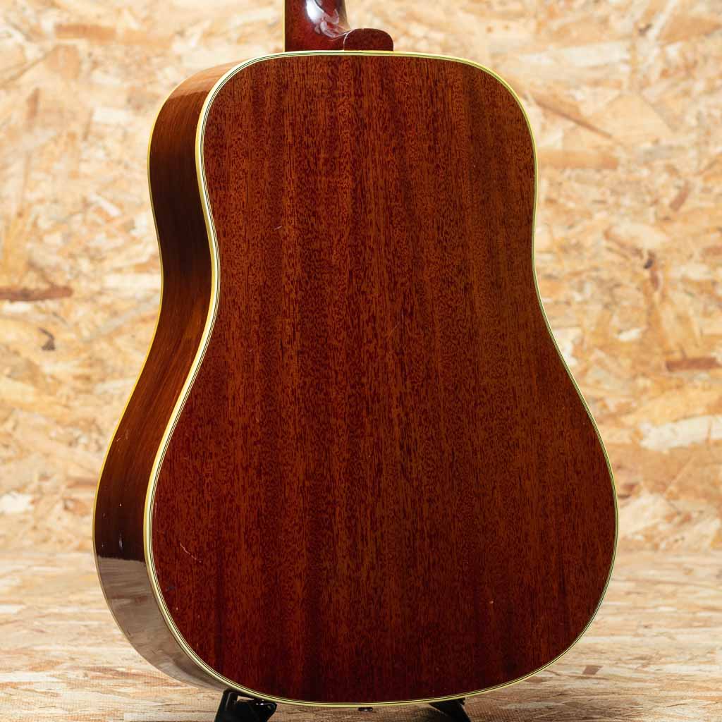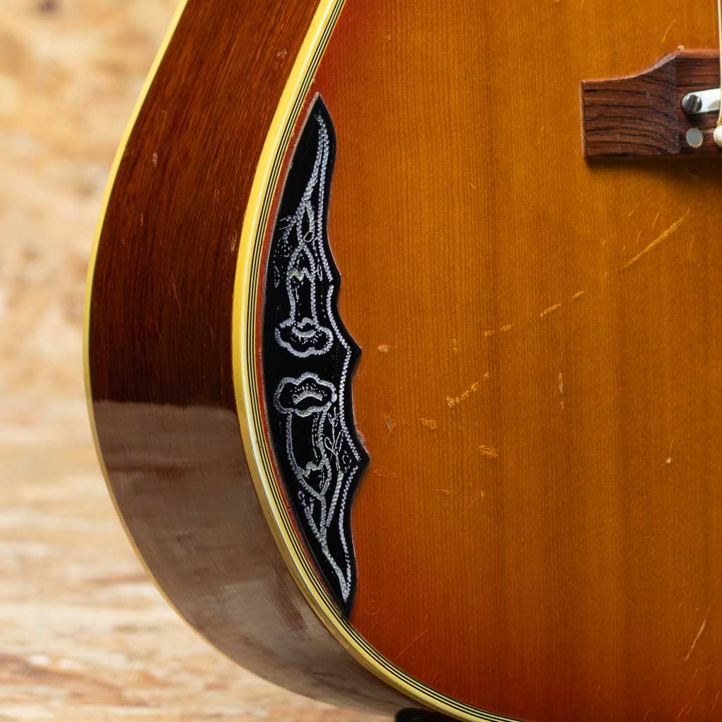 1960年の発売以来、ギブソンスクエアショルダーボディの定番モデルとして人気を博しているハミングバード。ボディカラー、ハチドリを象ったピックガードを始め、個性溢れる外観とオールラウンドなサウンドキャラクターを兼ね備えています。本器は1965年製の1本。1965年はレギュラーグリップからナローネックに17度ヘッドアングルから14度ヘッドアングルに変更された過渡期。こちらはレギュラーネック、17度ヘッド角、フルスケール仕様です。スプルーストップ、マホガニーサイド&バック、ハカランダ指板&ブリッジ、オリジナルピックガード、ダブルパラレログラム指板インレイ、クルーソンゴールドペグ、ノンスキャロップブレイシング。フルスケール仕様も相まって、かき鳴らすと歯切れがよく気持ちの良いパーカッシブなサウンドが感じられます。胴鳴りもよくガシガシと弾いていたい1本です。ボディ左下付近に似たような柄のピックガードが取り付けられております。こちらの部分に割れの修理が行われており、裏側から補強もされております。リフレット済みでプレイコンディションも良好。ピックガードの模様もきれいに残っており、その他全体的にもきれいな状態が保たれております。色味の風合いも良く見て弾いて楽しんで頂ける1本。ハードケース付属です。