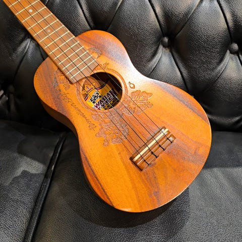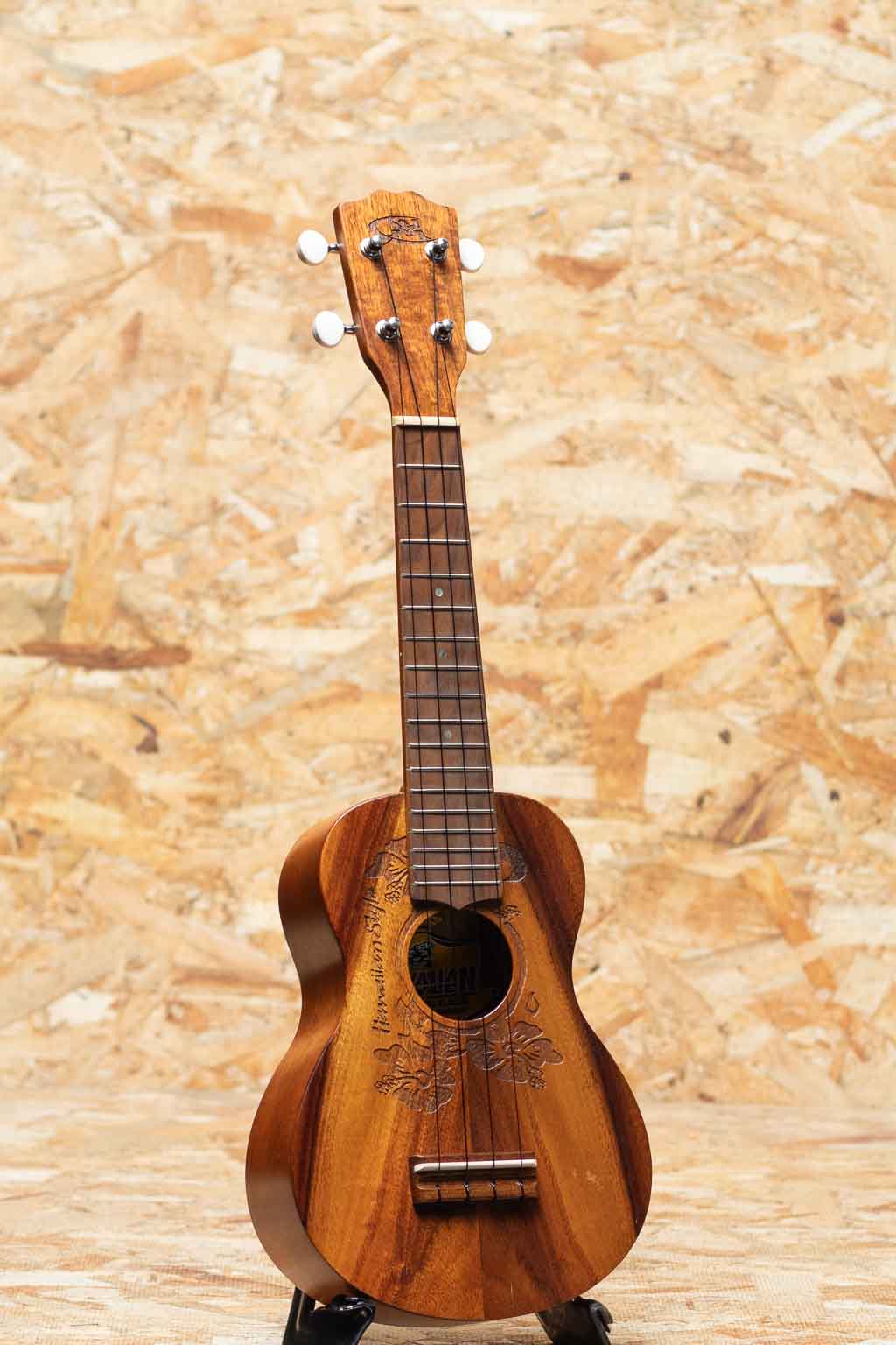 1993年に設立、現在ハワイ島にてデレクシミズにより製作されているG-stringウクレレ。アーティストからの支持の高さなどからどんどん人気を呼び、ハワイアンウクレレの代表的なブランドどとしてプロを始め幅広い方々に愛用されています。本器はハイビスカスデザインのレーザー加工が施されたソプラノモデルのUSED品。ハワイアンコアボディ、マホガニーネック、ローズウッド指板&ブリッジ、グローバーペグ、アバロン指板ドットインレイ。当時はオワフの工房でチームで製造されており、手の届きやすい価格帯にて幅広く展開。たちまち人気を集め、ハワイアン3大ブランドの一つとまで称されていました。ハワイアンコアらしい甘みたっぷりのサウンドで、素朴さと愛らしさも感じるハワイメイドならではの味わい。部分的な傷や少しトップの沈みなどは見られますが使用上は問題のない状態です。ハイビスカスデザインがおしゃれでルックスも良い1本です。チップボードケースが付属します。
