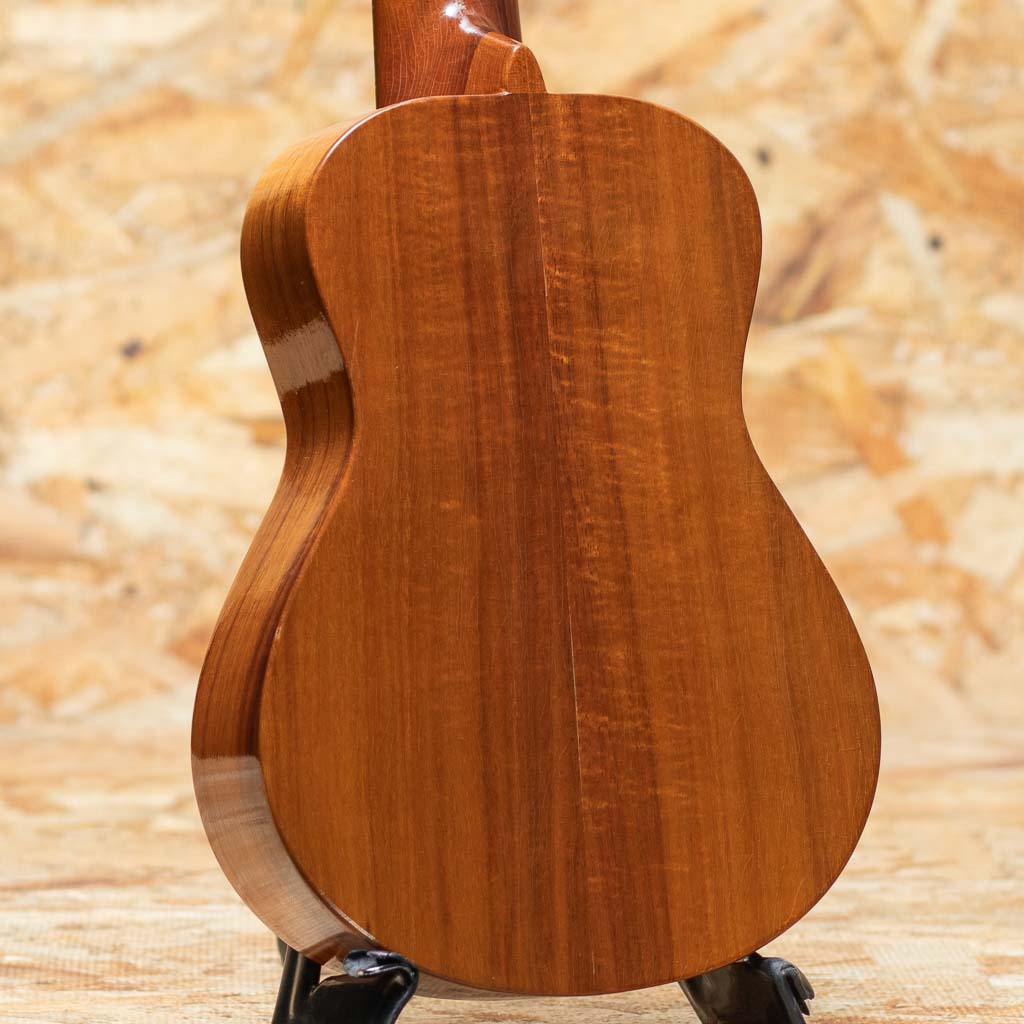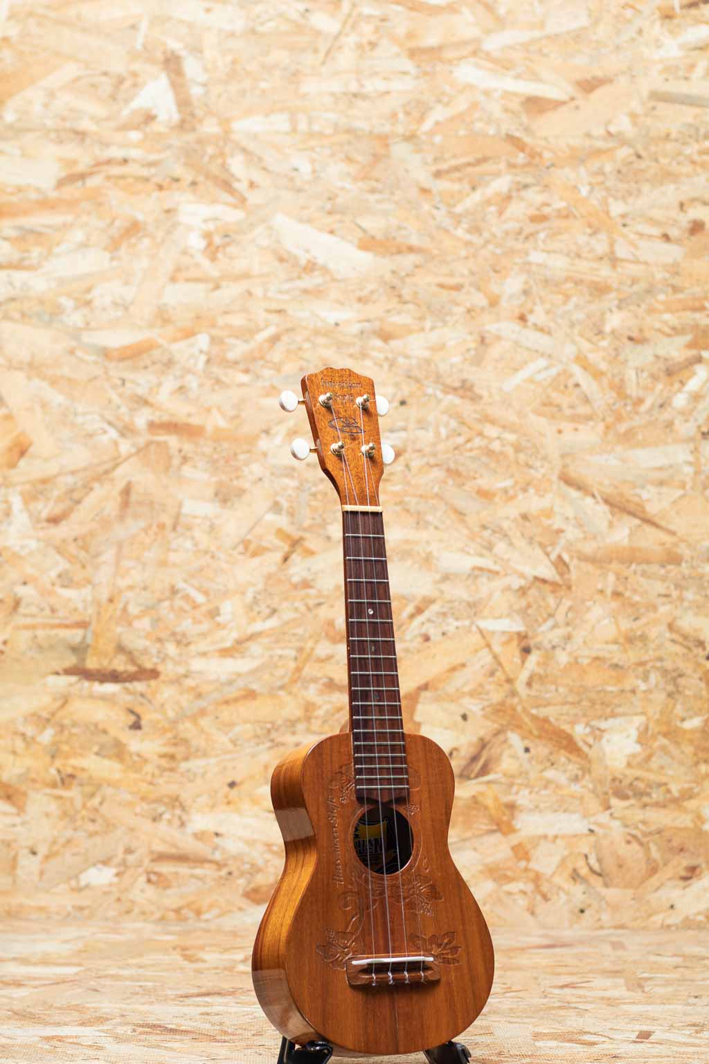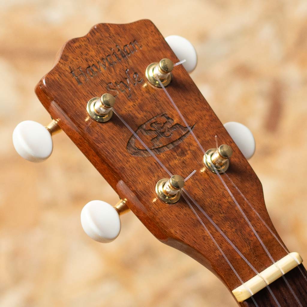 1993年に設立、現在ハワイ島にてデレクシミズにより製作されているG-stringウクレレ。アーティストからの支持の高さなどからどんどん人気を呼び、ハワイアンウクレレの代表的なブランドどとしてプロを始め幅広い方々に愛用されています。本器はハイビスカスデザインのレーザー加工が施されたソプラノモデルのUSED品。ハワイアンコアボディ、マホガニーネック、ローズウッド指板&ブリッジ、グローバーゴールドペグ、アバロン指板ドットインレイ。当時はオワフの工房でチームで製造されており、手の届きやすい価格帯にて幅広く展開。たちまち人気を集め、ハワイアン3大ブランドの一つとまで称されていました。ハワイアンコアらしい甘みたっぷりのサウンドで、素朴さと愛らしさも感じるハワイメイドならではの味わい。表板ブリッジ下のセンター部分に表面上の軽微な割れの補修やよく見られるウェザーチェックが全体に出ていますが、使用感はあまり感じられない状態です。ハイビスカスデザインがおしゃれでルックスも良い1本です。チップボードケースが付属します。