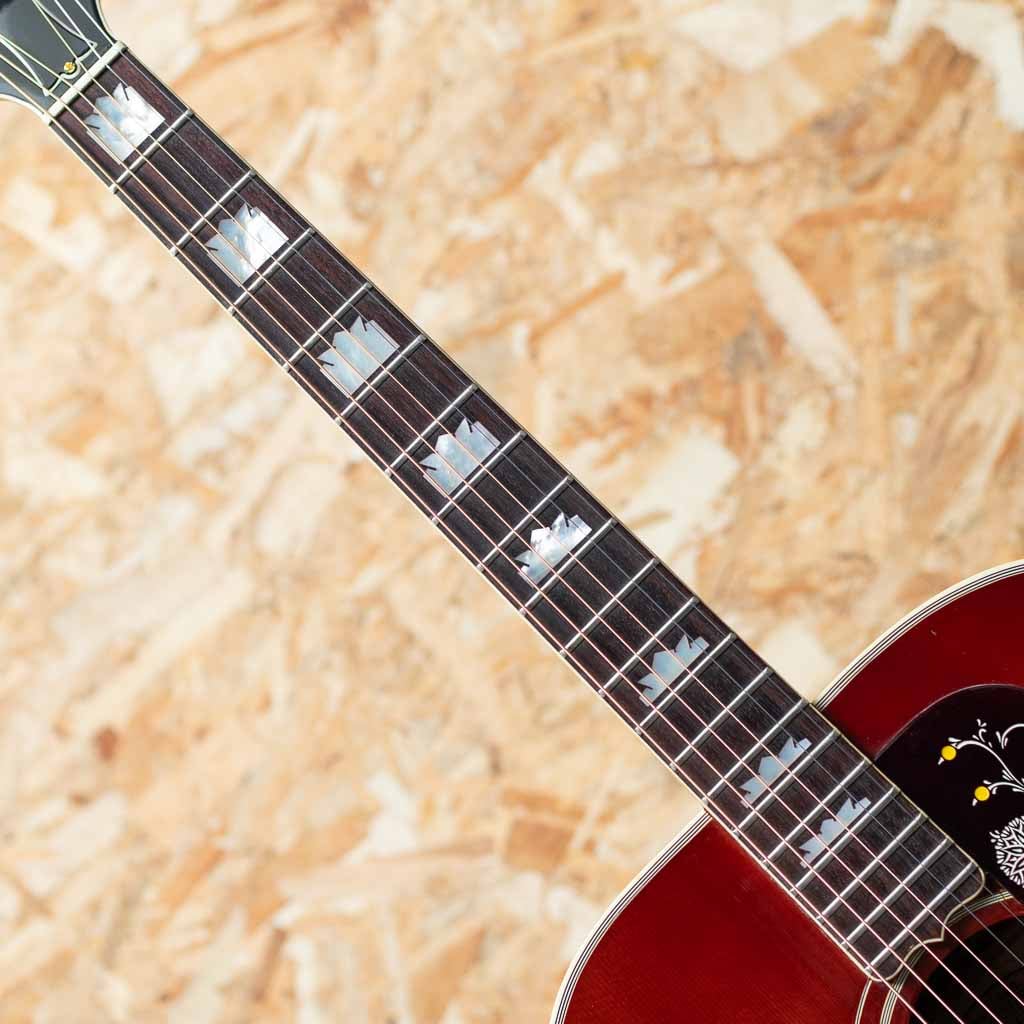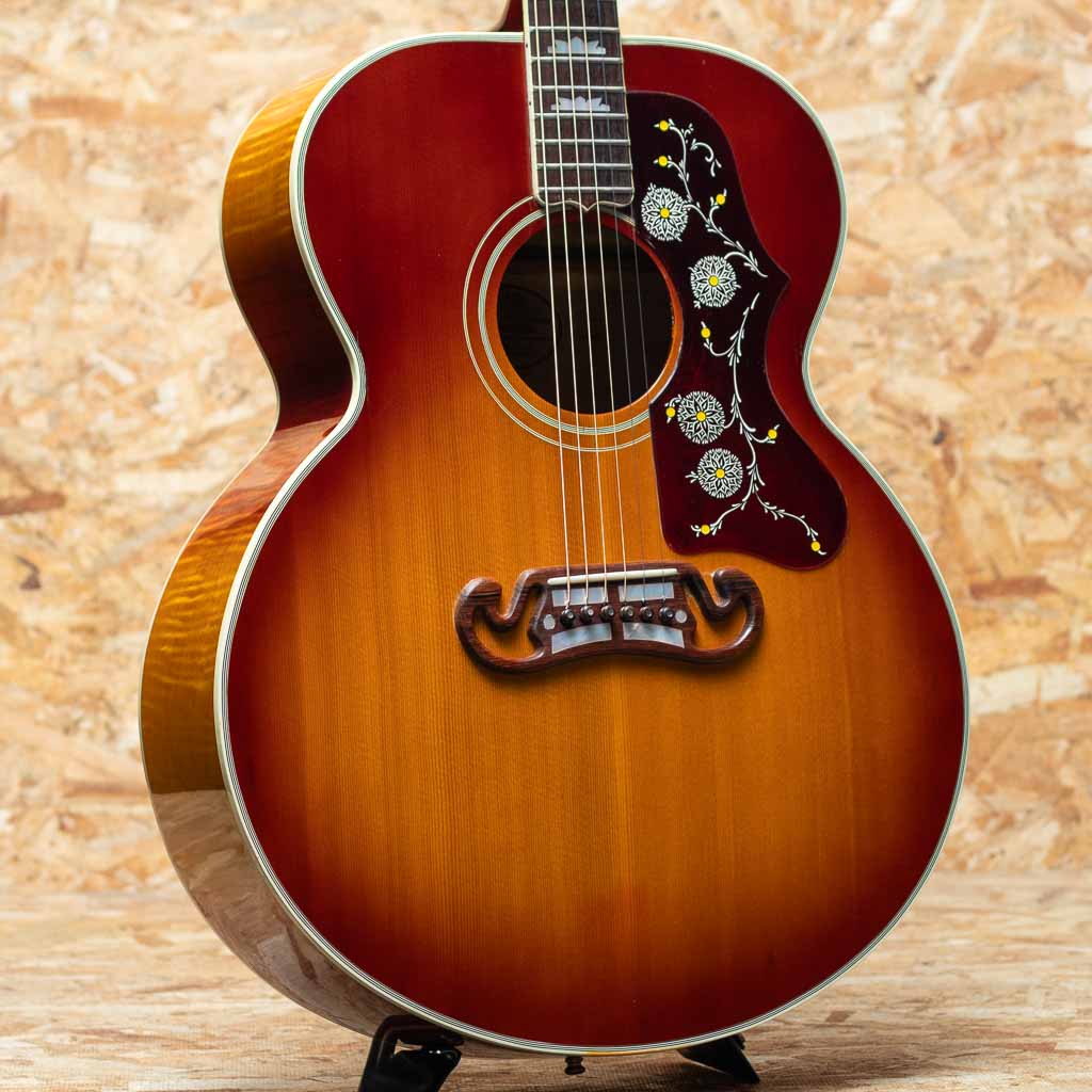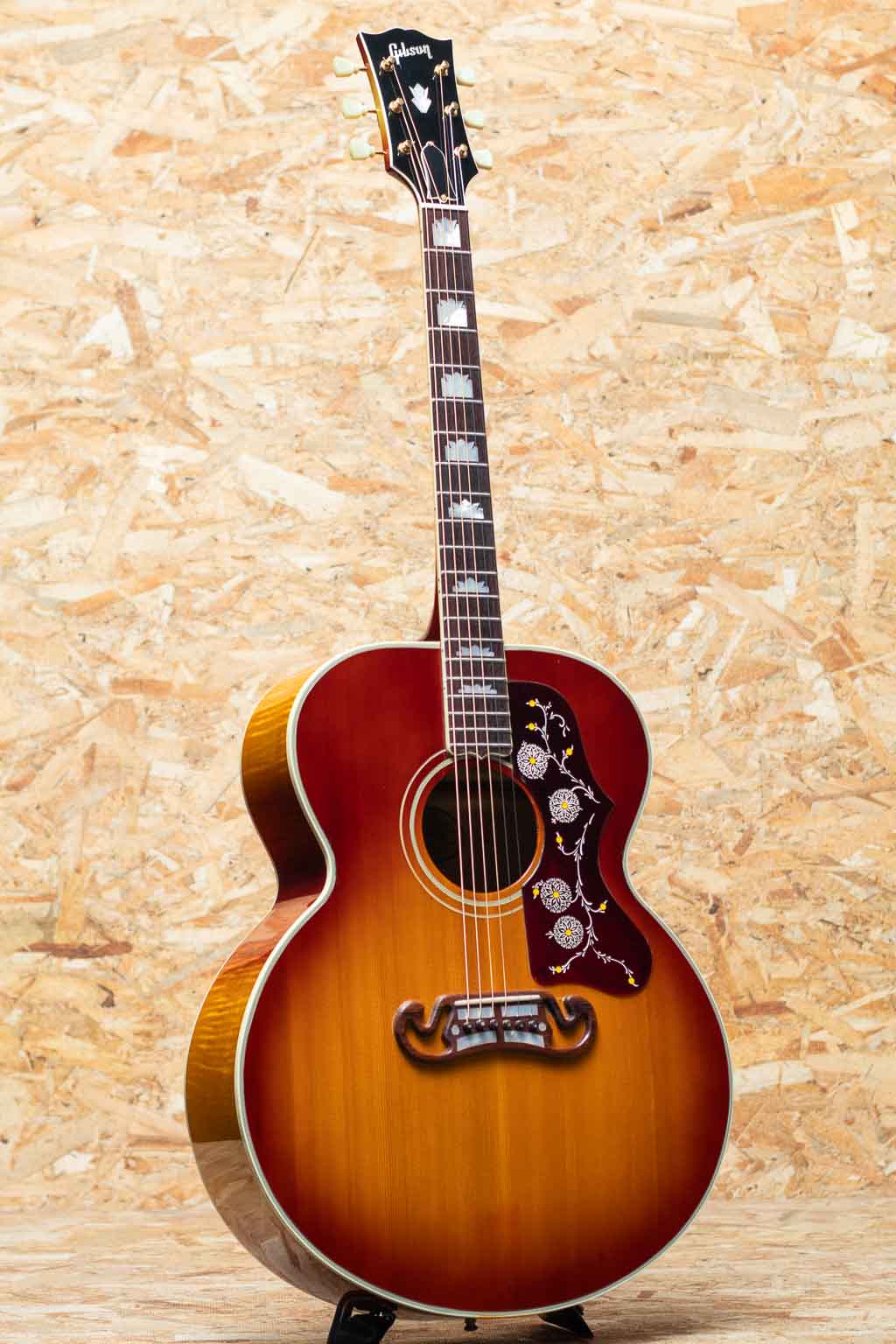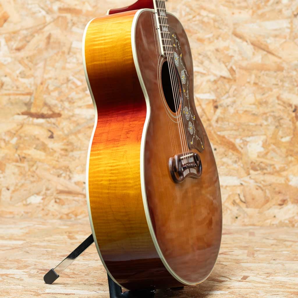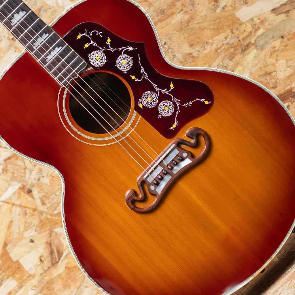 キング・オブ・フラットトップとまで言われるギター"SJ-200"。大音量が求められていたその頃の流れに乗って1937年に製造が開始されたギブソンの最高級モデルです。本器は1954年製Vintage品。スプルーストップ、メイプルサイド&バック、メイプルネック、リプレイスローズウッド指板、パールインレイオープンムスタッシュブリッジ、ライン入りベッコウセルピックガード、クラウンヘッドロゴ&指板インレイ。トップのピックガードの縁に二箇所、ロウワバウト6弦側のアウトライン付近の端に一箇所のクラック補修があり、ボディサイドには二箇所のクラック補修(細い接ぎ木あり)があります。全体のリフィニッシュがなされている他、クルーソンペグは同型のものへ交換、バックには赤い線が一本見受けられます。面が広く質量があるボディーにもかかわらずフラットピッキングと指弾きのレスポンスの差が少なく、迫力ある音量。弦高やネック周りのコンディションは良好でしっかりと手入れのされたVintageアイテムです。これからもガシガシとご使用いただけます。手入れ箇所が多いため、非常にお買い得なプライスでのご提供、ぜひご検討ください。GIBSON社ハードケース付属。