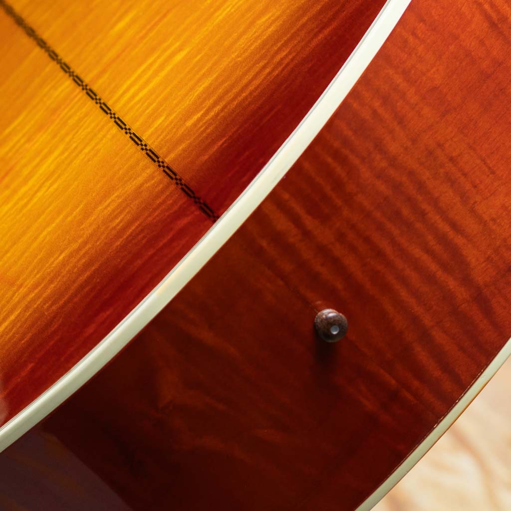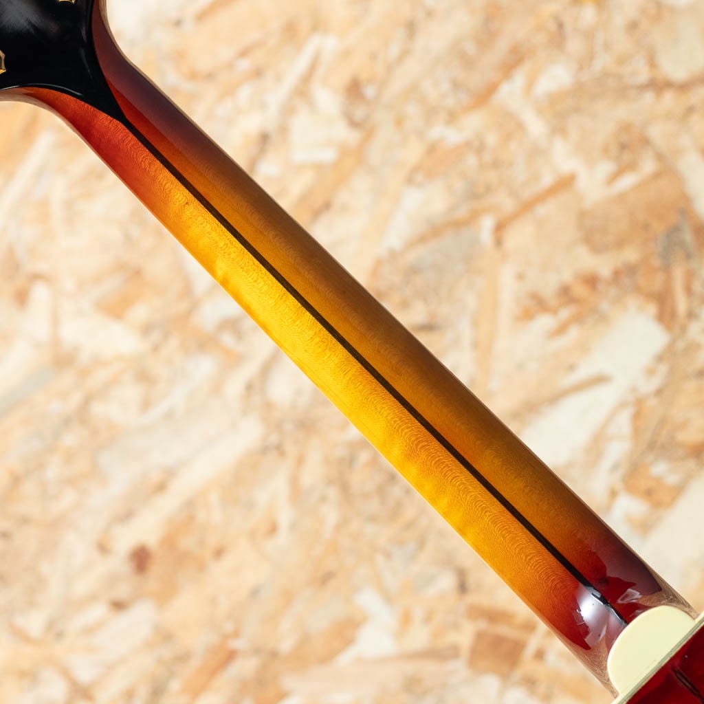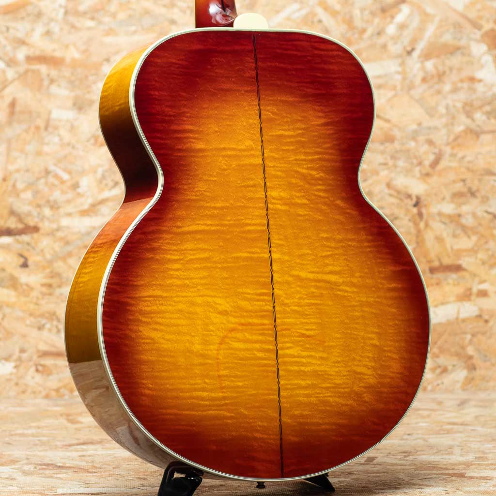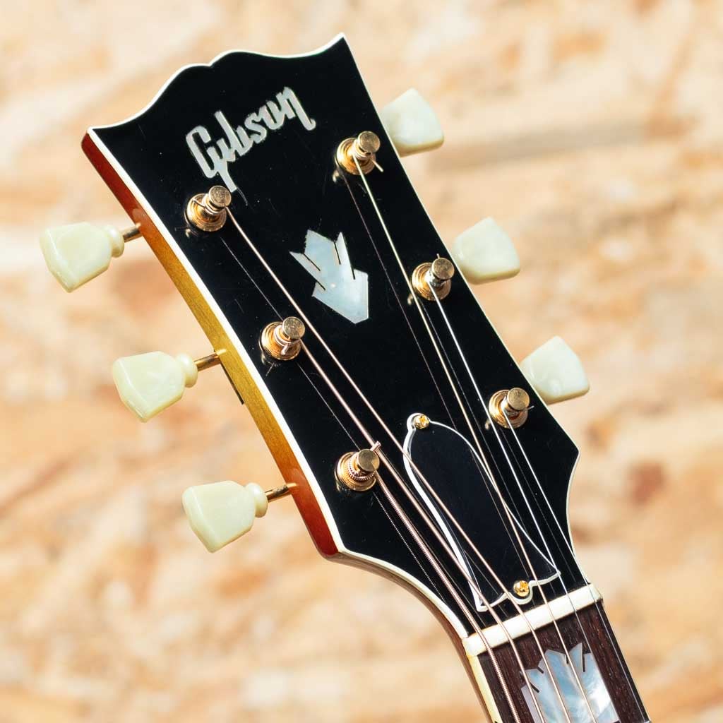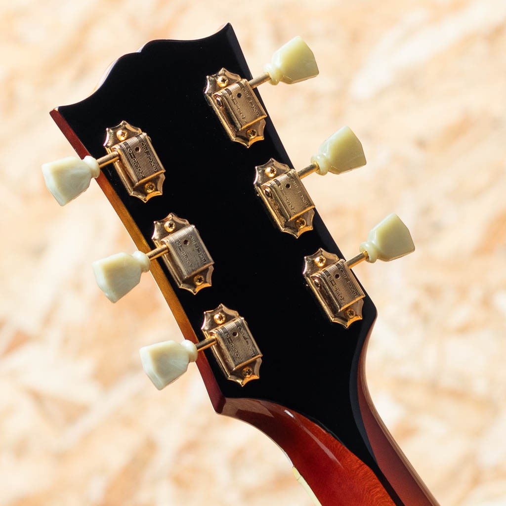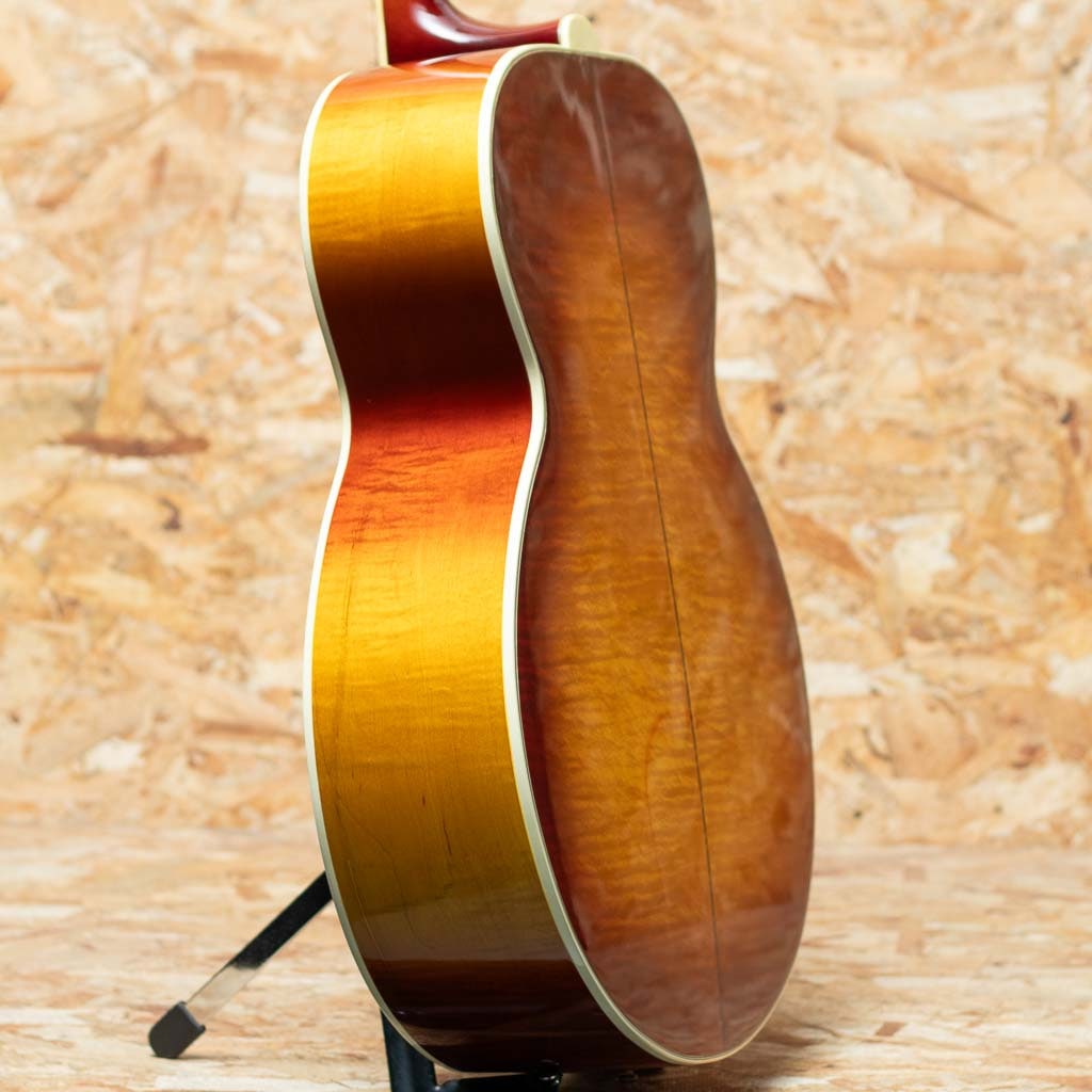 キング・オブ・フラットトップとまで言われるギター"SJ-200"。大音量が求められていたその頃の流れに乗って1937年に製造が開始されたギブソンの最高級モデルです。本器は1954年製Vintage品。スプルーストップ、メイプルサイド&バック、メイプルネック、リプレイスローズウッド指板、パールインレイオープンムスタッシュブリッジ、ライン入りベッコウセルピックガード、クラウンヘッドロゴ&指板インレイ。トップのピックガードの縁に二箇所、ロウワバウト6弦側のアウトライン付近の端に一箇所のクラック補修があり、ボディサイドには二箇所のクラック補修(細い接ぎ木あり)があります。全体のリフィニッシュがなされている他、クルーソンペグは同型のものへ交換、バックには赤い線が一本見受けられます。面が広く質量があるボディーにもかかわらずフラットピッキングと指弾きのレスポンスの差が少なく、迫力ある音量。弦高やネック周りのコンディションは良好でしっかりと手入れのされたVintageアイテムです。これからもガシガシとご使用いただけます。手入れ箇所が多いため、非常にお買い得なプライスでのご提供、ぜひご検討ください。GIBSON社ハードケース付属。
