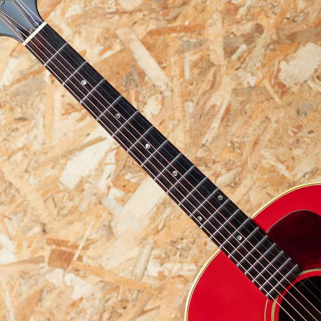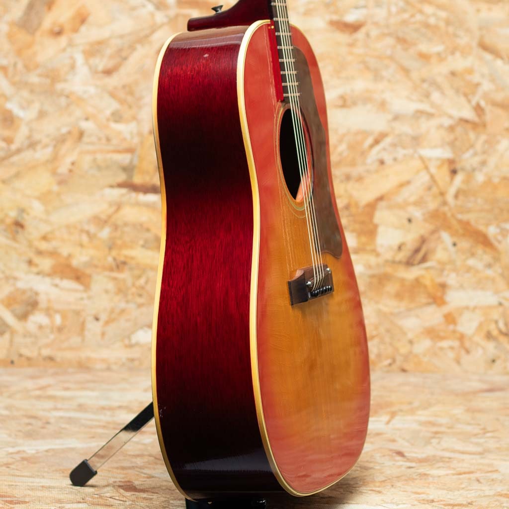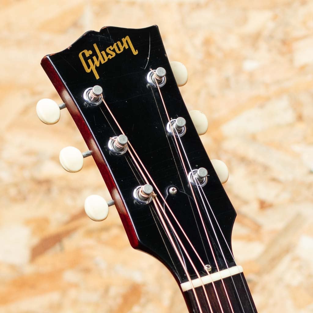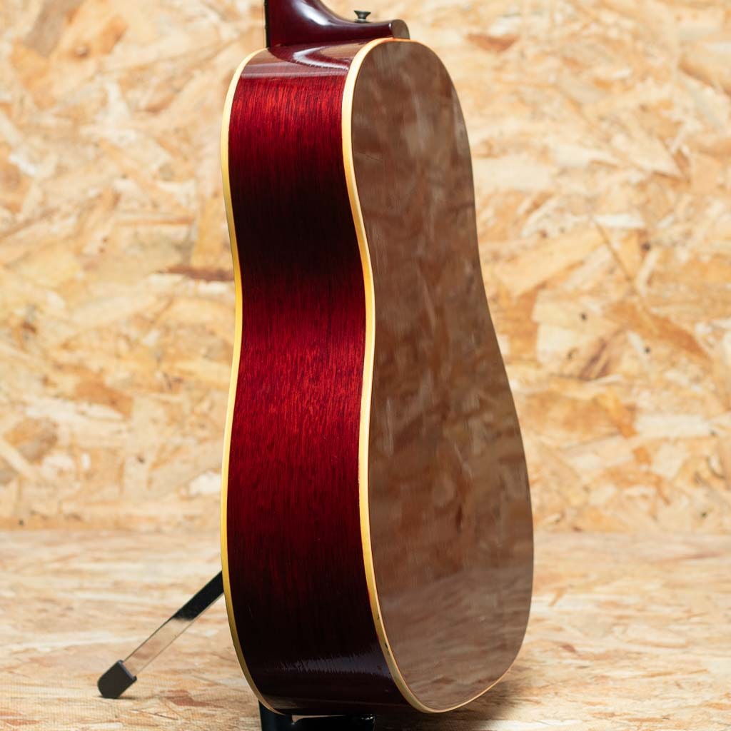 フラットトップにおけるもうひとつの憧れ、ワーキングホースGibson"J-45"。1942年に登場した"J-45"、その後幾つかのマイナーチェンジを繰り返しながらも、今尚トップシーンで欠かせないGibsonを代表するラウンドショルダーボディのジャンボモデル。本器は1967年に製造されたチェリーサンバーストカラーの1本。スプルーストップ、マホガニーサイド&バック、マホガニーネック、ハカランダ指板&ブリッジ、アジャスタブルサドル、オリジナルクルーソン3連ペグ、14度ヘッド角、ノンスキャロップドXブレイシング。ナローネック仕様による纏まりの良く小気味よいサウンド。ボディ全体にウェザーチェックが入っており、経年を経た良いルックスです。ボディにはいくつか打痕が見られる他、塗装のチップ、ボディバック面を中心に擦り傷が見られるなど年代相応の使用感がございます。過去にピックアップの取り付けがされており、ボディエンドにはジャックサイズの穴が空いた状態です。ペグは一度、同型のペグにネジ穴を埋めての交換がされておりますが、現在はオリジナルペグが取り付けられております。ネックヒールにはストラップピン取付済み。過去にナット交換を済ませており、演奏性は問題ございません。チェリーサンバーストの色味のきれいに残った一本。ハードケース付属。