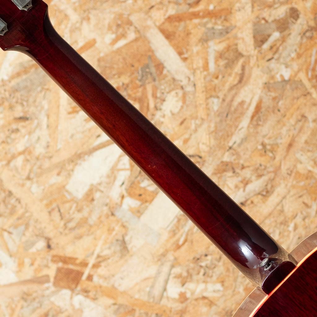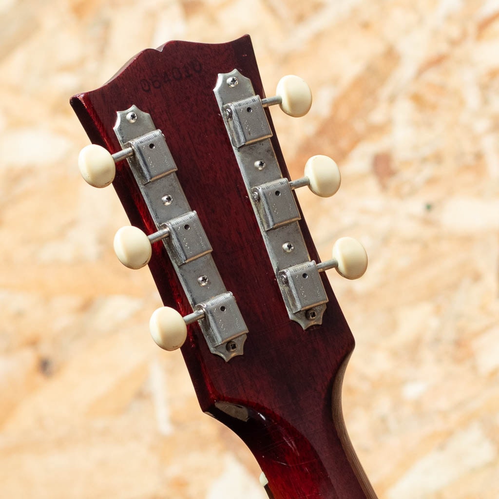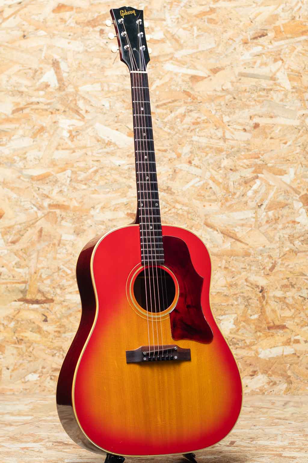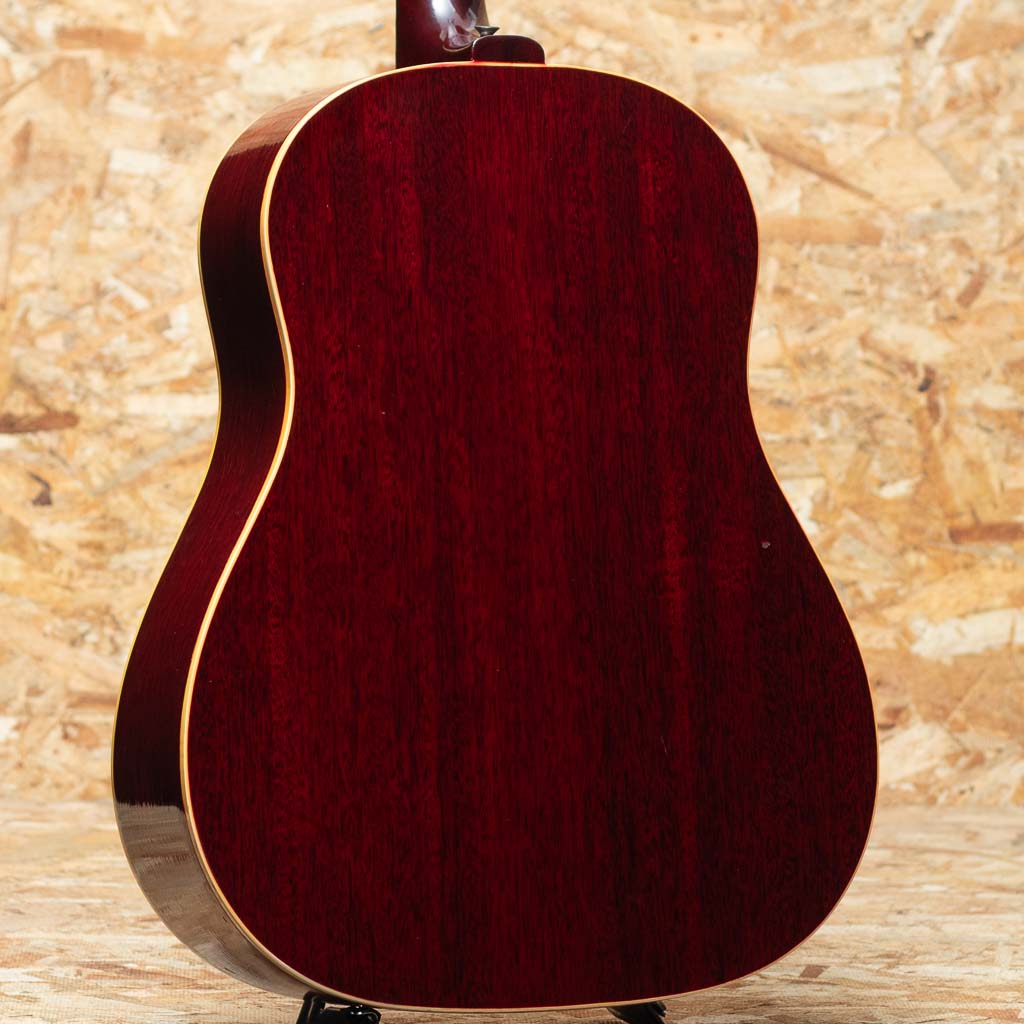 フラットトップにおけるもうひとつの憧れ、ワーキングホースGibson"J-45"。1942年に登場した"J-45"、その後幾つかのマイナーチェンジを繰り返しながらも、今尚トップシーンで欠かせないGibsonを代表するラウンドショルダーボディのジャンボモデル。本器は1967年に製造されたチェリーサンバーストカラーの1本。スプルーストップ、マホガニーサイド&バック、マホガニーネック、ハカランダ指板&ブリッジ、アジャスタブルサドル、オリジナルクルーソン3連ペグ、14度ヘッド角、ノンスキャロップドXブレイシング。ナローネック仕様による纏まりの良く小気味よいサウンド。ボディ全体にウェザーチェックが入っており、経年を経た良いルックスです。ボディにはいくつか打痕が見られる他、塗装のチップ、ボディバック面を中心に擦り傷が見られるなど年代相応の使用感がございます。過去にピックアップの取り付けがされており、ボディエンドにはジャックサイズの穴が空いた状態です。ペグは一度、同型のペグにネジ穴を埋めての交換がされておりますが、現在はオリジナルペグが取り付けられております。ネックヒールにはストラップピン取付済み。過去にナット交換を済ませており、演奏性は問題ございません。チェリーサンバーストの色味のきれいに残った一本。ハードケース付属。