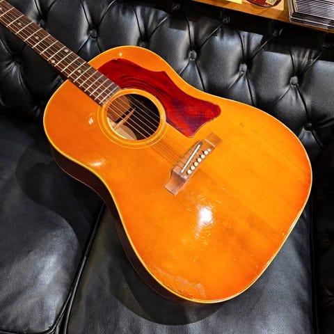 フラットトップにおけるもうひとつの憧れ、ワーキングホースGibson"J-45"。1942年に登場した"J-45"、その後幾つかのマイナーチェンジを繰り返しながらも、今尚トップシーンで欠かせないGibsonを代表するラウンドショルダーボディのジャンボモデル。1966年後半から1967年初めにかけては徐々にチェリーサンバーストの赤みが増しだす時期となりますが、本器はほぼナチュラルに近い風合いの薄手のチェリーサンバーストカラーの1本。スプルーストップ、マホガニーサイド&バック、マホガニーネック、ローズウッド指板&ブリッジ、クルーソン3連ペグは現行品にリプレイス、ノンスキャロップドXブレイシング。サドルはアジャスタブルサドルから埋木によりノーマルスロットサドルへと変更されております。ナローネックでまとまりが良く粘りのあるサウンド。曇りなくガランとしたヴィンテージギブソンならではの響きが小気味よく鳴ります。ボディトップ面下部の1弦側に木部のクラック跡が見られますが、こちらは裏からパッチを当て、きれいに修理がされております。ボディバック面下部のクラックは接着剤で補修済み。また、トップ6弦側下部に塗装の溶けたような痕とクラックの補修痕が見られるほか、全体的な打痕、ボディバック面くびれ部分に塗装の曇りが見られるなど、年代相応の使用感がございますが、ネック周りのコンディションは良好です。ネックヒールにストラップピンの増設と使い勝手の良いL.R.Baggs社のAnthemピックアップが後付けされており、ライン出力も可能な便利な仕様。ファンの方はピンとくる1966年製の1本。ハードケース付属です。