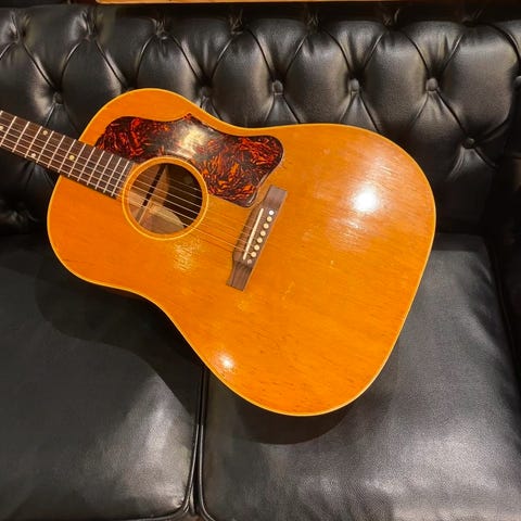 ギブソンフラットトップの顔、ワーキングホース"J-45"。ギブソンを代表する45と対をなす存在のナチュラルトップラウンドショルダーボディのジャンボモデルが本器”J-50"です。"J-45”を追う形で1947年に登場した”J-50”。本器は1956年製の1本。スプルーストップ、マホガニーサイド&バック、マホガニーネック、ハカランダ指板&ブリッジ、シングルリングロゼッタ、シングルライン3連クルーソンペグ(つまみは交換されています)、オリジナルラージピックガード、ノンスキャロップド・Xブレイシング。同時期よりオプションでADJサドル仕様の物もラインナップとして加わりましたが、本器はノーマルスロットサドル仕様。ファットながらノンスキャロップのためおさまりの良い低音でコントロールしやすくプロの現場でも定評のある時期です。泥臭いサウンドは、掻き鳴らせばロックに、爪弾けばノスタルジックに聴かせてくれます。ネックヒールにストラップピンの取付、過去にピックアップが取り付けられており、ジャック径のコンバージョンピンが取り付けられています。トップはセンター、センター右下側、ピックガードに沿ってのクラック補修があり、バックも複数箇所に大きめのクラック補修があり、左下側はクラックの補修と塗装の修正が行われています。クラック部は部分的に内側からも補強が当てられています。ネックコンディションは良く、プレイコンディションは良好で、使い込まれていた分、とても気持ちよく響いてくれます。全体的に歴戦を感じる使い込まれたいかにもビンテージらしい外観の1本。汎用ハードケース付属です。修理歴等詳細については、お気軽にお問い合わせください。