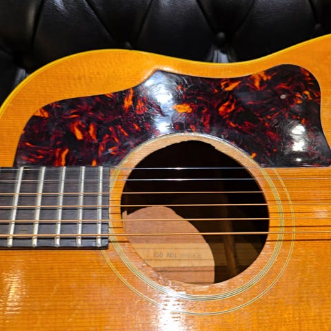 ・ピッキングによるサウンドホールの抉れ・ピックガード周辺のスクラッチ傷あり