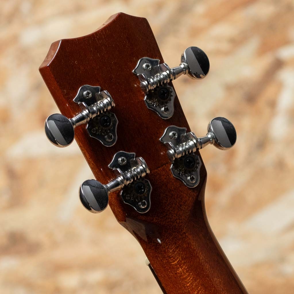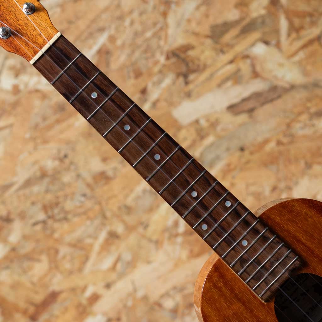 ハワイオワフ島のカネオヘに工房を構える”カニレア・ウクレレ”。1998年に社長のジョー氏と妻クリスティン氏により創業したブランドです。製作は少数精鋭。ブリッジピンによる弦止めや、3本ラインのファンブレイシングを独自に改良したTRUブレーシングの採用、ビッグギターメーカー”テイラー”社との技術情報共有によるUV塗装の導入など、最新技術とハンドメイド工法を交えた独自の製法にて生産されております。本器はコンサートサイズ・ロングネックモデルの”K-1 SC”。まろやかでクセが無く、飽きの来ない木目の個体です。ハワイアンコアウッドボディ、マホガニーネック、ローズウッド指板&ブリッジ、パウア貝指板ドット、オリジナルギアペグ、UVグロスフィニッシュ。トップ構造のTotal Resonating Ukuleleブレイシングにより、立体的で芯の強い基音、豊かなボリューム、個性的なサウンドが実現されています。ハイフレットの窮屈さも無く、伴奏からソロまで幅広くお使いいただける上等なハワイアンウクレレです。使用に伴う薄い打痕や擦り傷などは見受けられるものの、艶やかな雰囲気を損なうほどのダメージはなく、まだまだキレイな状態といえるでしょう。汎用ソフトケースが付属いたします。
