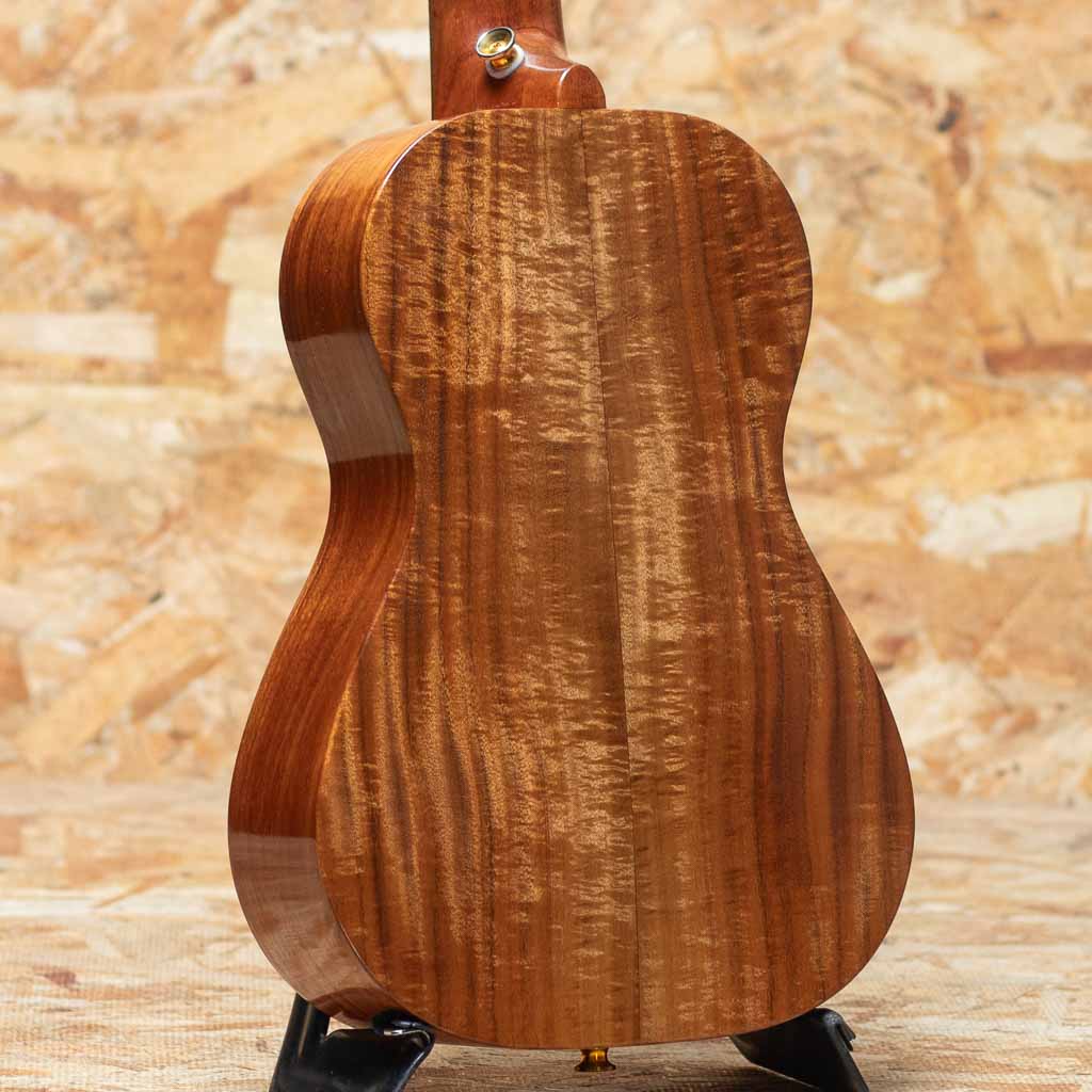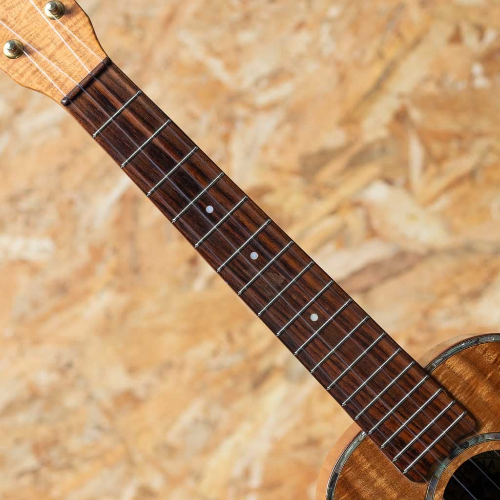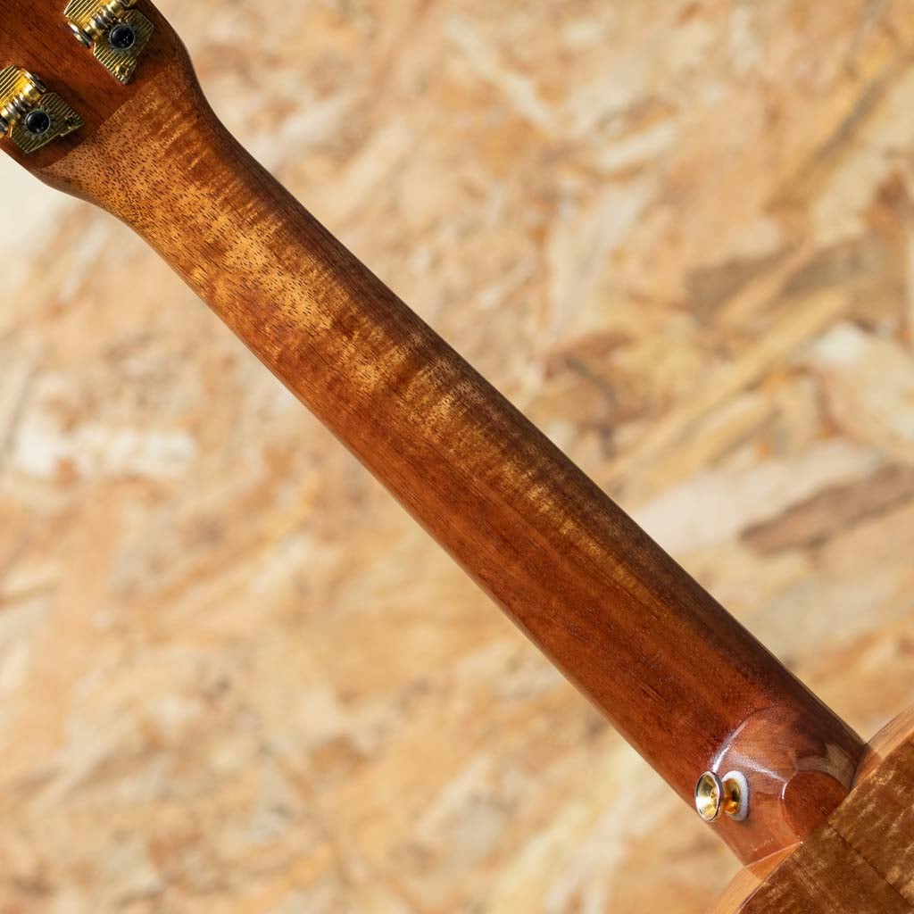 ハワイ・マカキロにてザック・カストロ氏により製作される”KA OHANA”。本器はボディ、ネック、指板、ブリッジをハワイアンコアにて製作されたオールコア仕様のテナーサイズ。ヘッドプレートにはメーカーロゴが入っておらず、より木目の良さが引き立つデザインです。また、オールコア仕様に加えサウンドホールのアバロンロゼッタ、トップのアバロントリムと非常に贅沢な作りとなっております。経年による金属パーツのくすみや薄い小キズなどはあるものの、まだまだきれいな状態を保っており、演奏性も良好です。オールコア仕様ならではの明るくもどこか素朴な甘い音色を楽しめる一本です。ライトケースが付属いたします。
