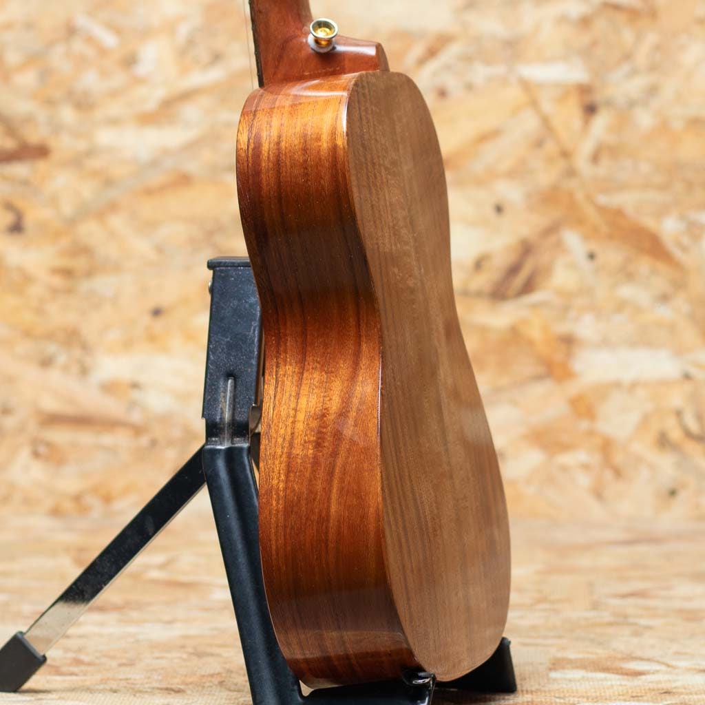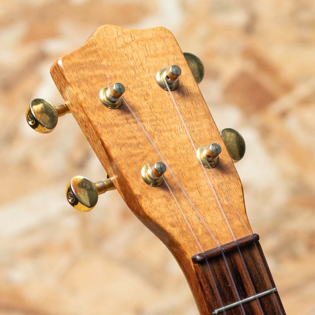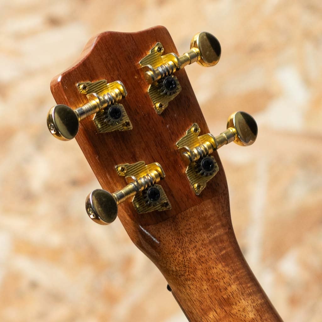 ハワイ・マカキロにてザック・カストロ氏により製作される”KA OHANA”。本器はボディ、ネック、指板、ブリッジをハワイアンコアにて製作されたオールコア仕様のテナーサイズ。ヘッドプレートにはメーカーロゴが入っておらず、より木目の良さが引き立つデザインです。また、オールコア仕様に加えサウンドホールのアバロンロゼッタ、トップのアバロントリムと非常に贅沢な作りとなっております。経年による金属パーツのくすみや薄い小キズなどはあるものの、まだまだきれいな状態を保っており、演奏性も良好です。オールコア仕様ならではの明るくもどこか素朴な甘い音色を楽しめる一本です。ライトケースが付属いたします。
