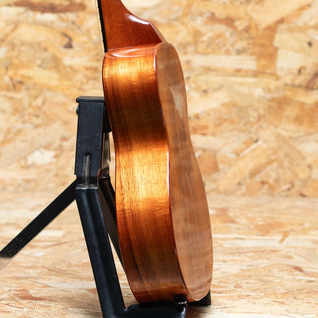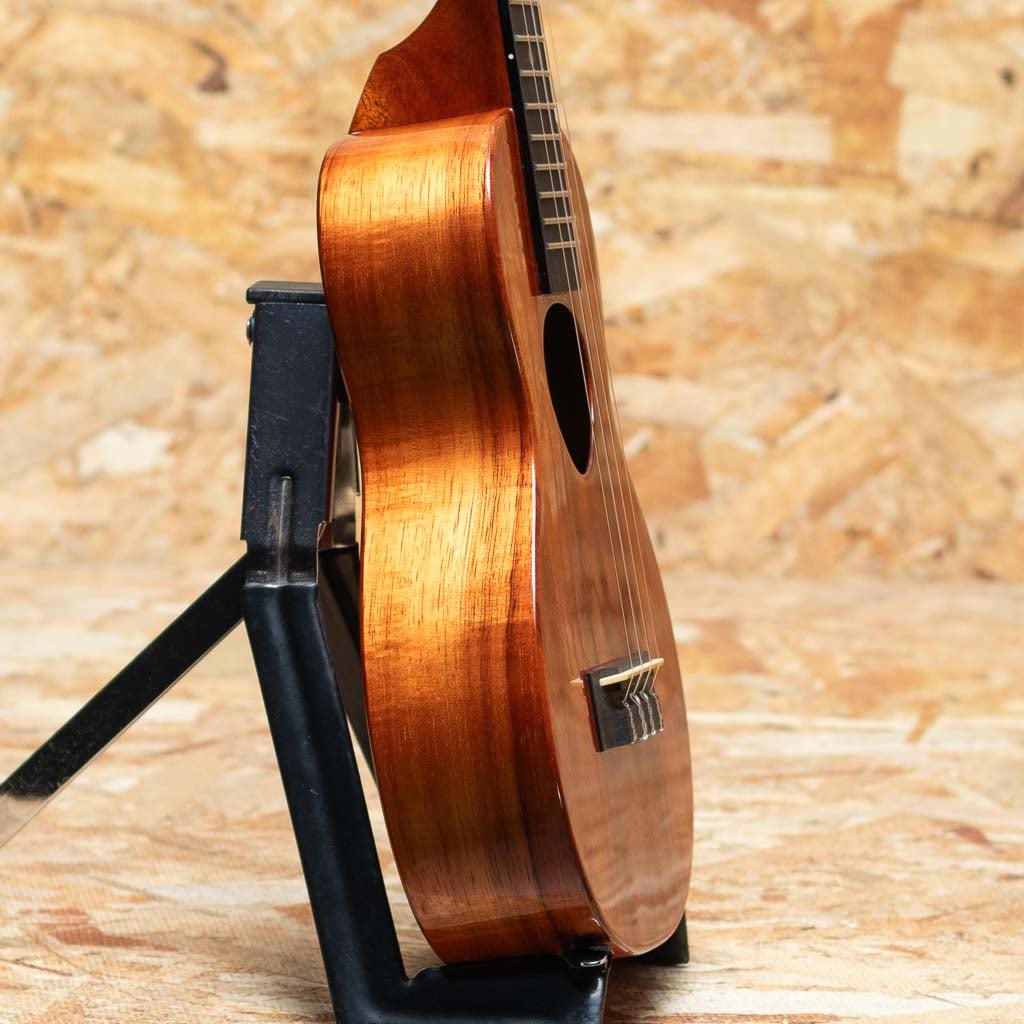 アルヴィン・オカミにより1995年に創設されたコアロハ・ウクレレ。現在は長男で社長のアランと、次男で副社長のポールを中心に、少数精鋭にて運営されております。今ではハワイを代表するウクレレメーカーの一つとなったコアロハ。モダンなルックスデザイン、優れた演奏性で、他のメーカーにはないハイファイでクリア、そしてなんと言っても大きな音量が特徴。本器はコンサートスタンダードモデル”KCM-00”2022年製のUSED品。ハワイアンコアボディ、マホガニーネック、エボニー指板&ブリッジ、ギアペグ仕様。ごく僅かな塗装ムラが見られる程度で使用感は特に感じられず、とてもきれいな状態が保たれています。コンサートサイズで演奏の幅も広く、様々なジャンルに対応可能なモデル。オリジナルハードケースが付属します。