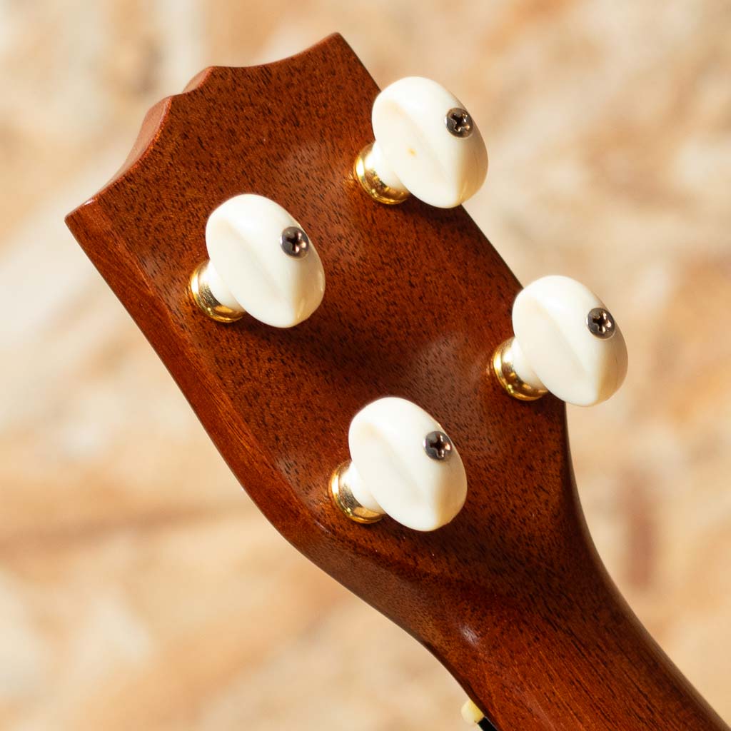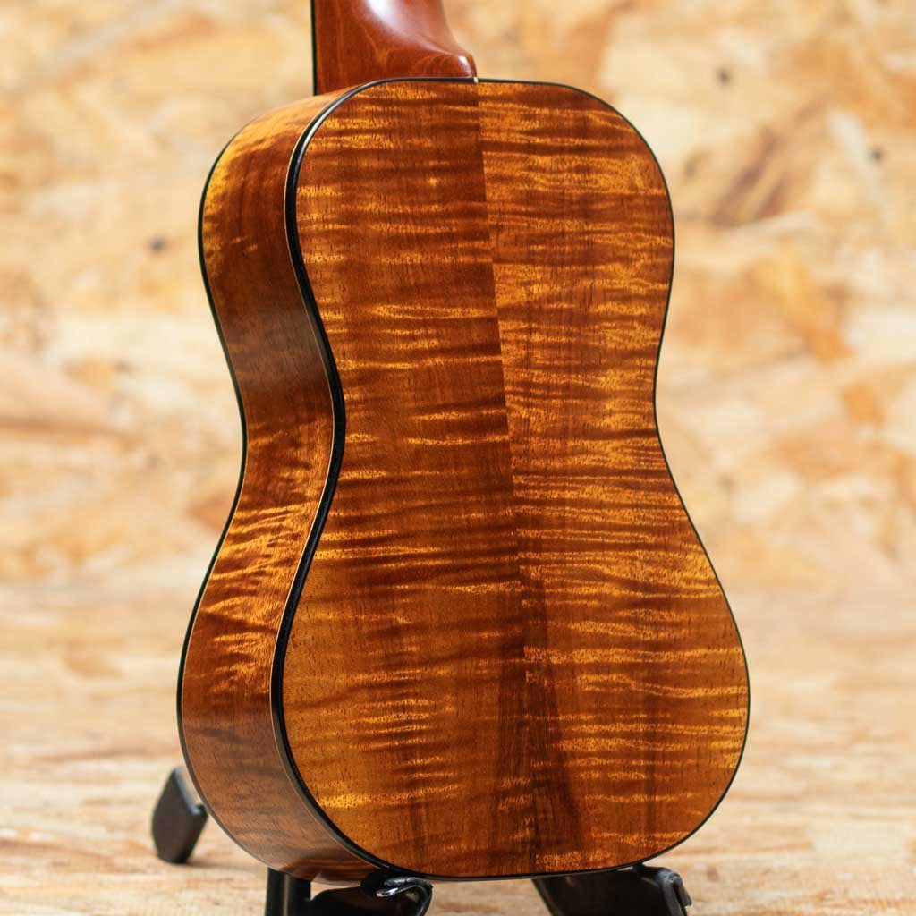 国産スチールギターブランドとして名を馳せた”Canopus/カノウプス”。ウクレレに関してはOEM製作にて”Sonny D/サニーディー”や”I'iwi/イーヴィー”など、本場ハワイの製作家が手掛けておりました。こちらはI'iwi製の1本。ハワイ・オアフ島にて”チャーリー・フクバ”氏が手掛ける、I'iwi ウクレレは年間わずかな本数のみ製作され、そのサウンドクオリティに惚れ込むファンは数多。”Canopus/カノウプス”ブランド自体は2016年に製造を終了しているため、本器は希少なモデルと言えるでしょう。オールハワイアンコアボディのソプラノモデル。1Pマホガニーネック、エボニー指板&ブリッジ、フリクションゴールドペグ。トップ、サイド、バック面とヘッドの突板には杢の出た美しいコア材が使用されており、ロゼッタと指板のMOPインレイと相まってなんともエレガントなルックスに仕上げられています。ハワイアンコア特有の甘味の強いトーンで、弾けば弾く程味わいが増すような、ともて美しい音色。全体的に薄い小キズなどが見られる程度で、大きく目立った外傷やリペア歴はございません。サドルは弦高調整のため、やや低い状態にセットアップされています。ハワイ製の通なウクレレ。是非お手元に。汎用ハードケースが付属いたします。