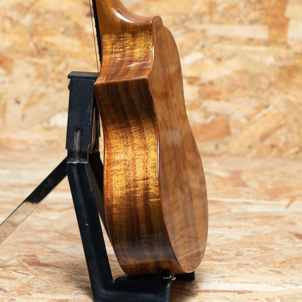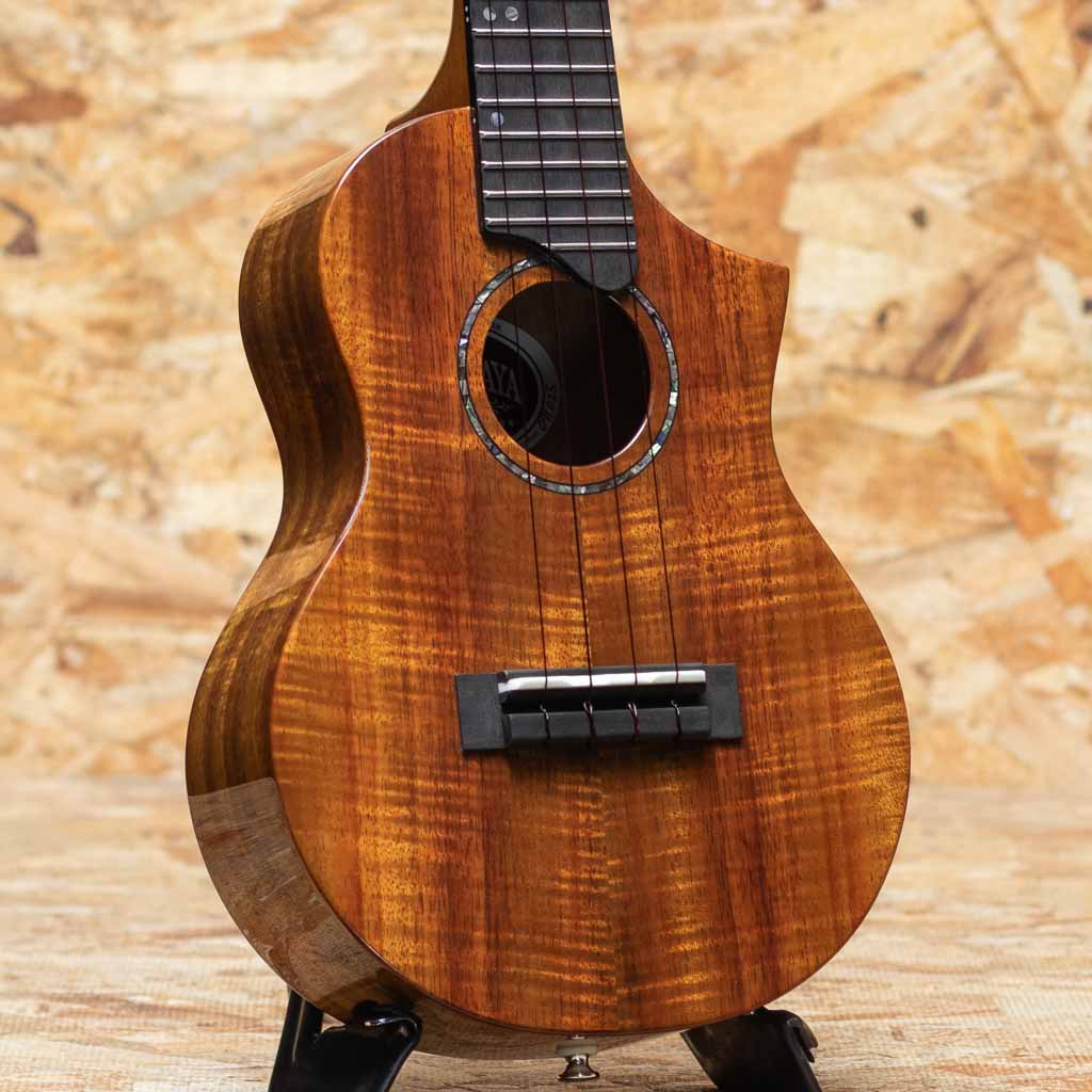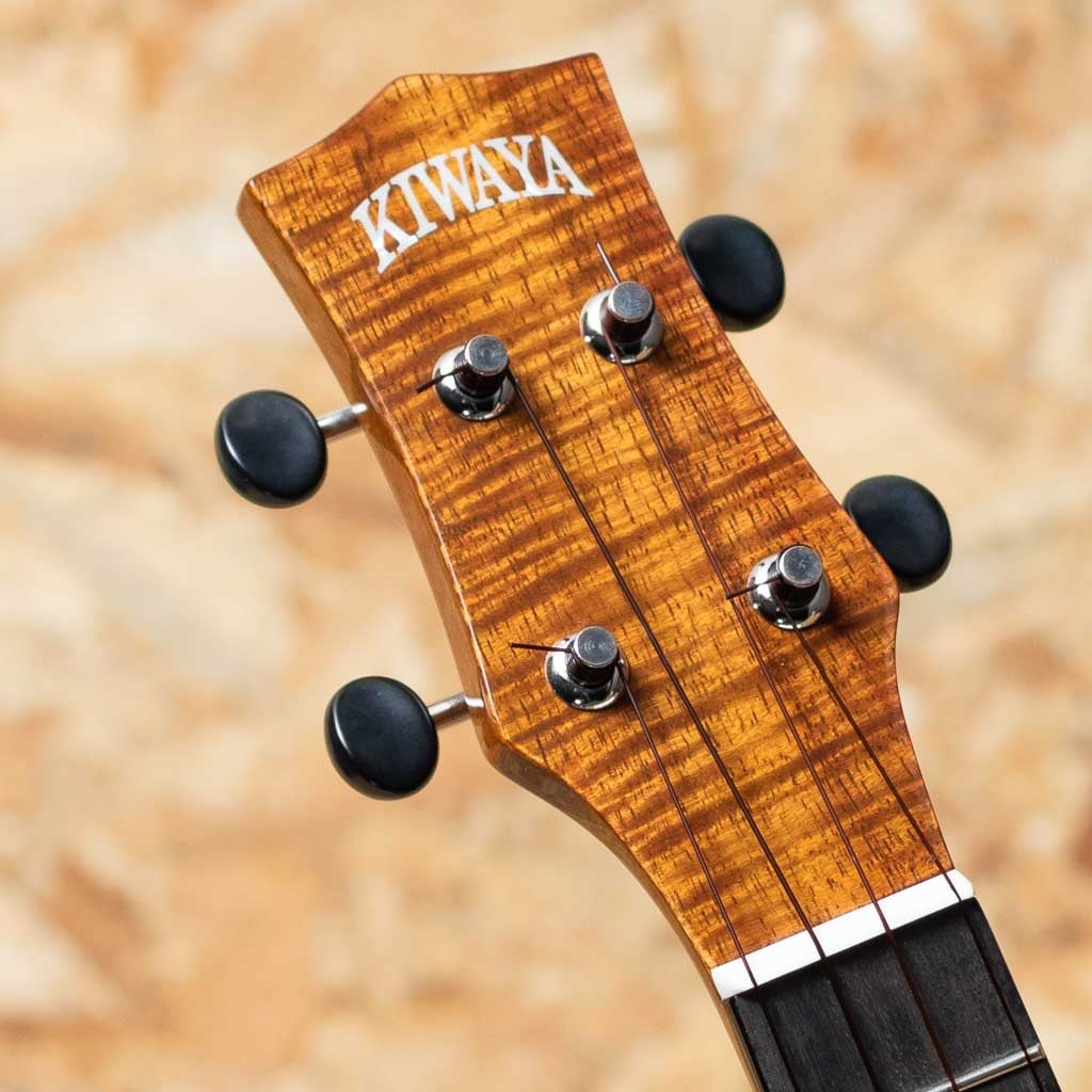 1919年創業、世界的にも認められるウクレレ総合カンパニー”キワヤ商会”。そのキワヤ商会が展開している多くのブランドの中で、社名がブランド名となっている国産品、それが”KIWAYA”です。本器は本器は"サウンドメッセ2025"にて出展された限定モデル"KPC-3K/C"。きれいな杢のハワイアンコアボディ、アフリカンマホガニーネック、エボニー指板&ブリッジ、アバロンロゼッタ、カッタウェイ仕様。ハワイアンコアらしく甘く優しい音色で、バランスに優れた1本。少し肉厚なネック、やや太めのオリジナルフレットを採用しており、優しく押さえてもしっかりと安定したサウンドが奏でられます。カッタウェイでハイポジションの演奏性も良く、ソロウクレレにも最適です。生産2本のみの限定品!ライトケースが付属です。