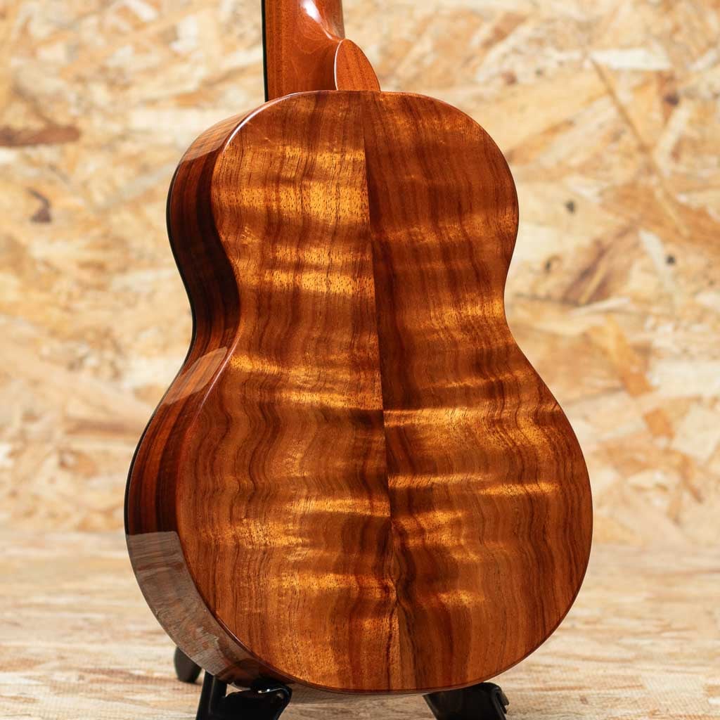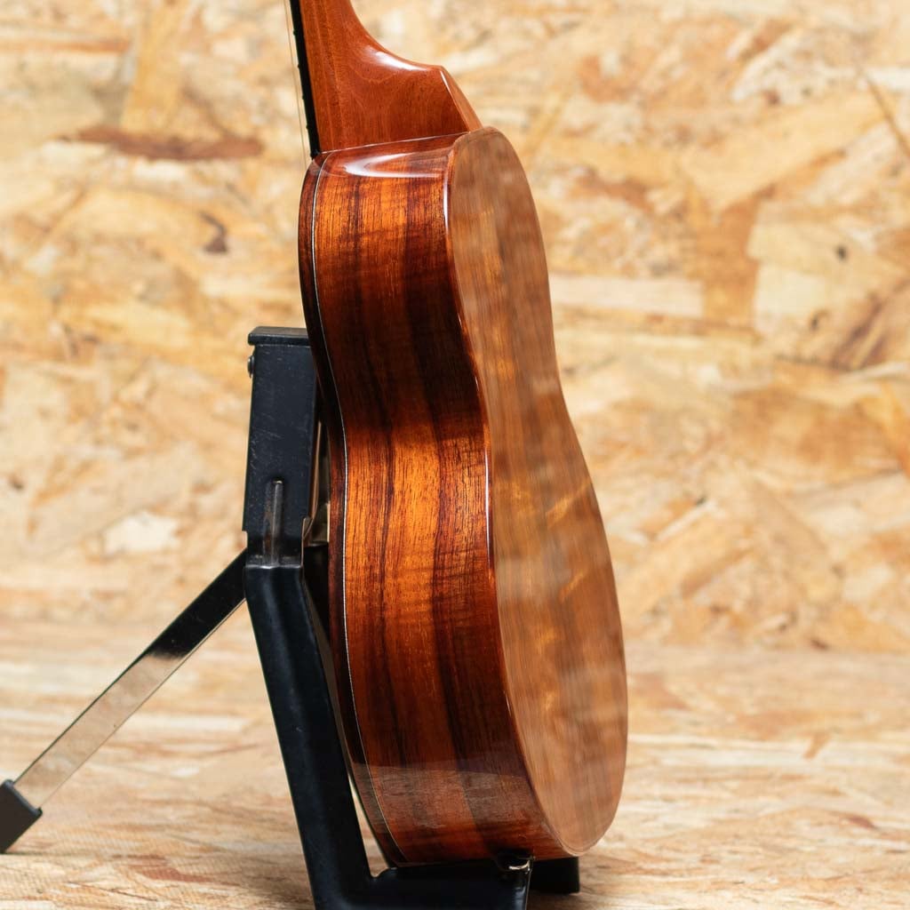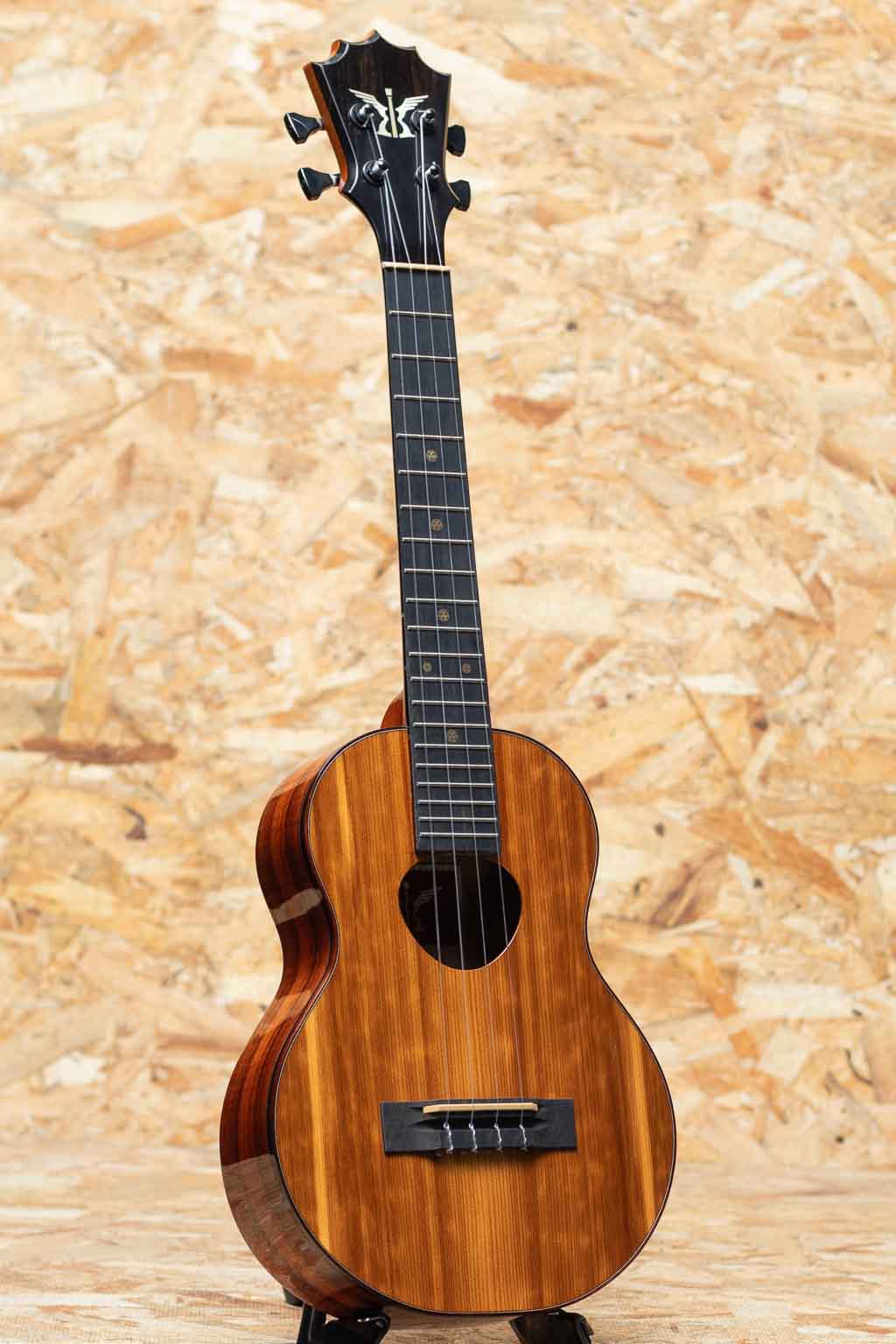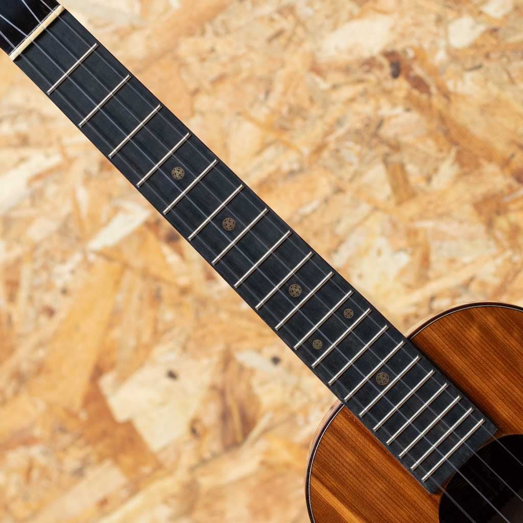 アルヴィン・オカミにより1995年に創設されたコアロハ・ウクレレ。現在は長男のアランと、次男のポールを中心に少数精鋭の職人たちで運営されております。今ではハワイを代表するウクレレメーカーの一つとなったコアロハ。本器は非常に流通の少ないレッドレーベルモデルのテナーサイズ。いわゆるカスタム品で、熟練の職人のみが携わって製作されております。こちらは" '21-'22 Winter "の限定モデルのUSED品。シダートップ、ハワイアンコアサイド&バック仕様の1本。マホガニーネック、エボニー指板&ブリッジ、銅板のデザインの指板インレイ、軽量のヒップショット製ギヤペグ搭載。ヘッドにはアバロンにてカスタムロゴ(コアロハウイングインレイ)、ボディ内側のラベルには特別にウッドのレッドラベルが施されております。そして何より内部の木工が特殊で、通常のモデルで使用されている輪型のブレーシング”ユニブレース”は用いられておらず、トップとバックに独立したセミカスタムブレーシングが採用されており、そのおかげでサウンド面も別格。輪郭も立ち、音量も豊かで、従来のモデルに比べ重厚さもあり、劇的なサウンドの違いを感じることができます。軽微な小傷や打痕は見られますが、全体的にはきれいなコンディションが保たれています。シダートップでコアモデルとは違ったサウンドが味わえる特別な1本。オリジナルハードケース付属です。