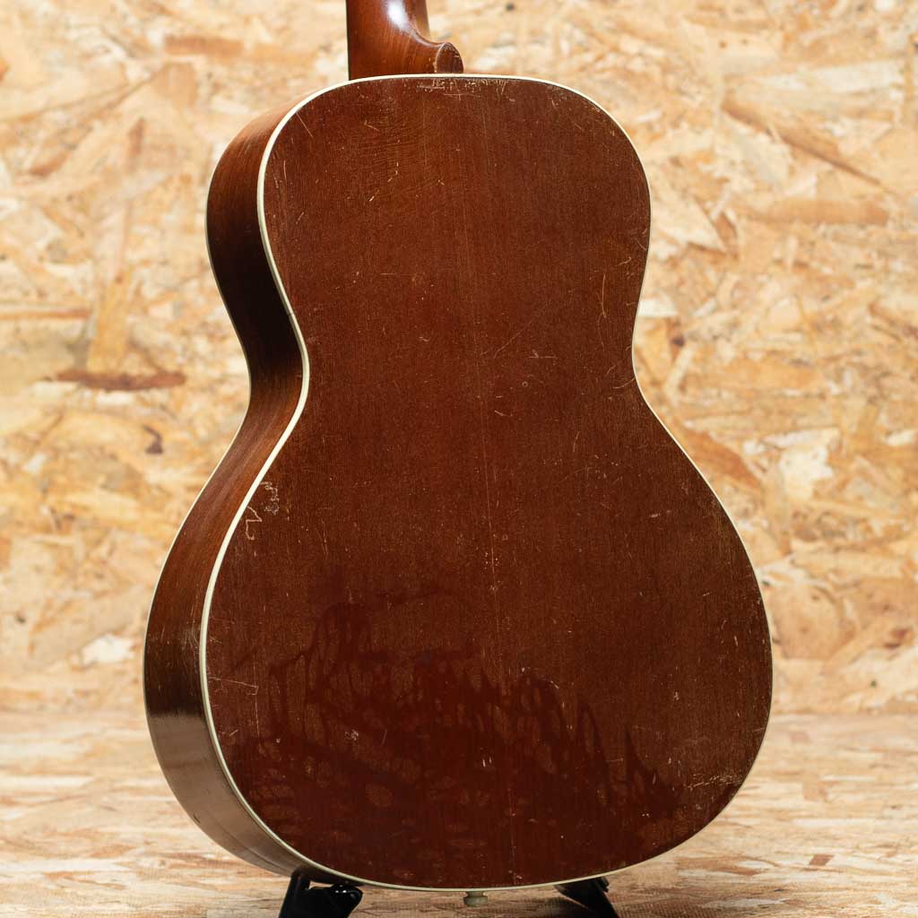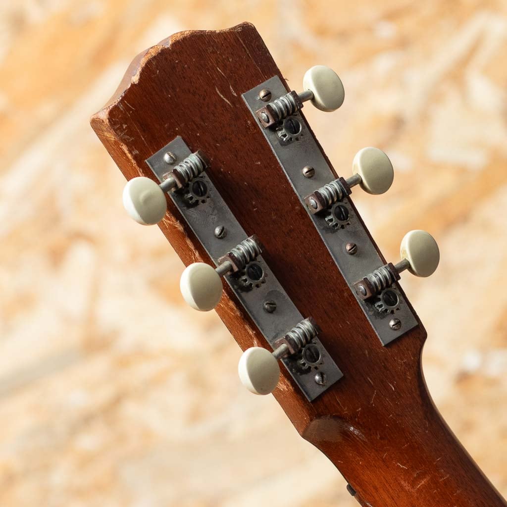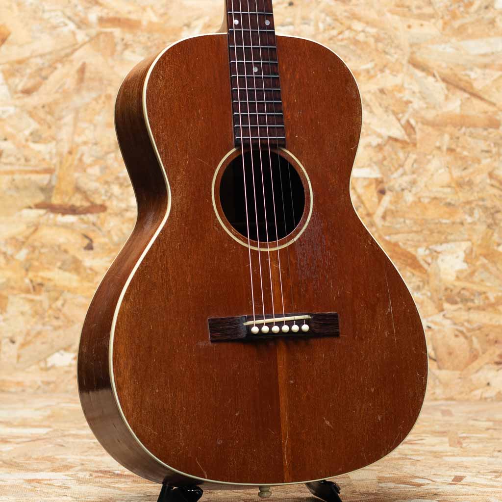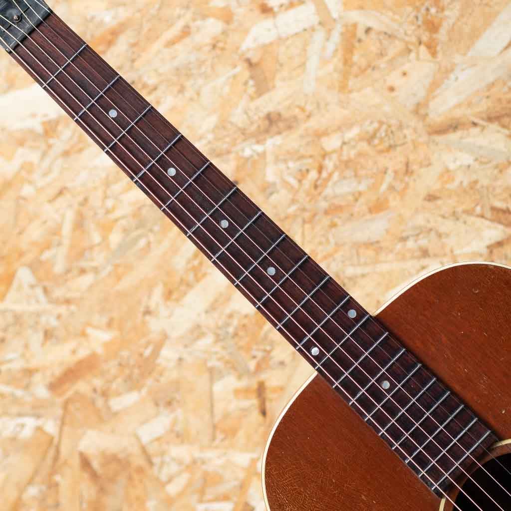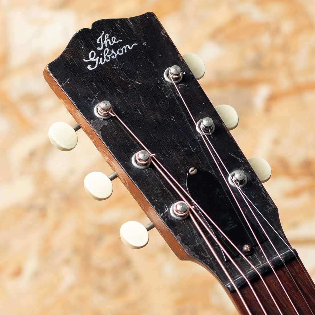 アコースティック・アーチトップに端を発する、ギブソンLシリーズ。本器は、12フレットジョイント、レクタンギュラーブリッジ、14.75インチ幅のオールマホガニーボディを採用した、1930年・1931年の2年間のみ存在したレアスペックの一本です。オールマホガニートップならではの柔らかなアタック感が心地よく響き、経年によるドライな抜け感も非常に魅力的です。12フレットジョイントのオールマホガニーボディというと、音像がややぼやけがちな印象もありますが、本器は戦前ギブソンらしいタイトな造作により、ルーズさを感じさせない絶妙なトーンバランスに仕上がっています。状態につきましては、4弦ペグのシャフトに若干の曲がりが見られますが、現状問題なくご使用いただけます。表板の割れ修正や部分的な塗装の補修痕は見られますが、雰囲気を損なうものではなく、ビンテージらしい味のある外観です。ネック調整・サドル調整は可能な範囲でギリギリまでおこなっており、トラスロッドの余裕も残りわずかです。弦高はやや高めの状態ではありますが、プレイスタイルによっては好みに合うセッティングかもしれません。戦前ギブソンならではの味わいと、短期間のみ製作された希少スペックを併せ持つ、魅力的なヴィンテージ品。チップボードケース付属です。