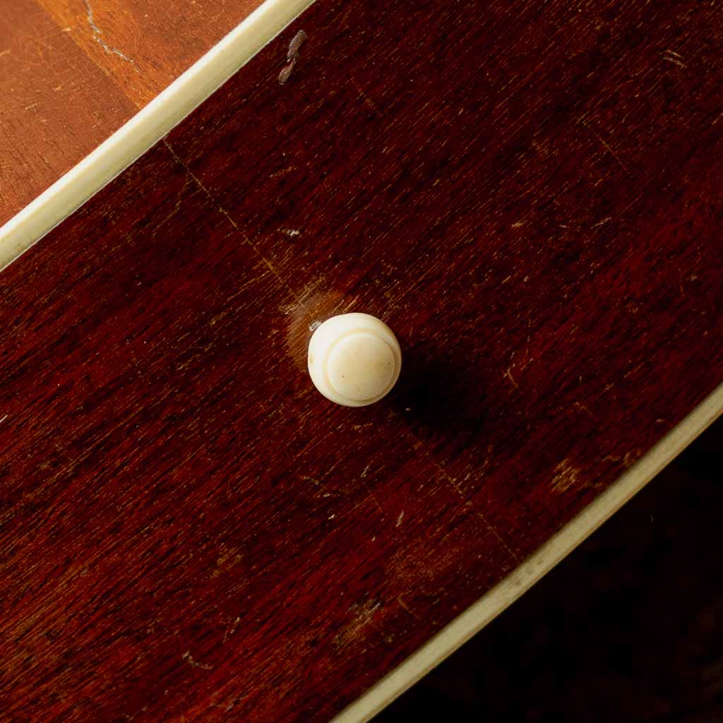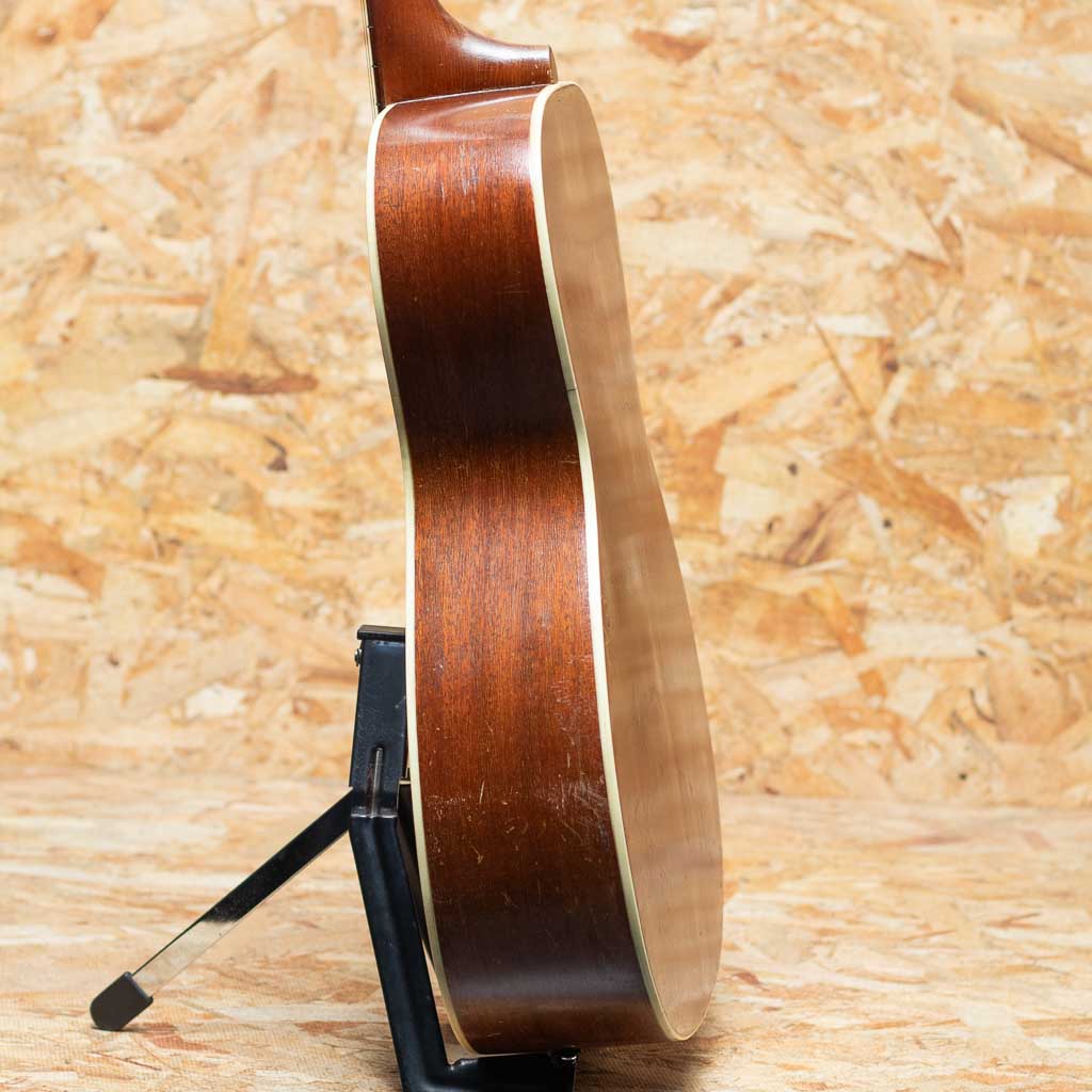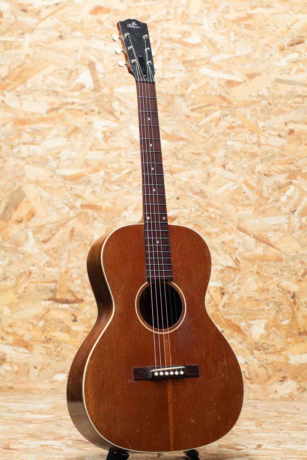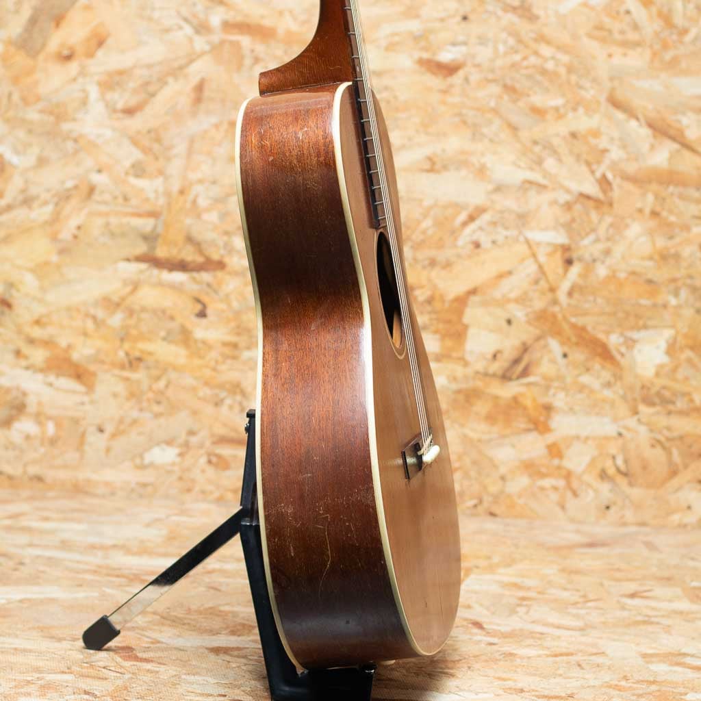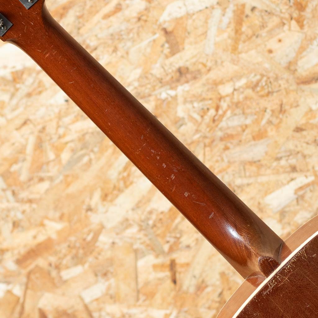 アコースティック・アーチトップに端を発する、ギブソンLシリーズ。本器は、12フレットジョイント、レクタンギュラーブリッジ、14.75インチ幅のオールマホガニーボディを採用した、1930年・1931年の2年間のみ存在したレアスペックの一本です。オールマホガニートップならではの柔らかなアタック感が心地よく響き、経年によるドライな抜け感も非常に魅力的です。12フレットジョイントのオールマホガニーボディというと、音像がややぼやけがちな印象もありますが、本器は戦前ギブソンらしいタイトな造作により、ルーズさを感じさせない絶妙なトーンバランスに仕上がっています。状態につきましては、4弦ペグのシャフトに若干の曲がりが見られますが、現状問題なくご使用いただけます。表板の割れ修正や部分的な塗装の補修痕は見られますが、雰囲気を損なうものではなく、ビンテージらしい味のある外観です。ネック調整・サドル調整は可能な範囲でギリギリまでおこなっており、トラスロッドの余裕も残りわずかです。弦高はやや高めの状態ではありますが、プレイスタイルによっては好みに合うセッティングかもしれません。戦前ギブソンならではの味わいと、短期間のみ製作された希少スペックを併せ持つ、魅力的なヴィンテージ品。チップボードケース付属です。