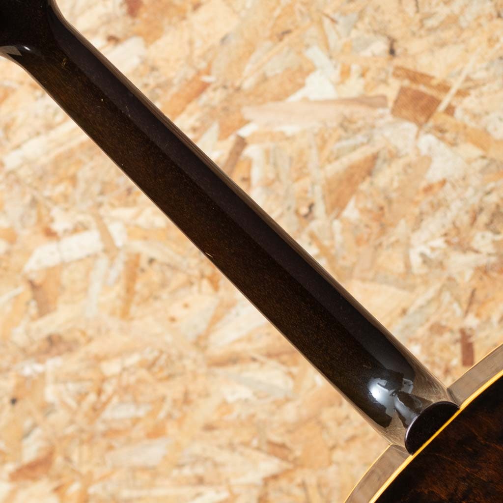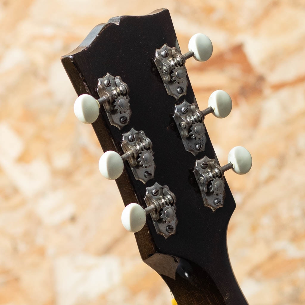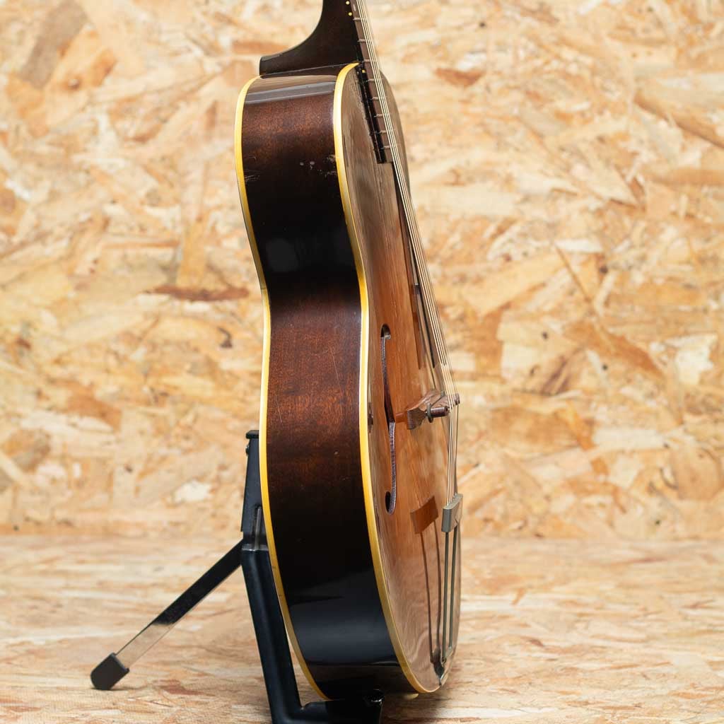 1932年の発売開始以来、L-30,L-48などとともに人気の高いビンテージアコースティックアーチトップL-50。幾度となく仕様変更がされてきました。誕生から1950年頃までの間はめまぐるしく仕様変更が施され、ボディ、ホールのサイズや形状、ピックガードの仕様に至るまで、その年々で様々なスタイルが存在します。こちらは仕様から1946年頃の個体と思われます。スプルーストップ、メイプルサイド&バック、マホガニーネック、ハカランダ指板&ブリッジ、パーロイド指板ドット、1プライバインディング、スクリプトロゴ、べっこう柄ピックガード、オープンバックペグ。ドライかつ骨太なサウンドで弾きごたえ抜群。ブルースやスイングジャズにはもってこいで、一味加えたフォークなどにも相性の良いスモーキーなサウンドです。割れなどは見られず、薄っすら飴色に焼けたバインディングや薄っすらと細かく入ったウェザーチェックなど大切に使用されていたことが伺えるきれいなグッドコンディションのビンテージ品です。汎用ハードケースが付属します。