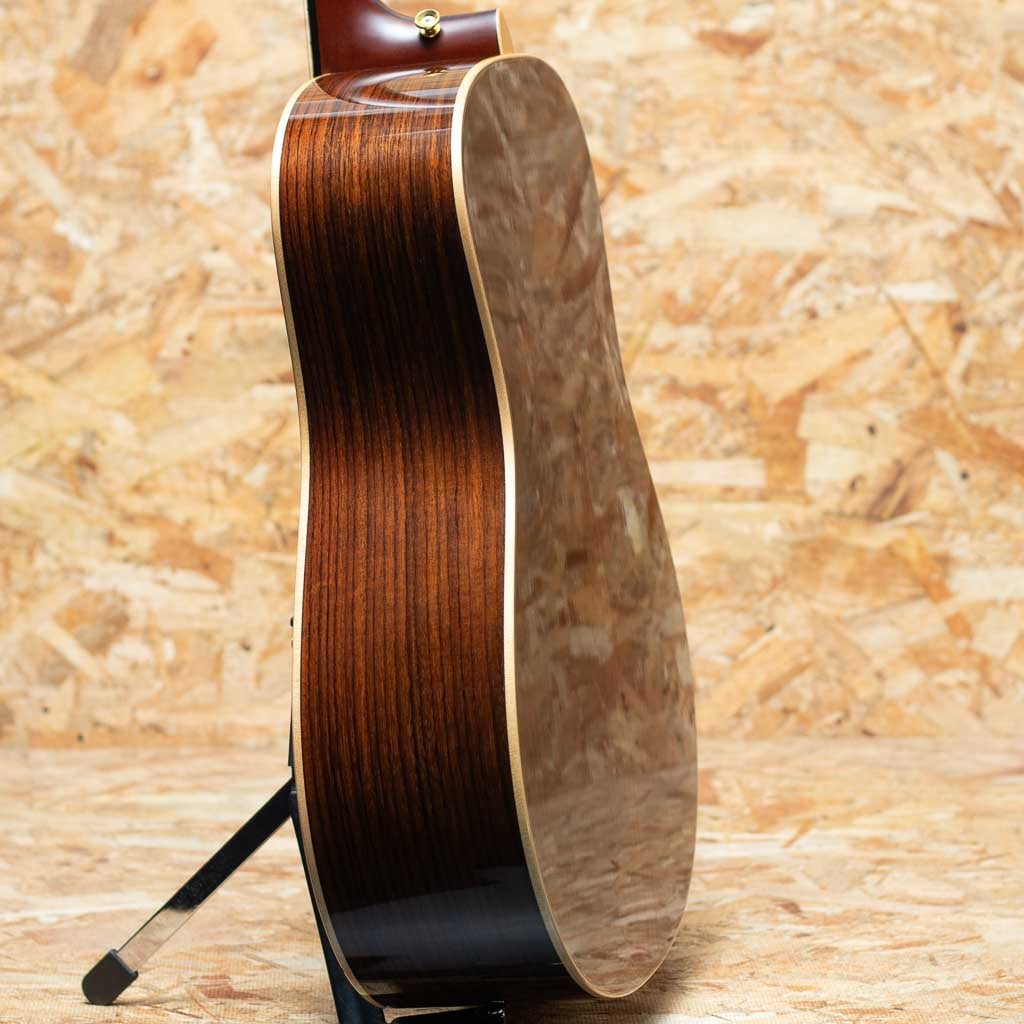 ヤマハを代表するギターとして、数多くの一流アーティストをはじめ、多くのギターファンに愛されてきたLシリーズ。“FG”シリーズの上位機種として1974年にL-31を発表して以来、時代のミュージックシーンを彩り、数多くのアーティ ストやギターファンに愛され、日本の音楽シーンを支えて参りました。"L=Luxury(豪華)"を冠にした本シリーズは、常にベストサウンドを追及してきたヤマハギターの歴史が生み出した結晶とも言えるシリーズです。本器はオリジナルジャンボボディモデルの"LL26 ARE"。製造継続が困難となり、惜しまれつつも生産完了したモデルです。ARE処理を施したイングルマンスプルーストップ材に、裏側板はインドローズ単板を使用。ゴールドパーツペグ"SD-700XG"、ウッドバインディングを採用し、落ち着きのあるヴィンテージテイストの仕上りとなっています。ヘッド角にやや塗装の浮きが見られる他、打痕や擦りキズ、ボディのバインディングに1ヶ所塗装のチップが見られますがクラック等の大きなダメージは見られません。ローポジションのフレットにやや減りが見られますが、ネックの状態は良好です。ネックヒールにストラップピン増設済み。開放的で成熟したサウンドと深いサスティン、抜群のレスポンスを備えたモデルです。オリジナルハードケース付属。