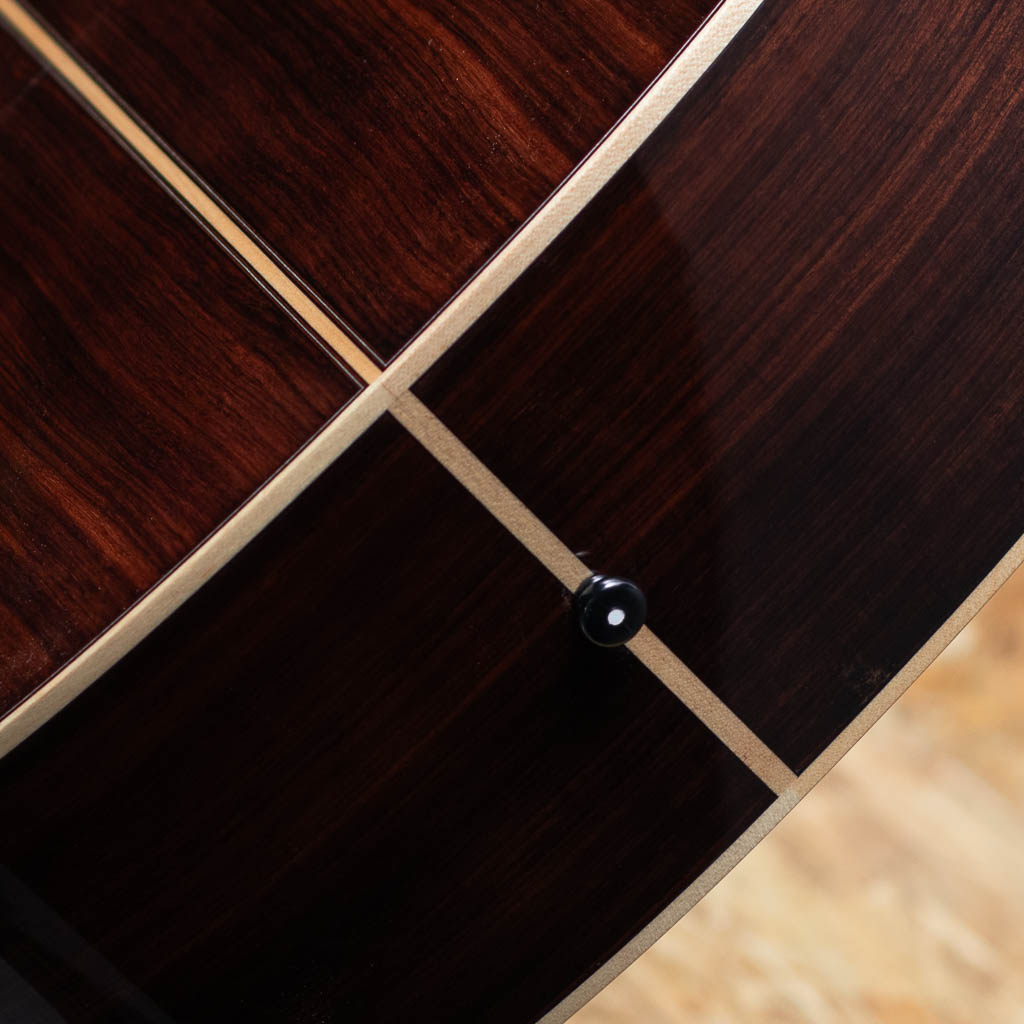その美しい意匠との調和を追求し、ヘッドのYAMAHAロゴは通常のアバロン貝ではなく、上品な白蝶貝を使用。さらに、指板インレイを排することで、全体のデザインに統一感と静謐さをもたらしています。