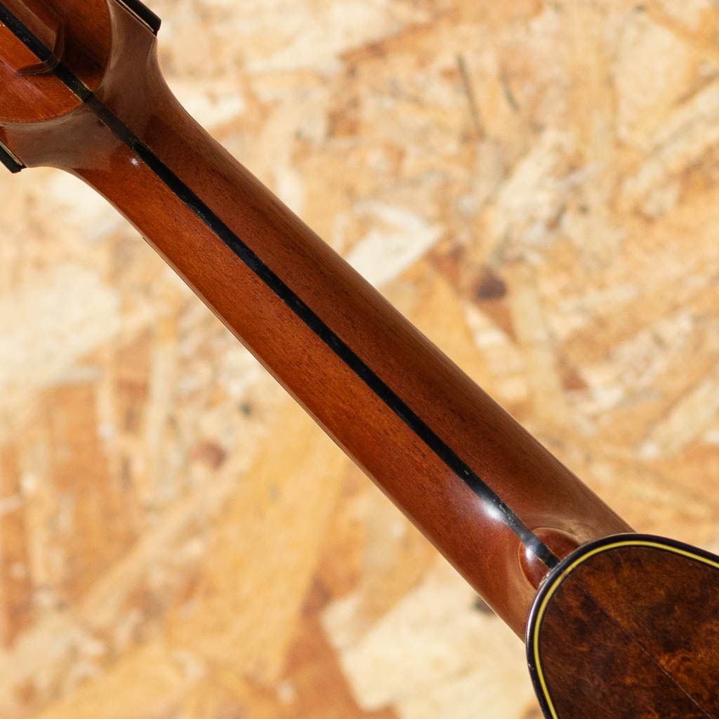 削り出しによるアーチトップ、アーチバック構造を採用し、トップには上質なスプルース、バック&サイドには杢の美しいバーズアイメイプル材を使用。ネックはマホガニー、指板・ブリッジにはエボニーを用いた当時の高級機ならではの贅沢な仕様となっています。左右非対称のポイントを持つAスタイルボディ、Lyon & Healy 特有のスクロールヘッド、刻印入りオリジナルテールピース、大型ピックガードなど1920年代初頭の Style Aに見られる特徴を備えた個体です。全体に一度リフィニッシュされておりますがリフィニッシュしてからの時間が随分経つのか塗装のヒケや細かな使用キズなども見られ、不自然さを感じさせない状態です。ネックコンディションも問題なく演奏製も良好。バック上部のセンターシームは過去にクラック補修をされていますが丁寧な仕事で仕上げられています。