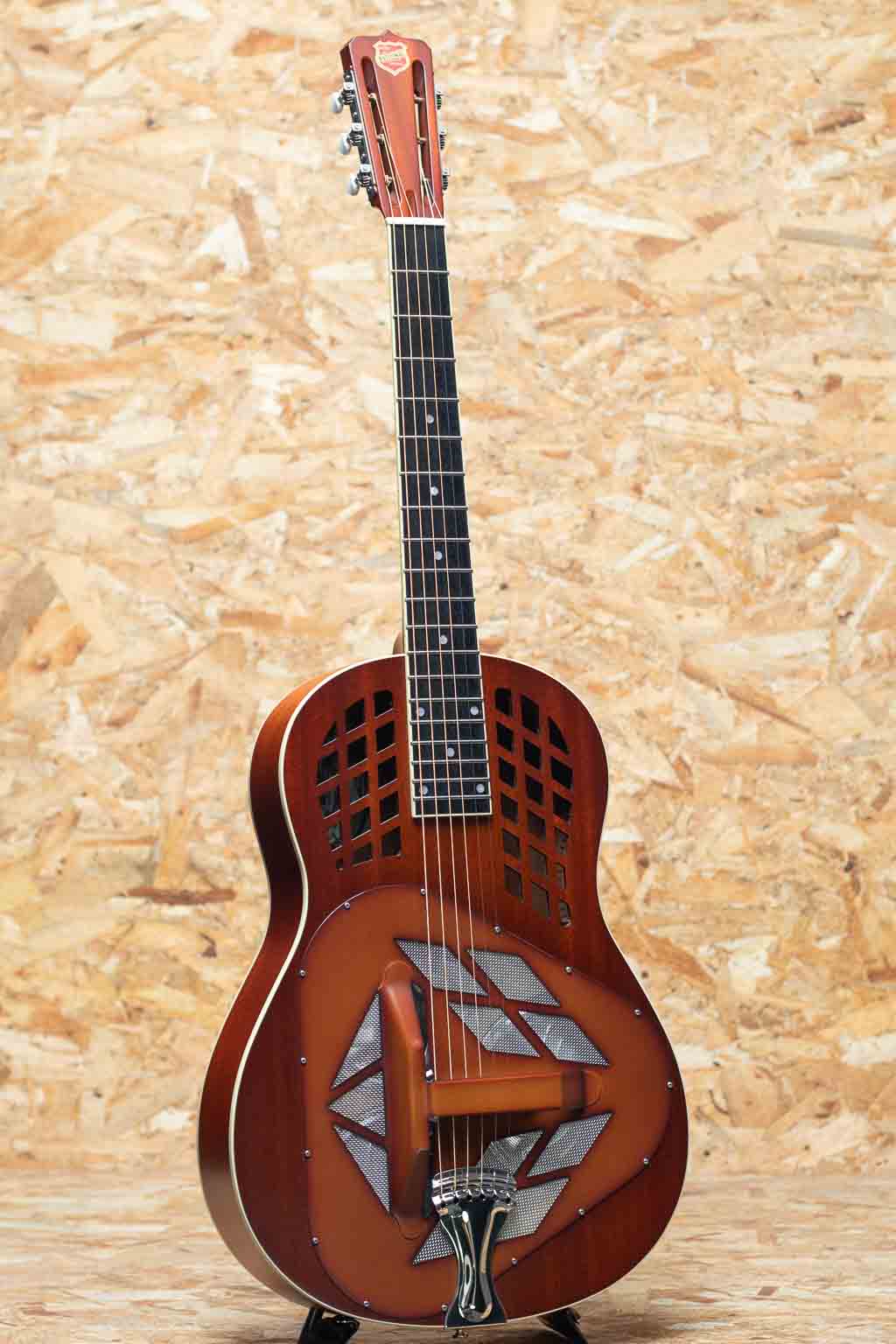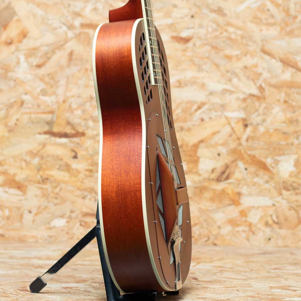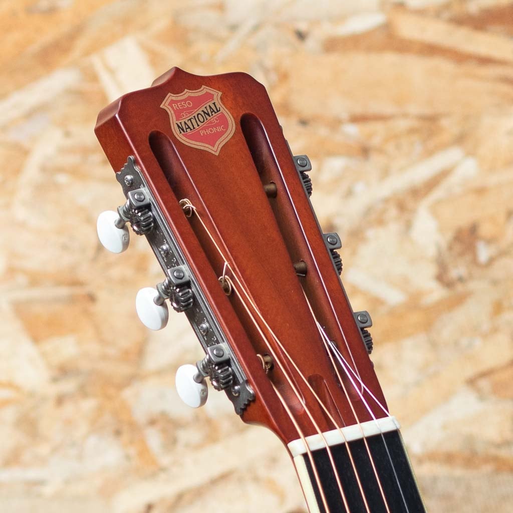 リゾネーターメーカーとしては最も認知度の高い"National"。ナショナルギター社は四十年代に一度倒産してしまいましたが、1988年にナショナル・リゾフォニック・ギターズとして復活し、現在も人気のあるブランドです。本器は伝統的なトライコーンのデザインに長年の研究を経て開発されたマホガニーボディを採用した"M1 Tricone"2021年製使用感極薄USED品。マホガニーボディ、マホガニーネック、エボニー指板、T-ブリッジ、刻印入りオリジナルペグ、パール指板ドットインレイ、トライコーン、ネックストラップピン搭載。大きな音量を出すことを目的とし、ボディの中へ共鳴板を組み込んだ構造。よく見られるシングルコーンに比べ、やや音量は劣るものの独特な甘さを持ち、ハワイアンサウンドなどでよく聴かれるような心地よい優しいトーンを奏でます。また本器はボディにラミネートマホガニーを採用、一般的なメタルボディに比べ約3ポンド(約1.4kg程)軽量化されております。しかし、リゾネーターギターらしいラウドなサウンドはそのままに演奏性の高められたスタイルです。ネックシェイプは緩やかなVシェイプネック、ボトルネック奏法はもちろんのこと、ストロークやフィンガープレイにも対応できるラウンドネック、デュオやアンサンブル編成にアコースティックサウンドのアクセントとしてお使いいただくのもいかがでしょうか。ハンドペイントされたスチール製カバープレートの風合いもグッドです。高音弦ローポジションに僅かなフレットの摩耗、その他金属パーツに若干のくすみが見られますが、演奏に支障はなくプレイアビリティはしっかりと整えられています。国内流通はほぼ見られない希少なモデル。ブルース、ハワイアン、ジャズ、カントリーなど多彩なジャンルで活躍の期待できる1本です。オリジナルハードケース付属。