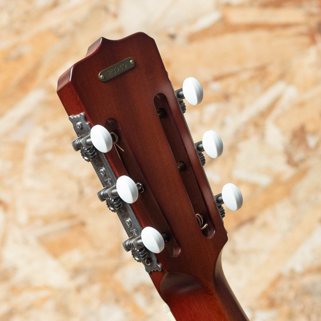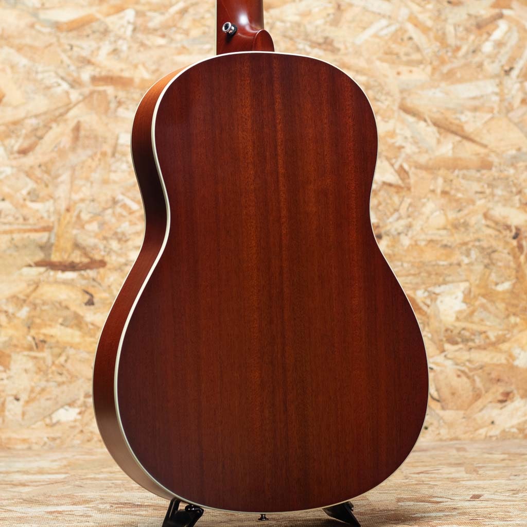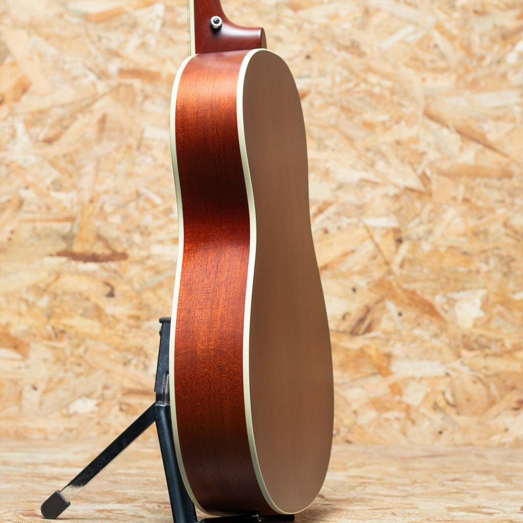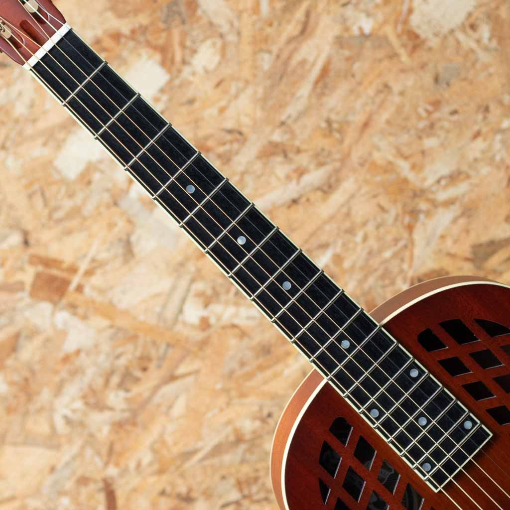リゾネーターメーカーとしては最も認知度の高い"National"。ナショナルギター社は四十年代に一度倒産してしまいましたが、1988年にナショナル・リゾフォニック・ギターズとして復活し、現在も人気のあるブランドです。本器は伝統的なトライコーンのデザインに長年の研究を経て開発されたマホガニーボディを採用した"M1 Tricone"2021年製使用感極薄USED品。マホガニーボディ、マホガニーネック、エボニー指板、T-ブリッジ、刻印入りオリジナルペグ、パール指板ドットインレイ、トライコーン、ネックストラップピン搭載。大きな音量を出すことを目的とし、ボディの中へ共鳴板を組み込んだ構造。よく見られるシングルコーンに比べ、やや音量は劣るものの独特な甘さを持ち、ハワイアンサウンドなどでよく聴かれるような心地よい優しいトーンを奏でます。また本器はボディにラミネートマホガニーを採用、一般的なメタルボディに比べ約3ポンド(約1.4kg程)軽量化されております。しかし、リゾネーターギターらしいラウドなサウンドはそのままに演奏性の高められたスタイルです。ネックシェイプは緩やかなVシェイプネック、ボトルネック奏法はもちろんのこと、ストロークやフィンガープレイにも対応できるラウンドネック、デュオやアンサンブル編成にアコースティックサウンドのアクセントとしてお使いいただくのもいかがでしょうか。ハンドペイントされたスチール製カバープレートの風合いもグッドです。高音弦ローポジションに僅かなフレットの摩耗、その他金属パーツに若干のくすみが見られますが、演奏に支障はなくプレイアビリティはしっかりと整えられています。国内流通はほぼ見られない希少なモデル。ブルース、ハワイアン、ジャズ、カントリーなど多彩なジャンルで活躍の期待できる1本です。オリジナルハードケース付属。